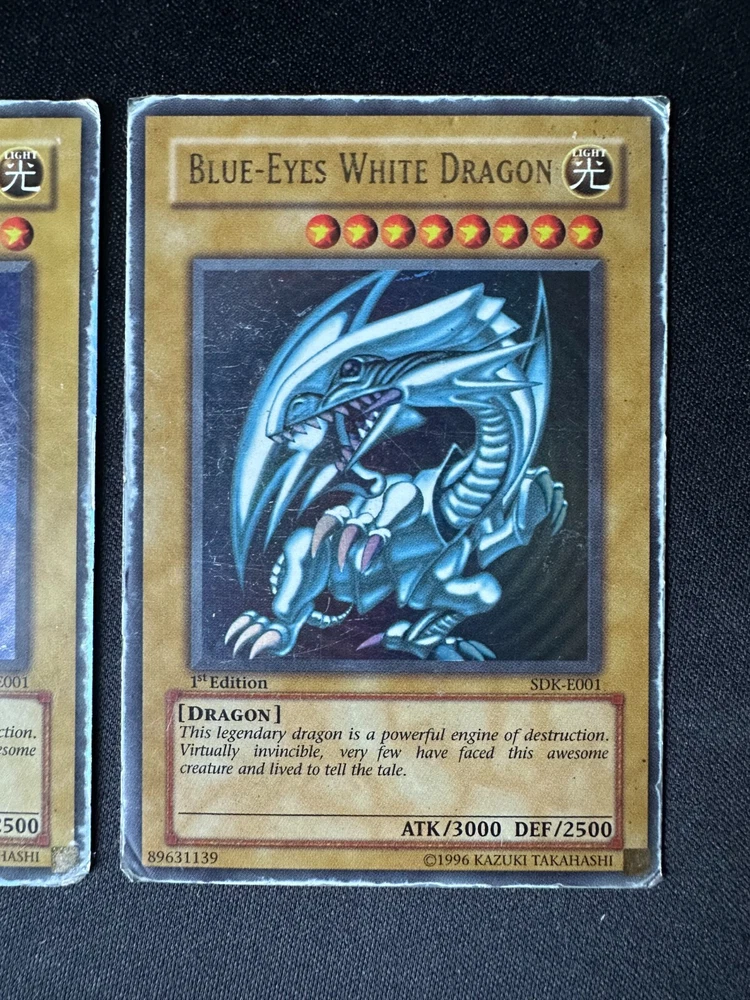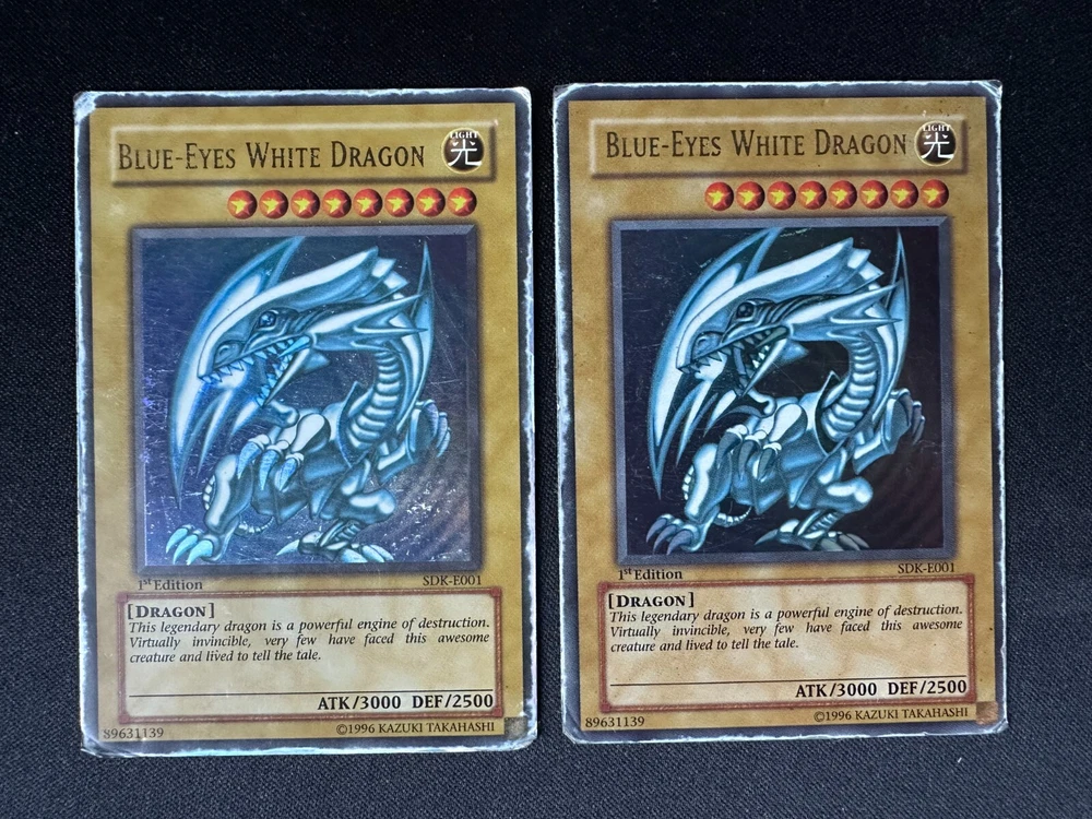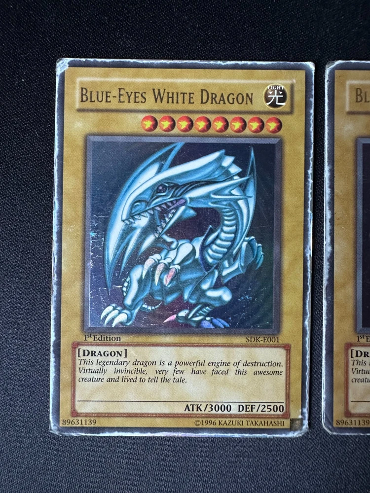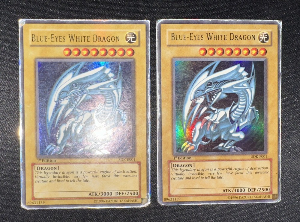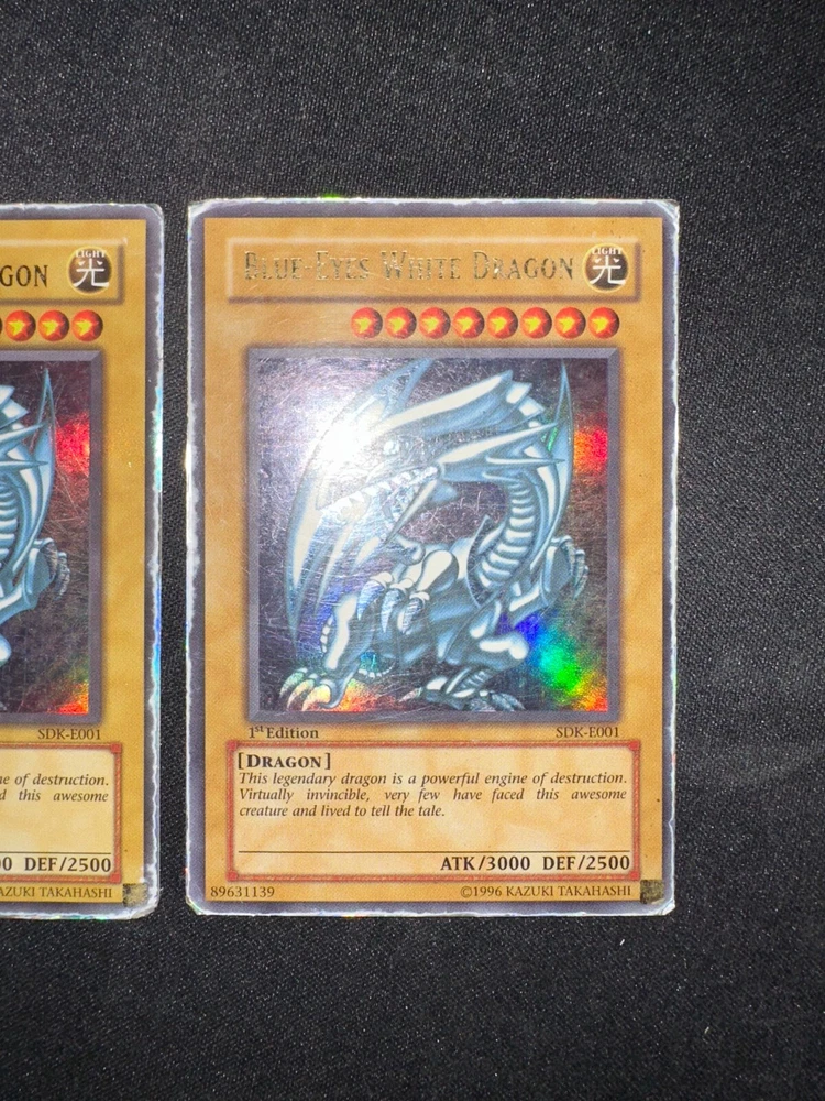 2x BLUE EYES WHITE DRAGON [ SDK-E001 ] 1st Edition ULTRA RARE - HP Yu-Gi-Oh Card Two Ultra Rare 1st Edition Blue-Eyes White Dragon Yu Gi Oh cards The cards are in Heavy Played condition as shown in the photo's T he card is from the Starter Deck: Kaiba set which was released in 2002 The cards will be shipped in a letterbox parcel with Track & Trace protected in a sleeve, toploader & team bag