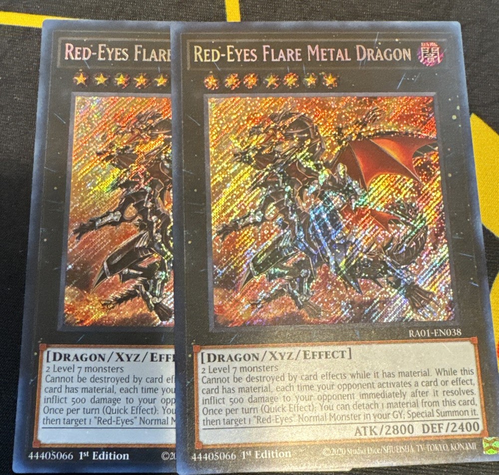 This 2x Red-Eyes Flare Metal Dragon RA01-EN038 Secret Rare NM card is a must-have addition to any Yu-Gi-Oh! TCG collection. The card is from the 25th Anniversary Rarity Collection set and is made of high-quality card stock material with a holo finish. It features the Creature/Monster Type of Dragon and has an impressive Attack/Power of 2800 and Defense/Toughness of 2400. The card is a 1st Edition Secret Rare and is in near mint or better condition. The card is standard size and is suitable for age level 6+. It has the Attribute/MTG:Color of Dark and is in English language. The card number is RA01-EN038 and is manufactured by Konami in the United States. The autographed feature is not included. This card is perfect for collectors who enjoy collecting rare and hard-to-find Yu-Gi-Oh! TCG cards.