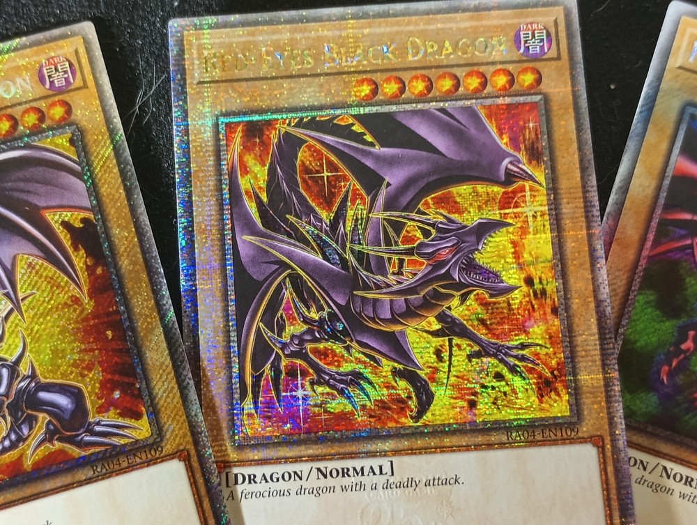 Listing is for 3 Red-Eyes Black Dragon Cards Quarter Century Secret Rare - RA04-EN109- 8TH ART Platinum Secret Rare - RA04-EN109 -4TH ART Platinum Secret Rare - RA04-EN109 - 7TH ART ALL 3 CARDS ARE NEAR MINT CONDITION AND HAVE NEVER BEEN USED IN ANY TYPE OF GAME PLAY THIS 3 CARD RED-EYS IS A PERFECT GIFT FOR SOMEONE WHO LOVES THEY TYPES OF DRAGONS, ESPECIALLY SINCE YOU ARE GETTING 3 STYLES OF ART WITH THE [8TH, 7TH, 4TH] MADE VIDEO TO THE BEST OF MY ABILITY SO HOPE SOMEONE GETS SOME TYPE OF ENJOYMENT OUT OF IT