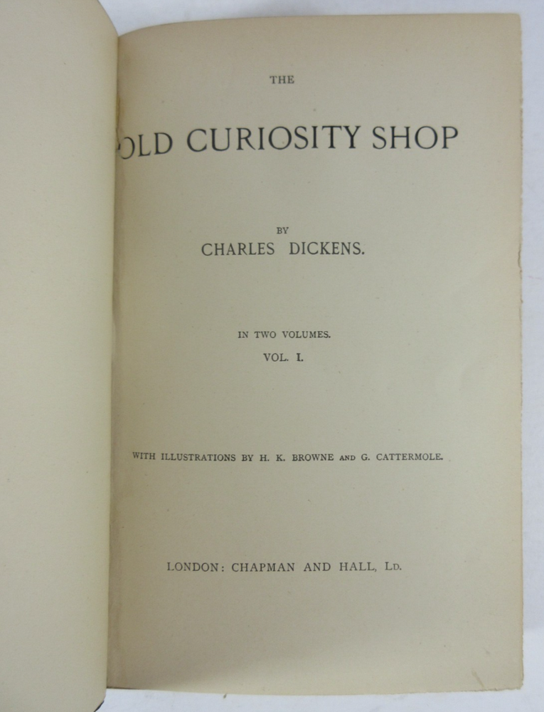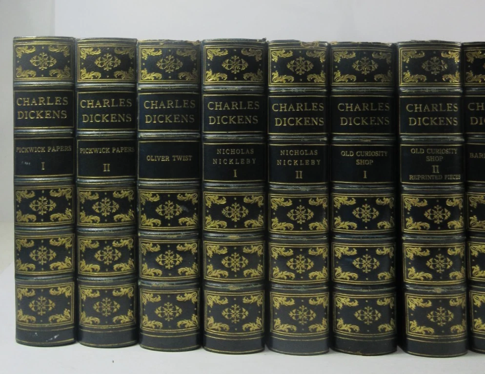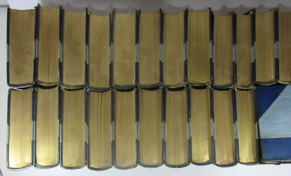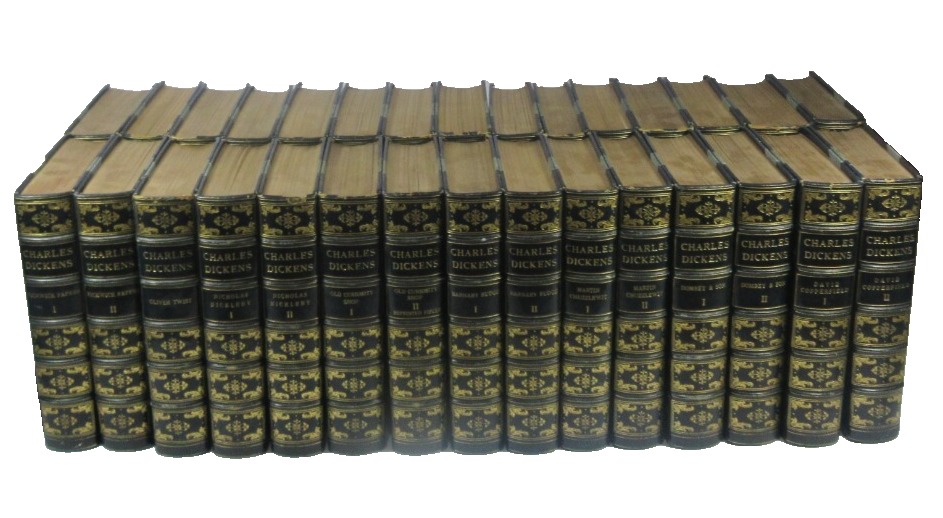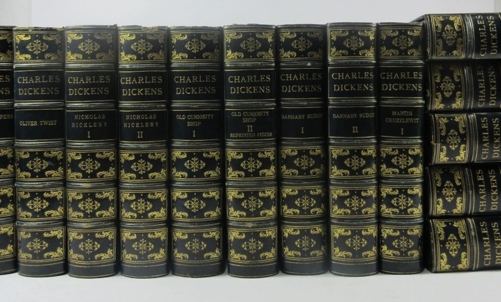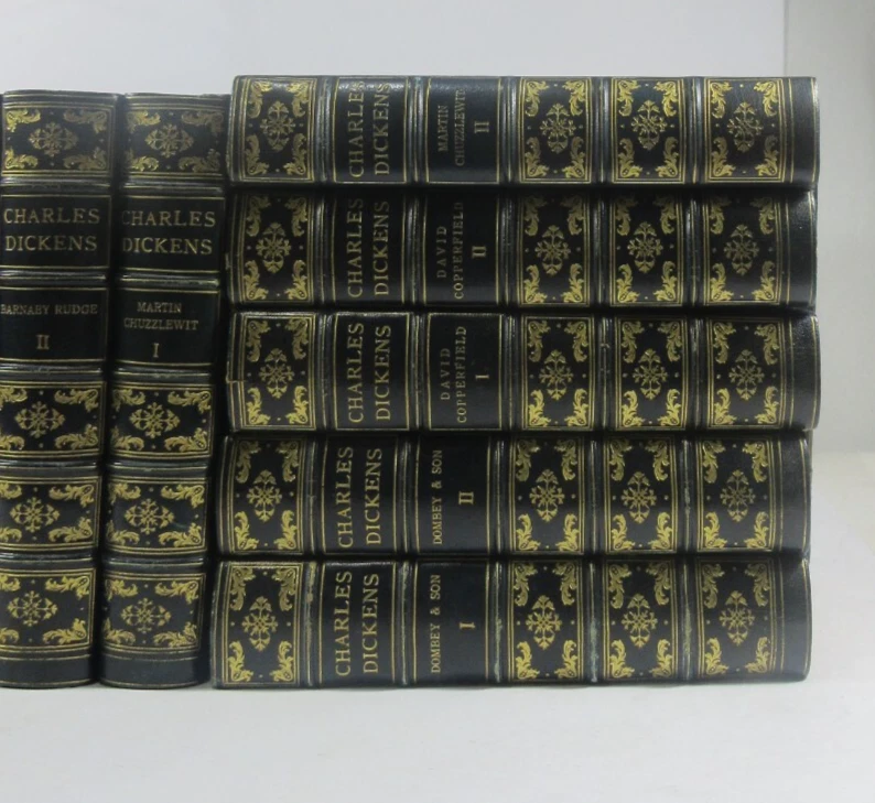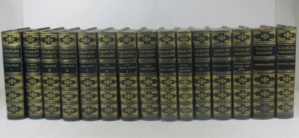 For sale is a Very Good to Very Good+ condition, 3/4 leather-bound, 30-volume set by Charles Dickens, illustrated by H.K. Browne . Undated, published in London by Chapman & Hall, ltd with (Richard Clay & Son) as well as (William Clowes and Sons). Rebound in 1/2 fine blue leather binding. Cloth boards show light shelf wear around the edges and to the corners. Pages are very good overall showing light age toning throughout. The bindings are holding sound, some open slightly easily. Please see photos for condition detail. Includes: - Pickwick Papers Vols. 1 & 2 - A Tale of Two Cities - Great Expectations - Oliver Twist - Nicholas Nickleby Vols. 1 & 2 - Old Curiosity Shop Vols. 1 & 2 - Barnaby Rudge Vols. 1 & 2 - Martin Chuzziewit Vols. 1 & 2 - David Copperfield Vols. 1 & 2 - Dombey & Sons Vols. 1&2 - Bleak House Vols. 1 & 2 - A Child's History of England - Little Dorrit Vols. 1 & 2 - Our Mutual Friend Vols. 1 & 2 - Uncommercial Traveler - Edwin Drood Etc. - Sketches by Boz - American Notes, Pictures From Italy - Christmas Stories - Christmas Books