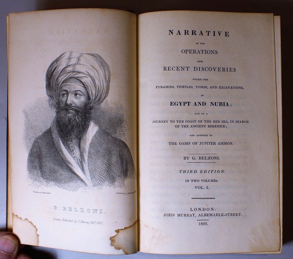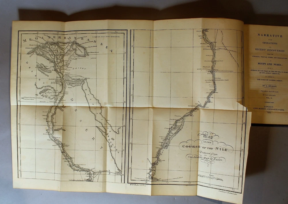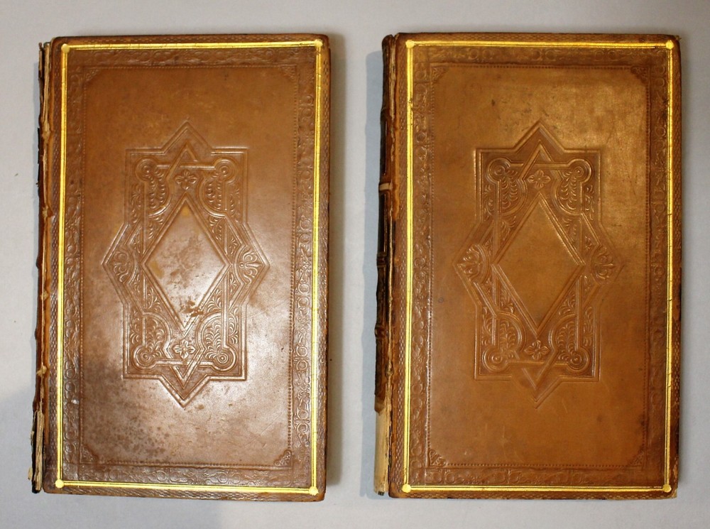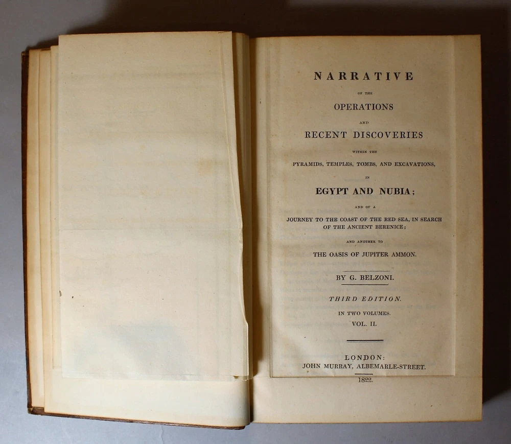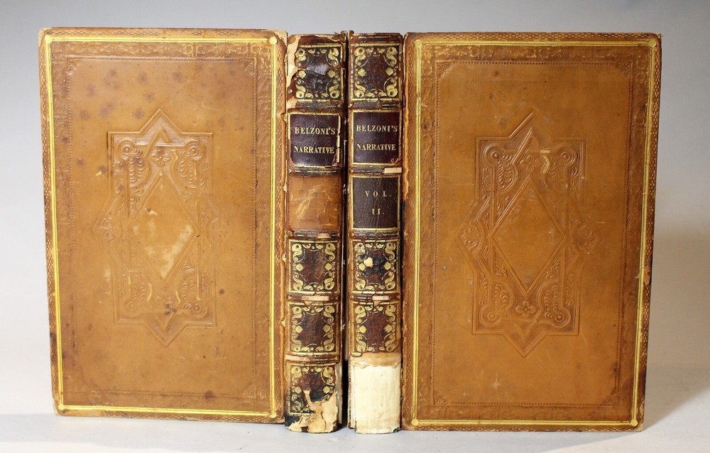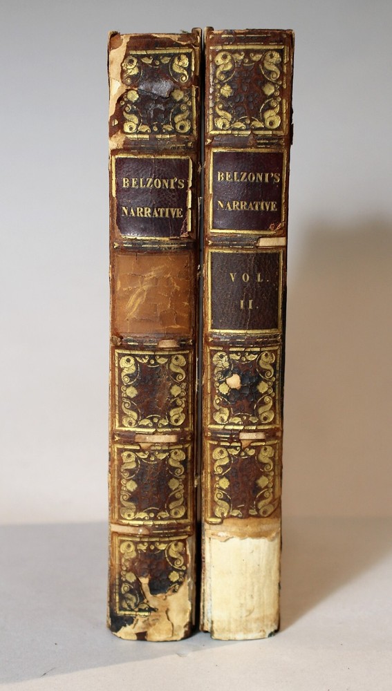 We are offering this rare third edition (in two volumes) of Giovanni Belzoni's "Belzoni's Narrative of Operations and Recent Discoveries within the Pyramids, Tombs and Excavations in Egypt and Nubia and of a Journey to the Coast of the Red Sea in Search of Ancient Berenice; and another to the Oasis of Jupiter Ammon.". It was published by John Murray in London in 1822. The book was contributed to by Sarah Belzoni. Our volumes are in full calf bindings with the boards impressed with a fine Islamic motif. The end papers and page edges are marbled. The set includes a fold out map that illustrates the course of the Nile and Belzoni's route to the oasis of Ammon. There is also a fold out plan of the Temple of Jerusalem. The condition of the volumes is as follows; both spines show damage and losses as illustrated; all but one hinge is cracked and the boards are loose but still attached. The condition of the boards is good but with bumped and worn corners. Vol. 1 has water stains on the lower corners of the fly leaf and frontispiece and another much lighter square stain of the front flyleaf. Other than a few foxed spots, the text block is clear and bright. There is a small rip in the fold out map (see illustration). There are no notations or owner signatures in either volume. Stock number SA2C-157(2)