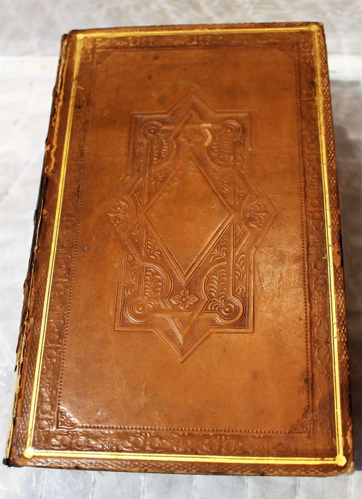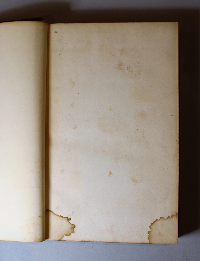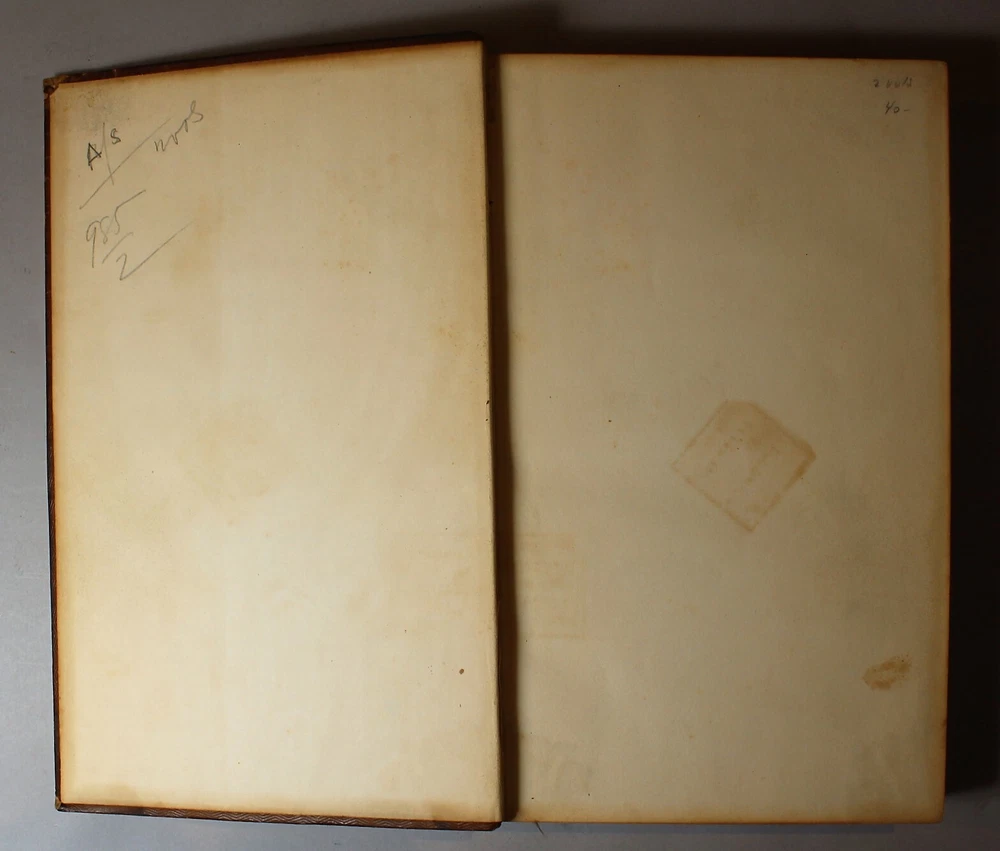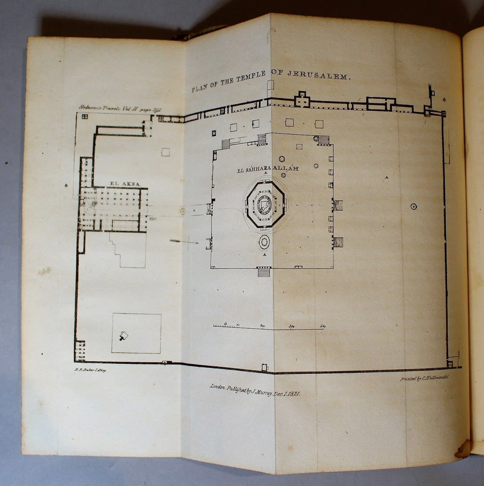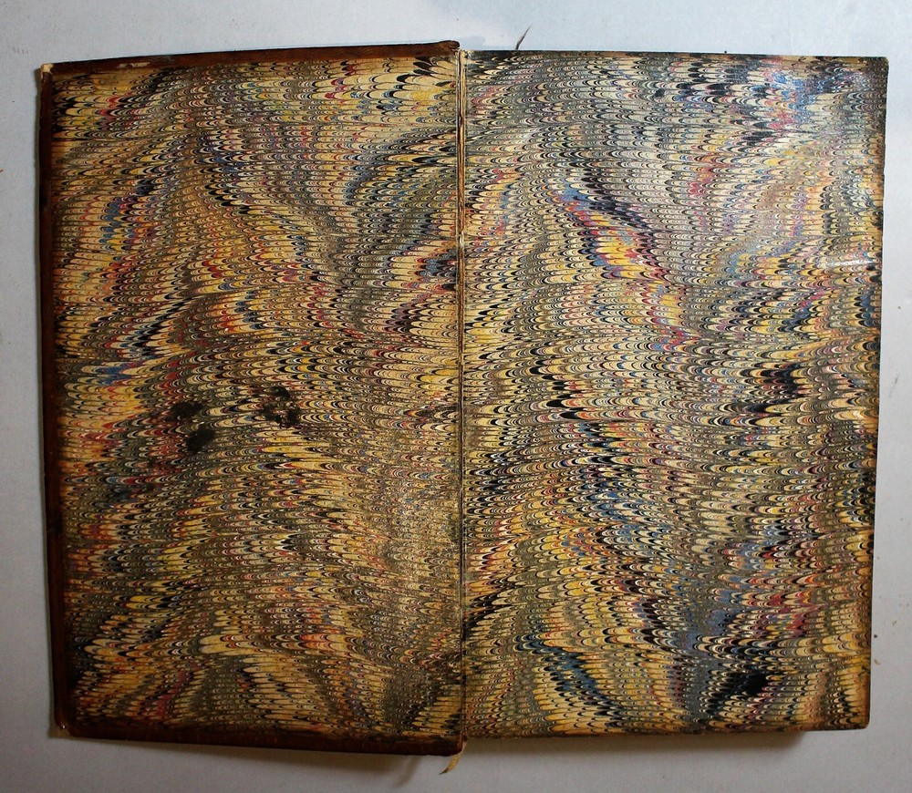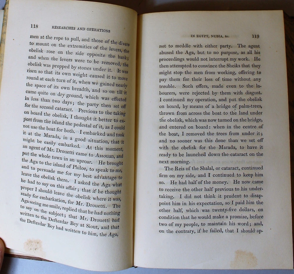 We are offering this rare third edition (in two volumes) of Giovanni Belzoni's "Belzoni's Narrative of Operations and Recent Discoveries within the Pyramids, Tombs and Excavations in Egypt and Nubia and of a Journey to the Coast of the Red Sea in Search of Ancient Berenice; and another to the Oasis of Jupiter Ammon.". It was published by John Murray in London in 1822. The book was contributed to by Sarah Belzoni. Our volumes are in full calf bindings with the boards impressed with a fine Islamic motif. The end papers and page edges are marbled. The set includes a fold out map that illustrates the course of the Nile and Belzoni's route to the oasis of Ammon. There is also a fold out plan of the Temple of Jerusalem. The condition of the volumes is as follows; both spines show damage and losses as illustrated; all but one hinge is cracked and the boards are loose but still attached. The condition of the boards is good but with bumped and worn corners. Vol. 1 has water stains on the lower corners of the fly leaf and frontispiece and another much lighter square stain of the front flyleaf. Other than a few foxed spots, the text block is clear and bright. There is a small rip in the fold out map (see illustration). There are no notations or owner signatures in either volume. Stock number SA2C-157(2)