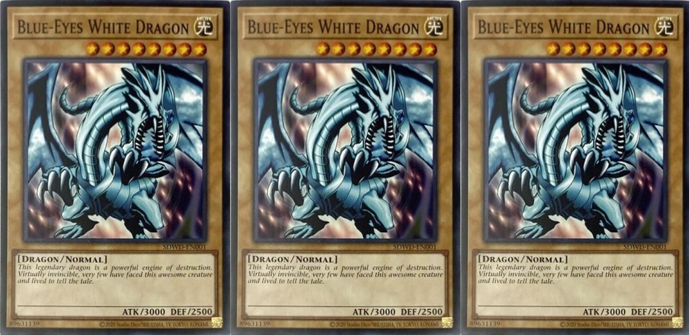 3x Blue-Eyes White Dragon Misprint SDWD-EN001 Common Unlimited NM Condition