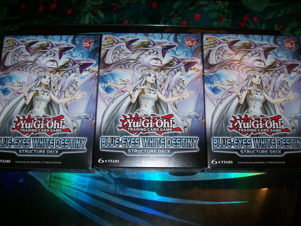 Comes with 3 Factory Sealed Blue-Eyes White Destiny structure decks. The cases put up for these, will be SEPERATE, from single cases I am opening. This means you will for sure have full odds to pull a qcr. Odds for buying 3(qty of 1 for this listing) decks are 1 in 16 to pull a Quarter century secret rare.