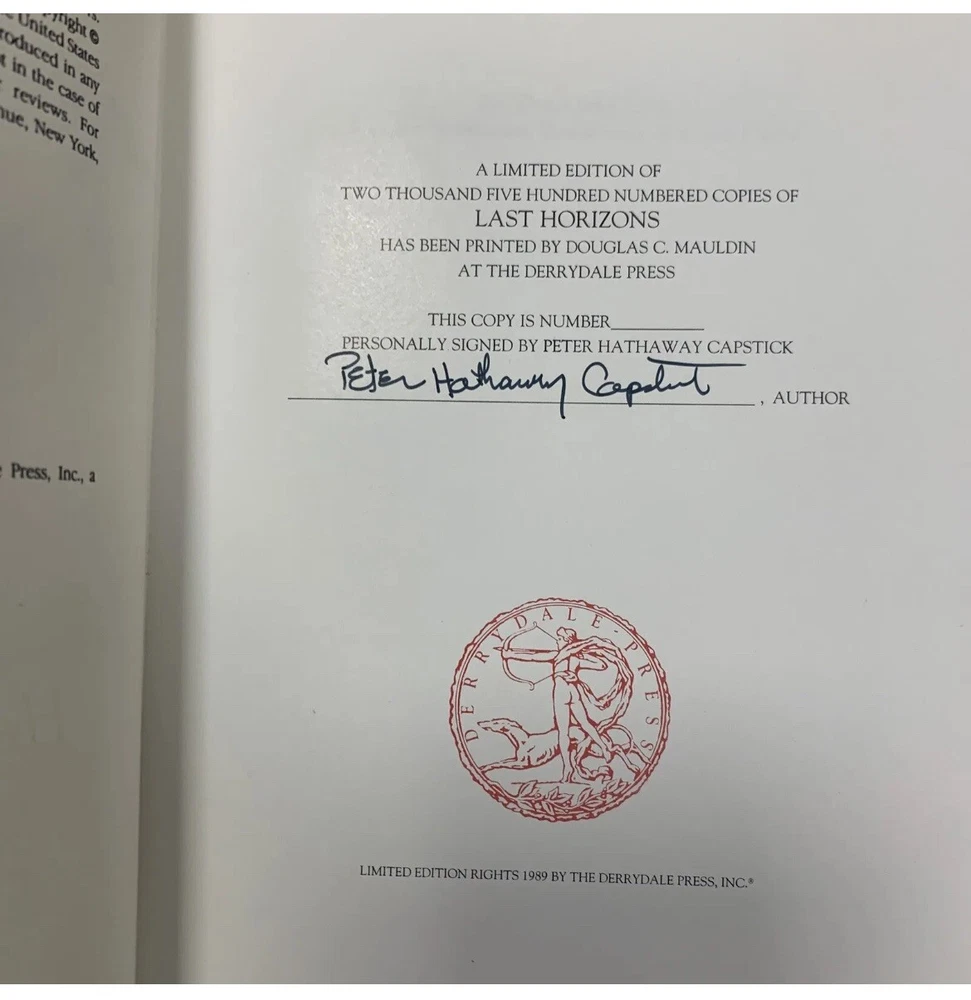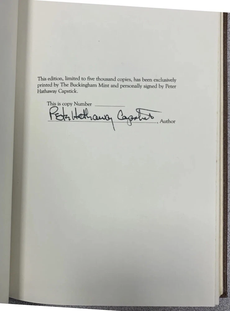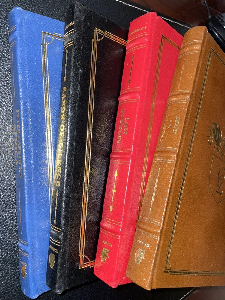 Set of 4 four signed hunting books by Peter CAPSTICK. Signed by the author, but not numbered. THE CAPSTICK COLLECTOR'S LIBRARY - leather edition A professional big game hunter offers accounts of his adventures while stalking such animals as the lion and Cape buffalo (m'bogo) in Africa. He also recounts his adventures bow-fishing for exotic species in the piranha-filled rivers of Brazil. Peter Hathaway Capstick (1940–1996) was an American stockbroker, hunter and author. Born in New Jersey and educated at the University of Virginia, he walked away from a successful Wall Street career shortly before his thirtieth birthday to become a professional hunter, first in Central and South America and later (and most famously) in Africa. Capstick spent much of his life in Africa, a land he called his "source of inspiration." A chain smoker and heavy drinker, he died at age 56 from complications following heart surgery. Peter Capstick started writing about his adventures in the late 1960s, and published numerous articles in various sporting magazines. In 1977 he published his first book, Death in the Long Grass, which was dedicated to his good friend Dean Witter Jr., famous stockbroker and big game hunter. The book became a commercial success and established his reputation as an author of true adventure stories. Peter Capstick is frequently compared to Ernest Hemingway in discussions of influential African hunting authors.