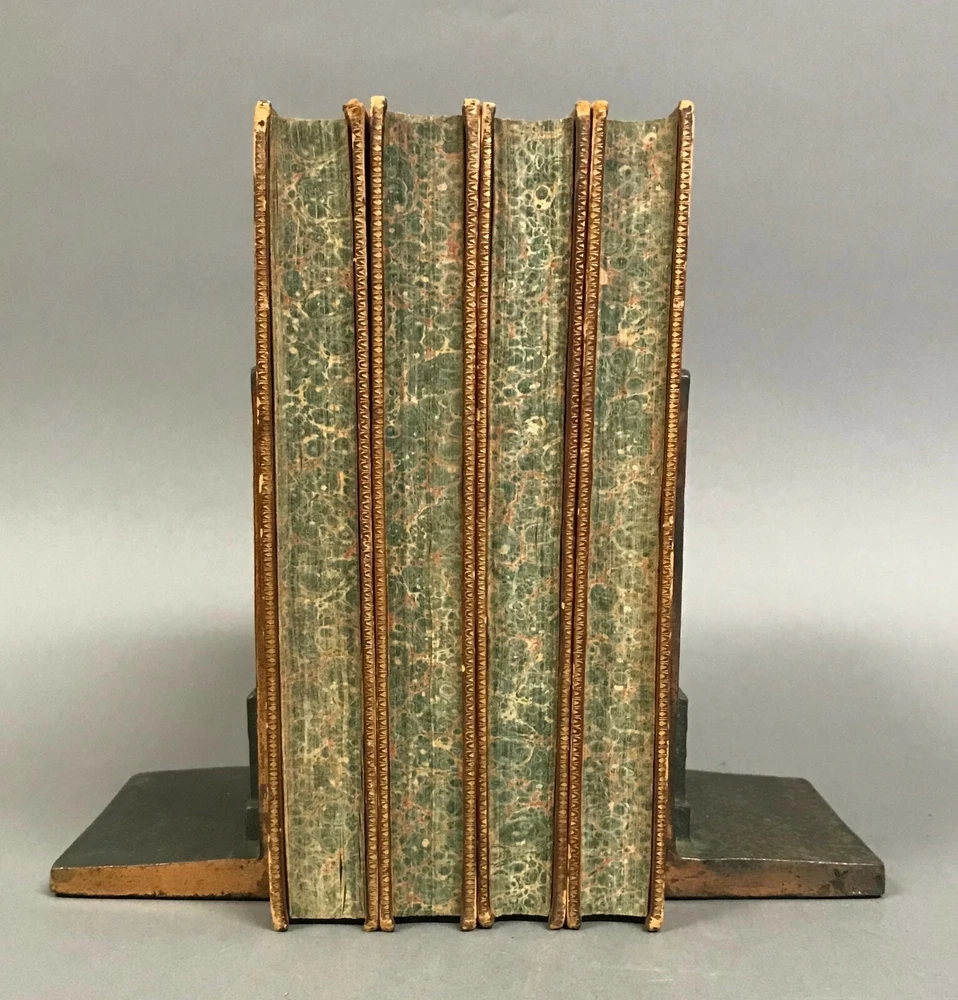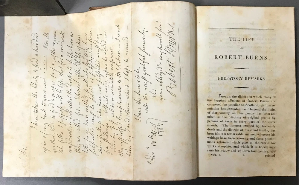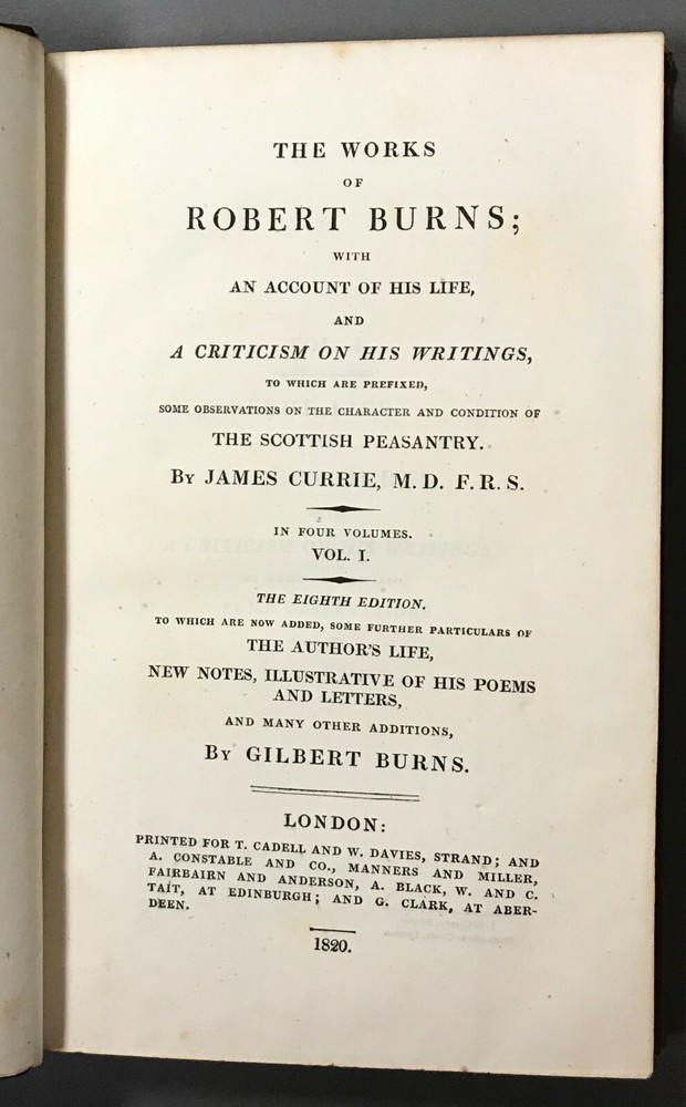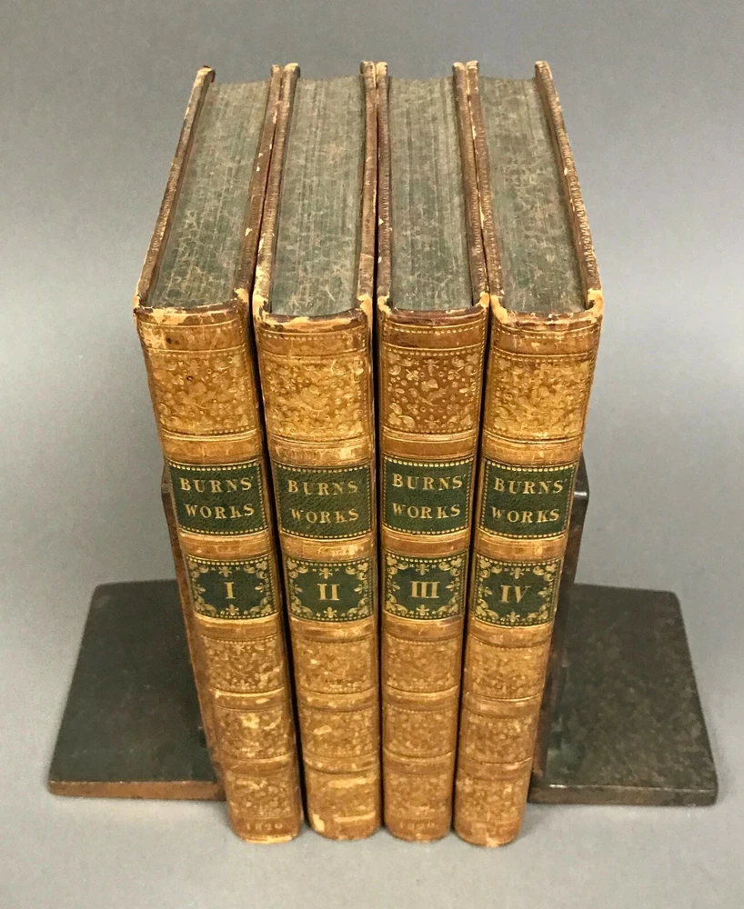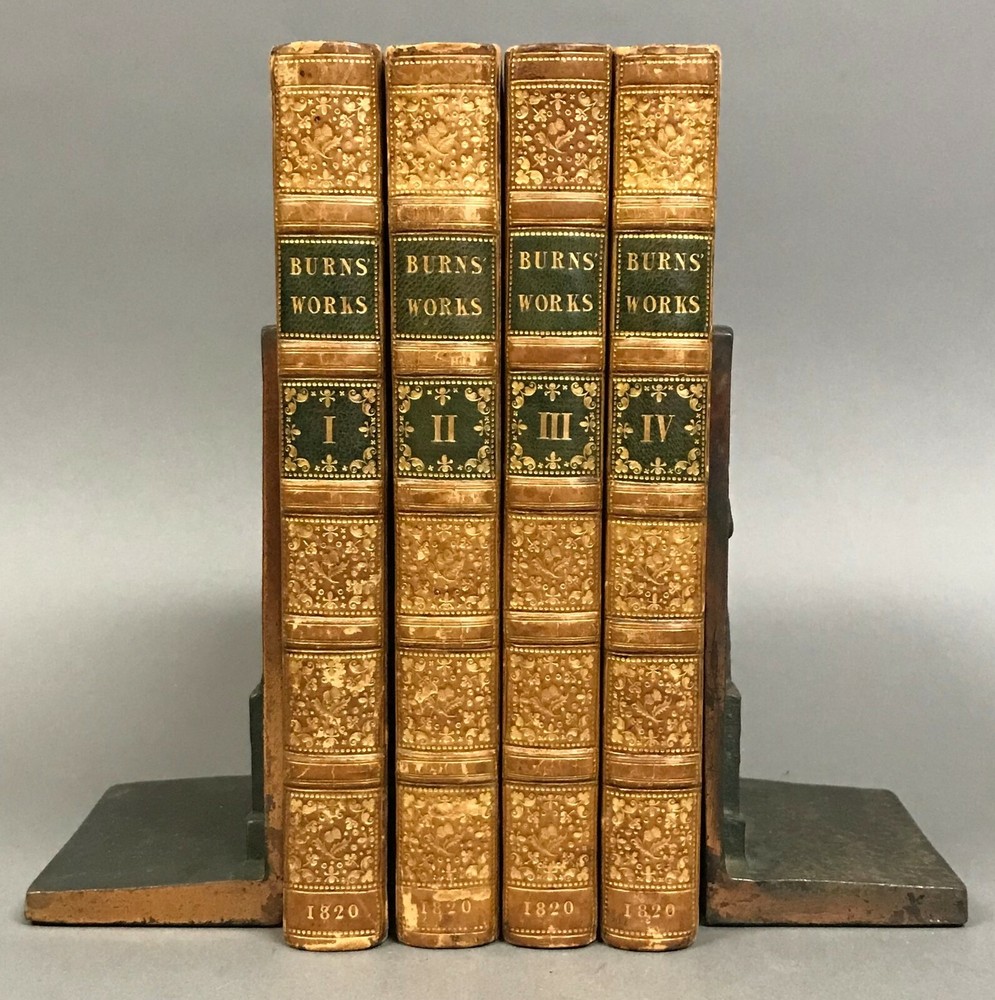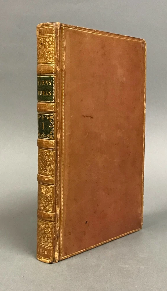 4 Volume Set in Morocco The Works of Robert Burns 8th Edition T. Cadell 1820 Robert Burns, James Currie, and Gilbert Burns. The Works of Robert Burns, in Four Volumes. London: T. Cadell, et al., 1820. Eighth edition. Octavos. Illustrated, with aquatint portrait frontispiece and engraved folding facsimile letter to Volume I. Beautifully bound in contemporary full morocco; tooled gilt to boards and spine, five raised bands; marbled edges and endpapers. Spine slightly sunned; minor rubbing to extremities; scattered foxing throughout. Still, very good. RJL-00078A