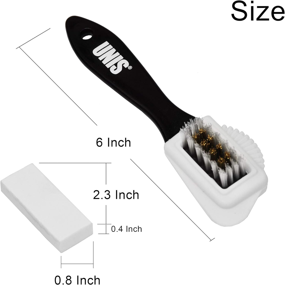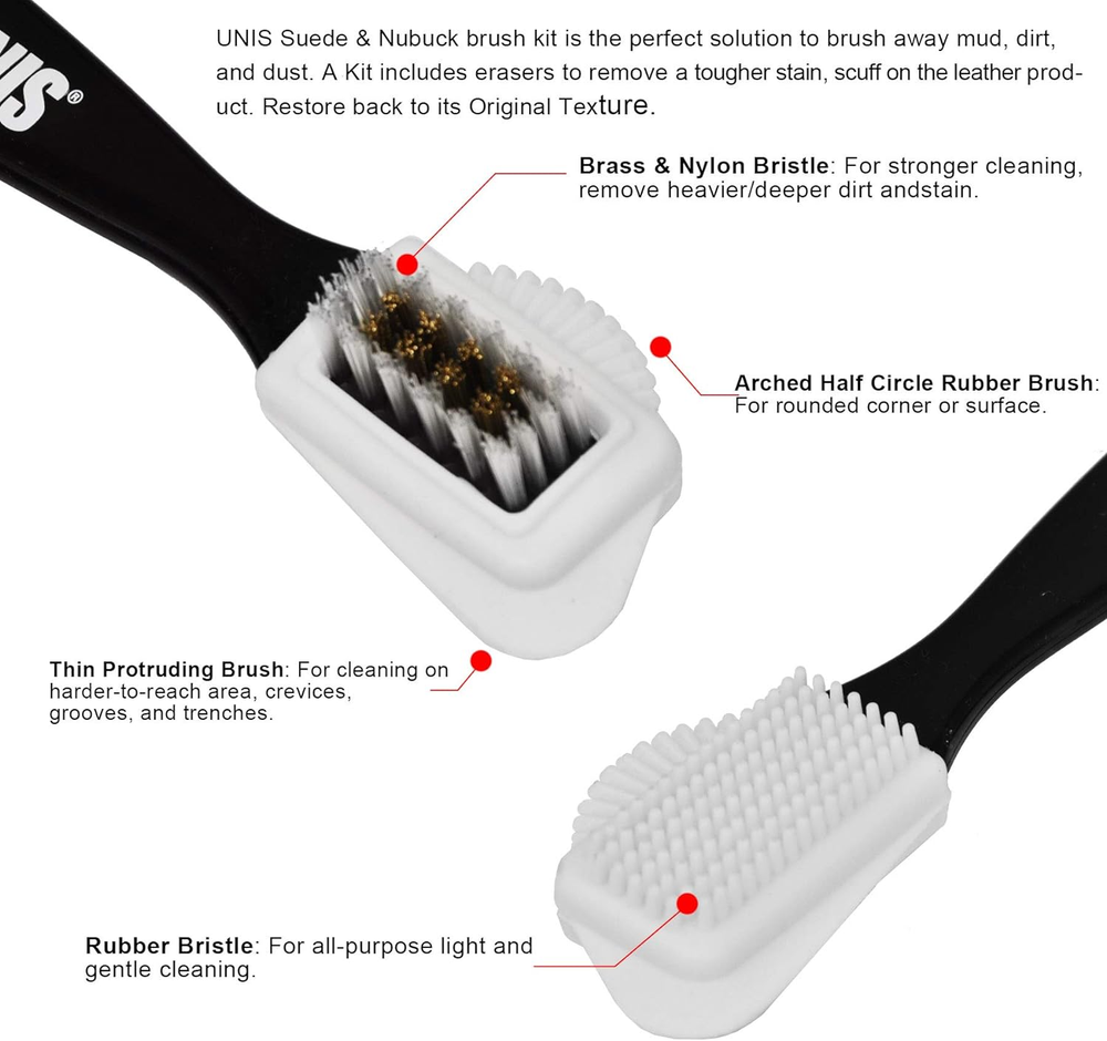 Das 4-in-1-Bürstenreinigungs- und Pflege-Set von UNIS ist die perfekte Lösung, um Schlamm, Schmutz und Staub auf Wildleder- oder Nubukleder-Oberflächen wie Schuhen, Jacken oder Haushaltsgegenständen mit Wildleder zu entfernen. Auf das Leder auftragen und seine ursprüngliche Textur wiederherstellen. Inklusive zwei Radiergummis zum Entfernen von Flecken. Messing & Nylonborsten: Für eine stärkere gründliche Reinigung, entfernt schwerer/tiefer Schmutz oder Flecken, die im Leder eingebettet sind. Gewölbte halbrunde Gummibürste: für abgerundete Ecken oder gekrümmte Kanten. Gummi-Borsten: Für allgemein leichte und schonende Oberflächenreinigung. Dünne überstehende Bürste: Für die Reinigung von schwer zugänglichen Stellen, Zervizen, Rillen und Gräben. Das 4-in-1-Bürstenreinigungs- und Pflegeset von UNIS ist die perfekte Lösung, um Schlamm, Schmutz und Staub auf Wildleder- oder Nubukleder-Oberflächen wie Schuhen, Jacken oder Haushaltsgegenständen mit Wildleder zu entfernen. Auf das Leder auftragen und seine ursprüngliche Textur wiederherstellen. Inklusive zwei Radiergummis zum Entfernen von Flecken. Messing & Nylonborsten: Für eine stärkere gründliche Reinigung, entfernt schwerer/tiefer Schmutz oder Flecken, die im Leder eingebettet sind. Gewölbte halbrunde Gummibürste: für abgerundete Ecken oder gekrümmte Kanten. Gummi-Borsten: Für allgemein leichte und schonende Oberflächenreinigung. Dünne überstehende Bürste: Für die Reinigung von schwer zugänglichen Stellen, Zervizen, Rillen und Gräben. Radiergummi: Zur Fleckenbehandlung zum Entfernen von oberflächlichen Flecken oder Flecken auf Wildleder- oder Nubukoberflächen. Mit festem Druck gegen Flecken reiben. Verwenden Sie den Pinsel, um Rückstände auf der Oberfläche zu entfernen. Hinweis: Pinsel und Radiergummi werden nicht in der Lage sein, Ölbasis oder Farbflecken auf Wildleder oder Nubuk zu entfernen.