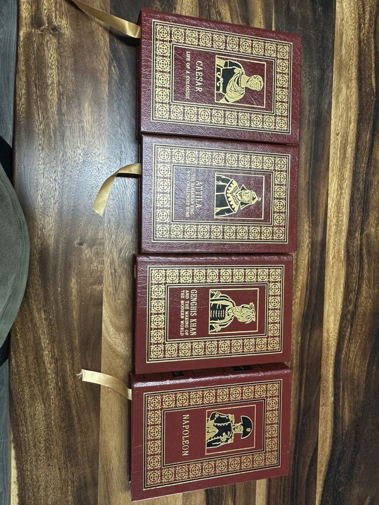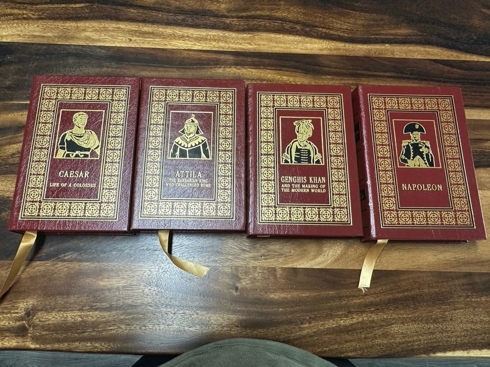 Delve into the annals of conquest with the "4-VOL Set 'THE CONQUERORS' Leather-Bound Easton Press," featuring renowned historical figures such as Caesar, Napoleon, Attila, and genghis khan. Crafted with precision, each volume is bound in rich leather, exuding a classic feel that is both durable and aesthetically pleasing. Published by Easton Press in 2008, these books are a testament to Cartledge's meticulous research and narrative prowess. The set is composed in English and originates from Norwalk, CT, assuring its authenticity as a original publication from the United States. Ideal for history aficionados or collectors of antiquarian books, this collector's edition encapsulates the spirit of world history's most influential leaders. An original and unmodified treasure, it promises to be a prestigious addition to any library.
