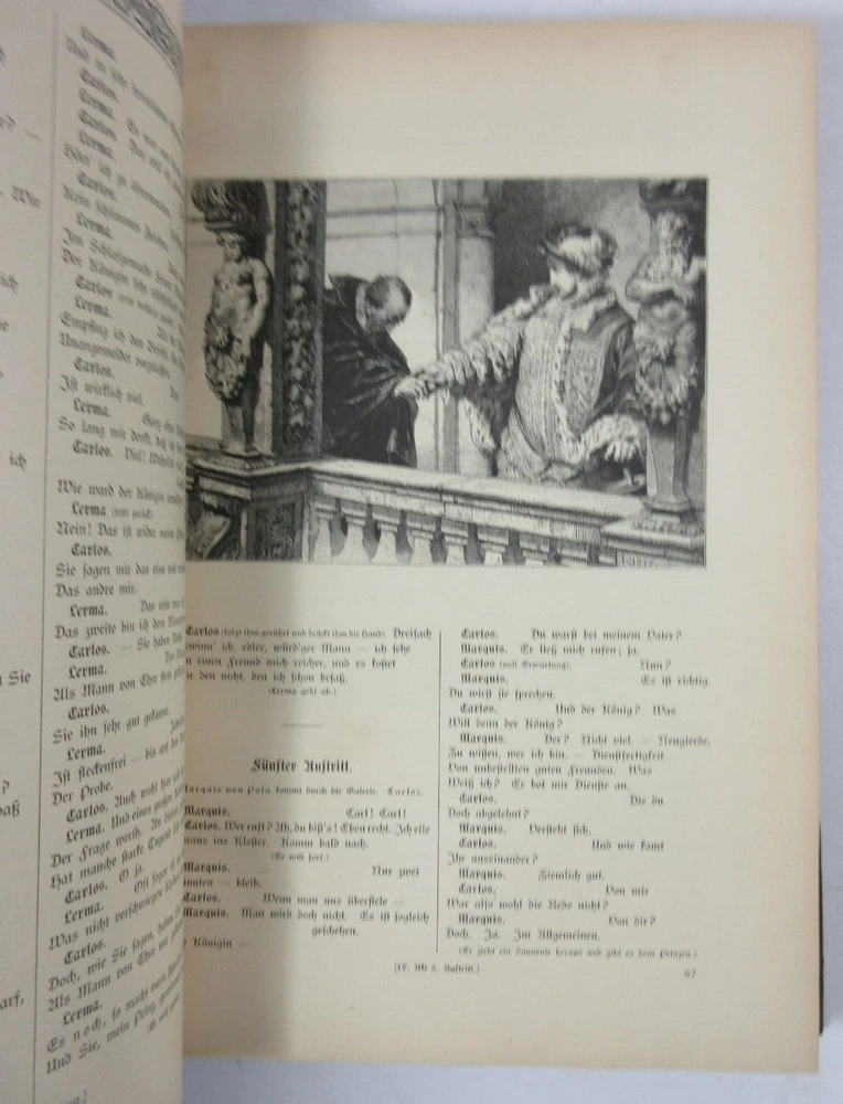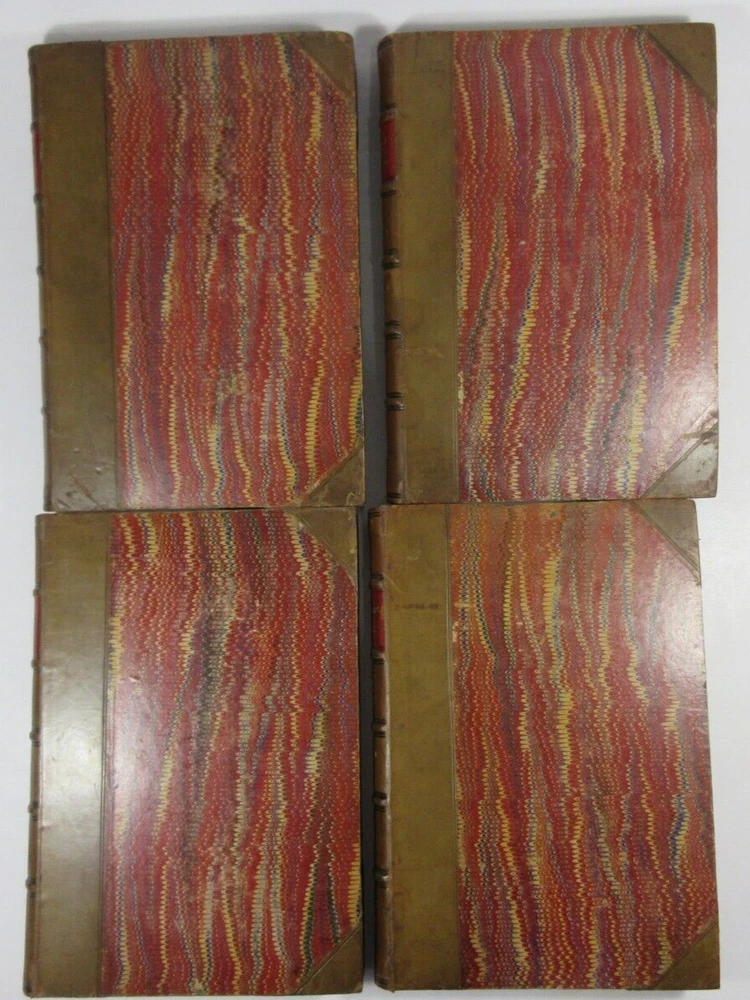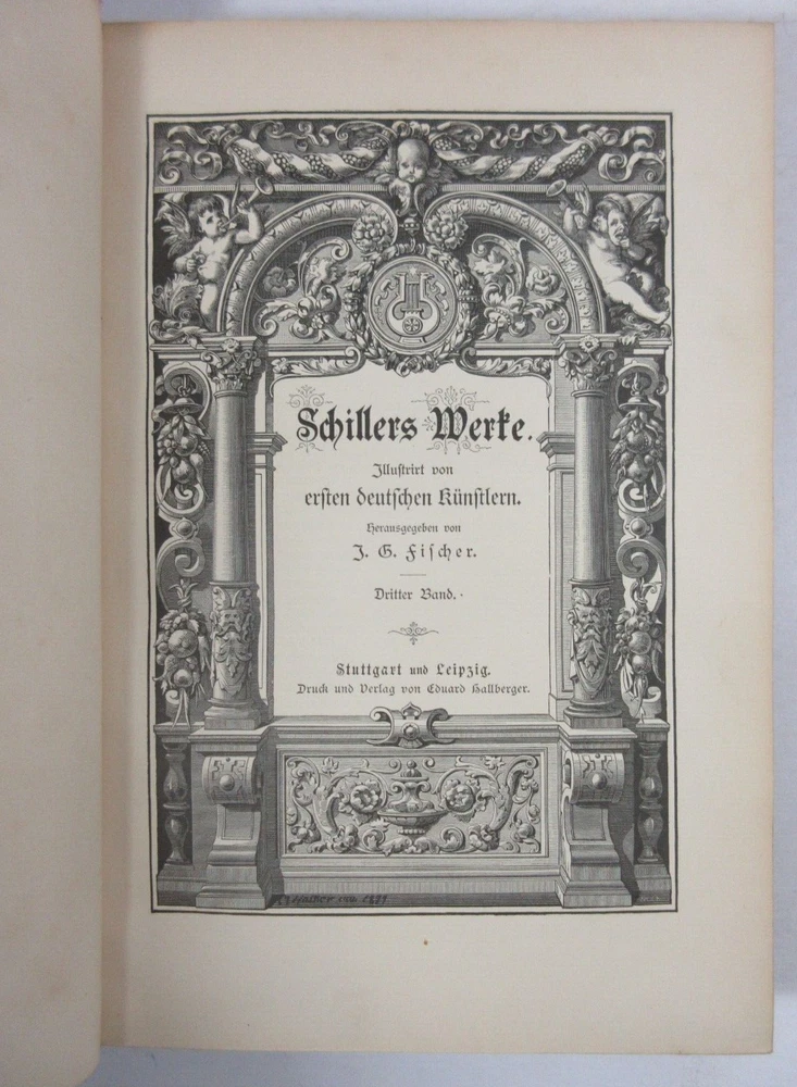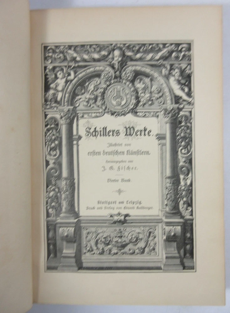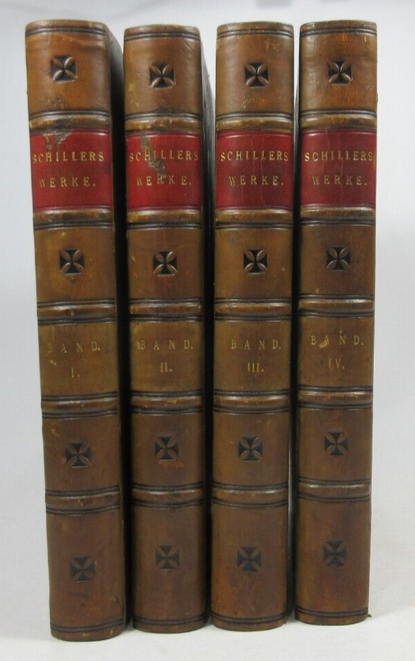 For sale is a Very Good+ condition, 1/4 leather binding, 4-volume set of Schillers Werke, work by Friedrich Schiller, edited by J.G. Fischer . Text in German. Published in 1879, by Stuttgart und Leipzig. Rebound by Charles Cooper of Birmingham, in 1/4 fine leather binding. Marbled boards show light shelf wear around the edges and to the corners. Pages are very good overall showing light age toning throughout and occasional light stain spotting. All 4 volumes have the previous owner's bookplate affixed on the inside front cover, as well as a 'bound by Charles Cooper' sticker. Please see photos for condition detail. Shelf Reference #L-2452