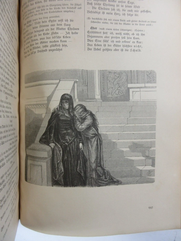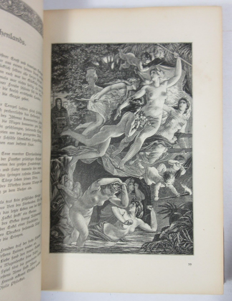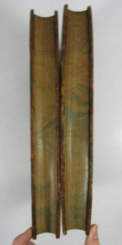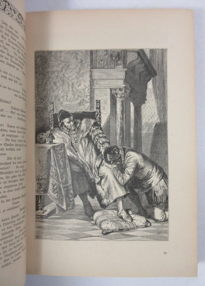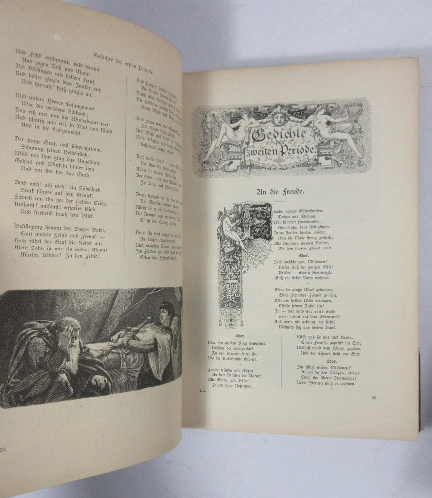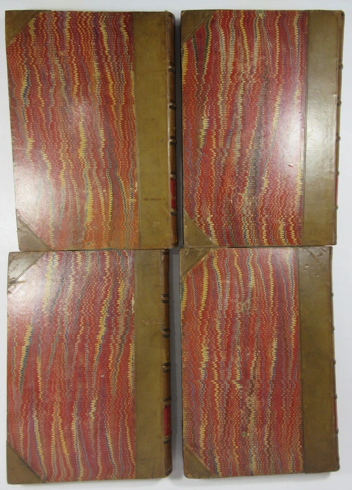 For sale is a Very Good+ condition, 1/4 leather binding, 4-volume set of Schillers Werke, work by Friedrich Schiller, edited by J.G. Fischer . Text in German. Published in 1879, by Stuttgart und Leipzig. Rebound by Charles Cooper of Birmingham, in 1/4 fine leather binding. Marbled boards show light shelf wear around the edges and to the corners. Pages are very good overall showing light age toning throughout and occasional light stain spotting. All 4 volumes have the previous owner's bookplate affixed on the inside front cover, as well as a 'bound by Charles Cooper' sticker. Please see photos for condition detail. Shelf Reference #L-2452