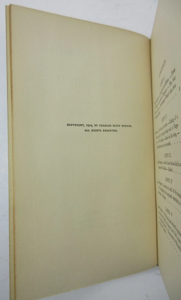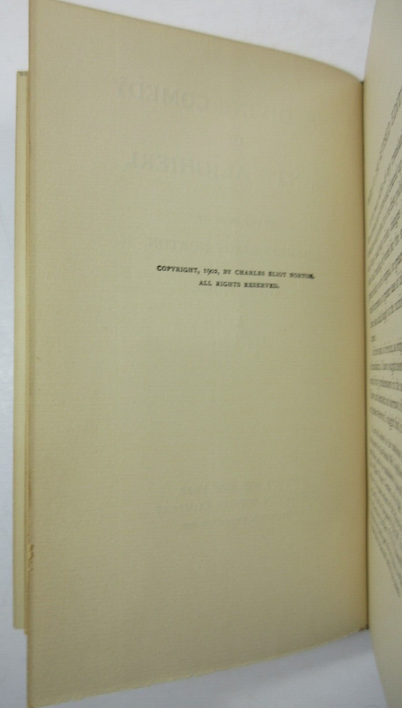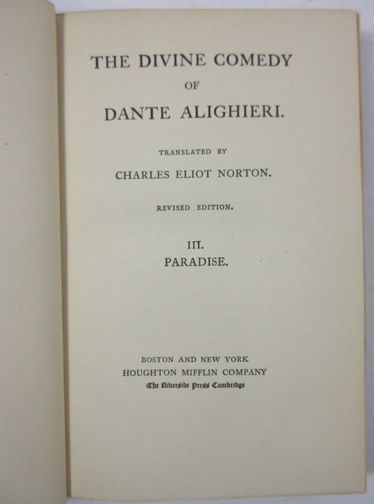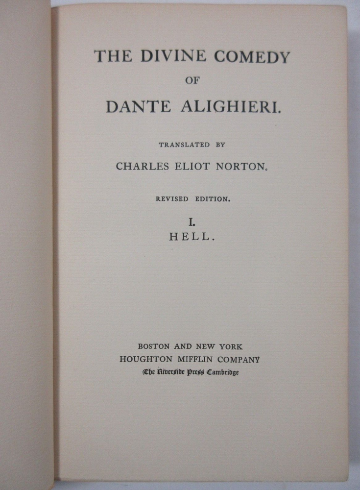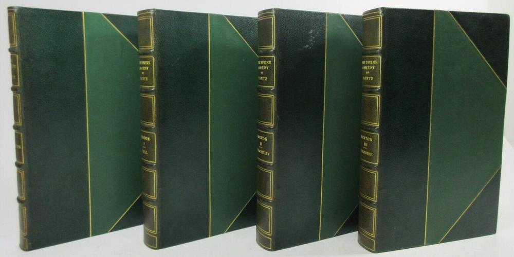 For sale is an excellent condition, 3/4 leather fine binding, 4-volume set of The Divine Comedy of Dante Alighieri: Volume 1-Hell, Volume 2-Purgatory, Volume 3-Paradise & The New Life of Dante Alighieri, translated by Charles Eliot Norton . 1902 Revised editions, published by Houghton Mifflin Company & Riverside Press . Volumes are bound in 3/4 green leather with gilt lettering on the spines. Boards show only light shelf wear. Pages show light age toning throughout. Please see photos for condition detail. Shelf Reference #L-2214