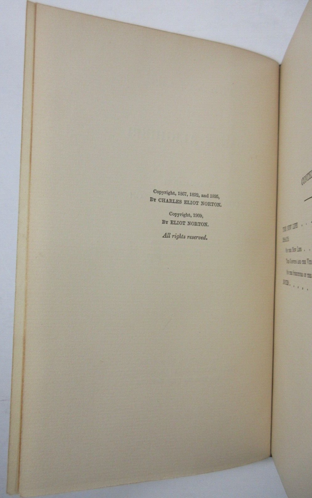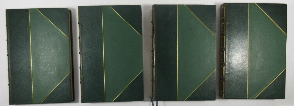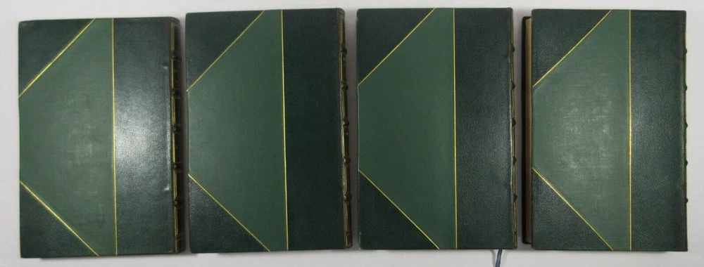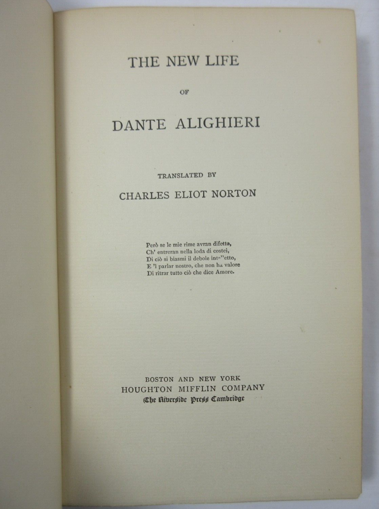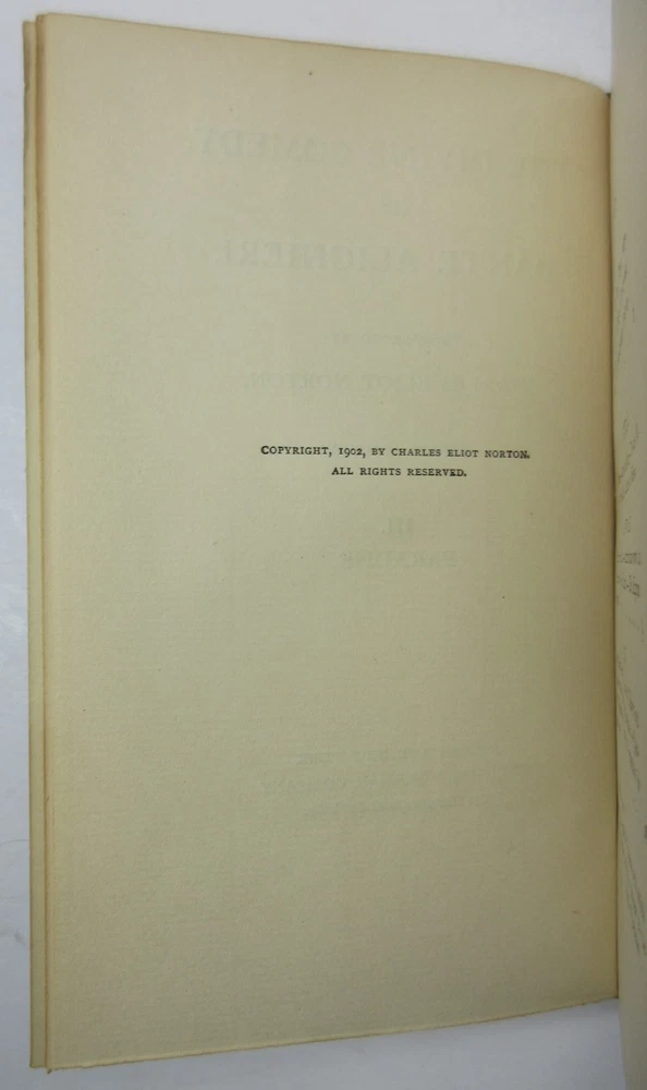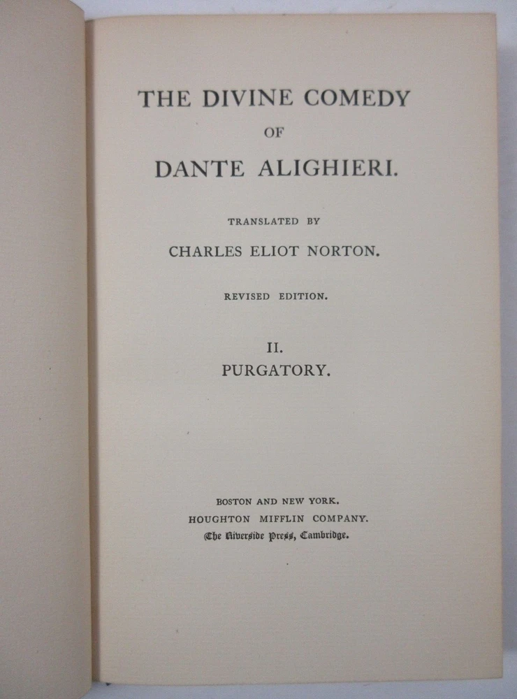 For sale is an excellent condition, 3/4 leather fine binding, 4-volume set of The Divine Comedy of Dante Alighieri: Volume 1-Hell, Volume 2-Purgatory, Volume 3-Paradise & The New Life of Dante Alighieri, translated by Charles Eliot Norton . 1902 Revised editions, published by Houghton Mifflin Company & Riverside Press . Volumes are bound in 3/4 green leather with gilt lettering on the spines. Boards show only light shelf wear. Pages show light age toning throughout. Please see photos for condition detail. Shelf Reference #L-2214