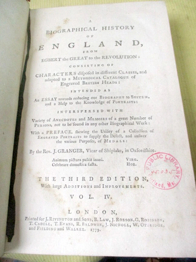 ENLARGED PICTURES!! Please scroll ALL the way down to view LARGER images. CR 36. 4 Volumes. From Egbert The Great to the Revolution. Rev. J. Granger, Vicar of Shiplake in Oxfordshire. Printed for J. Rivington and Sons, and others, London. 1779. 3rd Edition. Octavo. 407 pages. 436 pages. 420 pages. 376 pages. Plus approx 50 page Index. Full leather. Text immaculate on white laid paper. Exteriors with moderate wear. Ex-Library with front book plate, each volume, and small round stamp on each title page. Otherwise, All in Very Good condition. Please do not hesitate to e-mail with any questions. As Always, Satisfaction Guaranteed! PAYMENT: PayPal, because eBay requires sellers to list electronic payments exclusively. I expect to receive payment within 10 days, unless we have made other arrangements. MEDIA MAIL: The majority of my books are sent Media Mail to U.S. customers. I add $1.00 for shipping materials, etc. (The shipping price that you see at the top of the page includes the handling fee.) PRIORITY MAIL: I will send both Media cost and Priority cost with invoice, on books which seem to warrant Priority service or when buyer requests it. I'm glad to combine multiple purchases in order to minimize shipping costs. I WILL SHIP INTERNATIONALLY, and I try to be as economical as possible with the shipping costs. Whenever a book will fit comfortably in a Priority Flat Rate Envelope, I'll send it that way. RETURN POLICY: Satisfaction Guaranteed! Payment I accept the following forms of payment: PayPal Shipping & Handling I'm glad to combine multiple purchases for less expensive shipping costs. US Shipping Please check eBay's Shipping & Payment tab USPS Media Mail® International Shipping Please check eBay's Shipping & Payment tab USPS Priority Mail International FREE scheduling, supersized images and templates. Get Vendio Sales Manager. FREE scheduling, supersized images and templates. Get Vendio Sales Manager. Over 100,000,000 served. Get FREE counters from Vendio today!