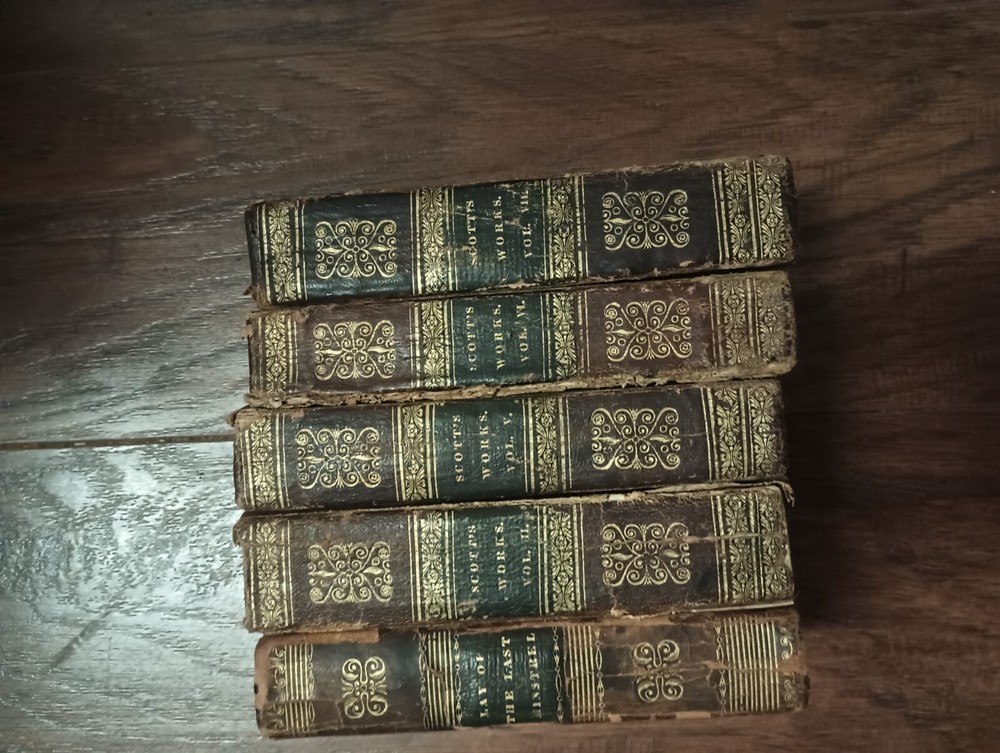 This is a set of 5 1828 Sir Walter Scott Leather Bound Books in fair overall condition. One book has a loose cover as shown in the photographs. One book has a ripped but complete inside title cover page. These 5 books are highly readable with some minor fixing even though no pages seem to be missing. These 5 Sur Walter Scott books are for sale internationally for $495. These books are not available for shipping to to Italy. All international buyers are responsible for any duty or import fees for their country and these books must be declared at sale price on eBay for any international shipping. All shipping within the continental USA is by USPS Priority Mail and a signature may be required for delivery. All international shipping will be done using the eBay international shipping program. Buyer must contact seller and pay for these books within 4 days of date of sale or forfeit the right to purchase.