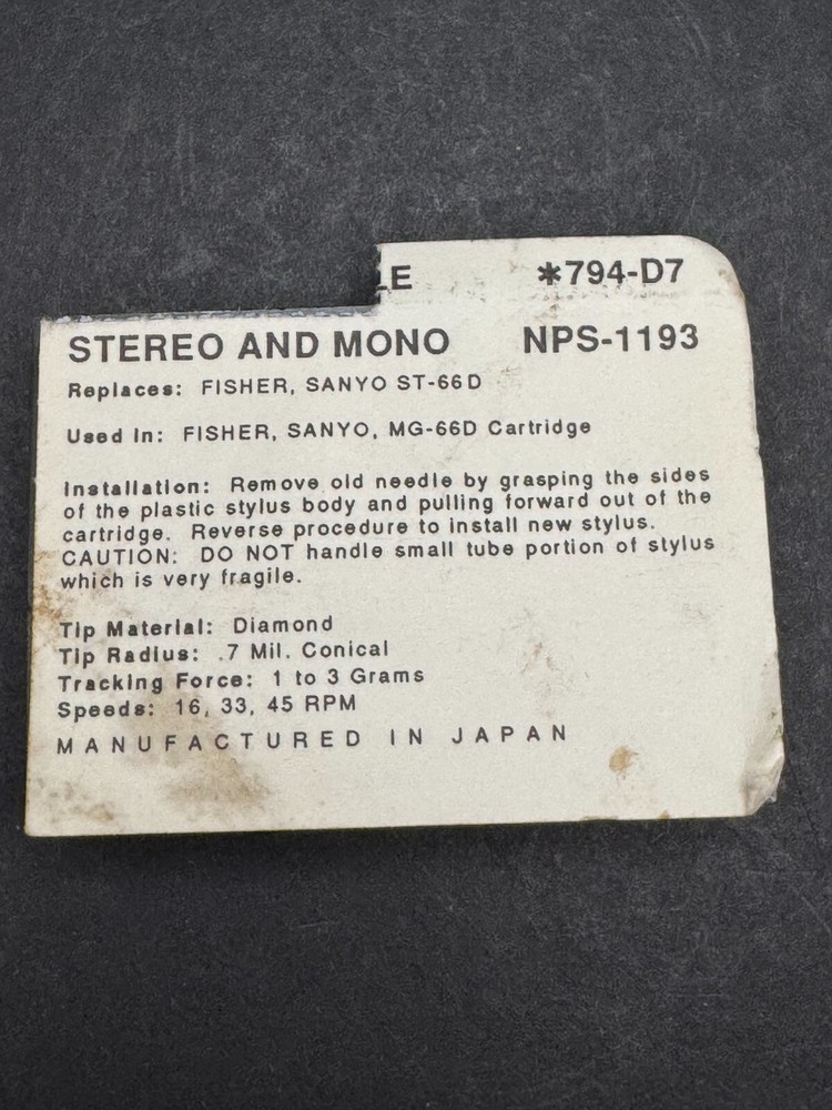 The 794-D7 Needle is compatible with Fisher and Sanyo ST-66D turntables. It is black in color and made in Japan. This needle is designed for precise audio playback and is a high-quality replacement part for your record player or turntable system. Found at an Estate sale in original box. The bottom of the box is open - unknown if it has been used. I am unfamiliar with these and have no way of testing it. Sold as found exactly as you see it in the photos. As is, no warranty. Please see photos as part of description.