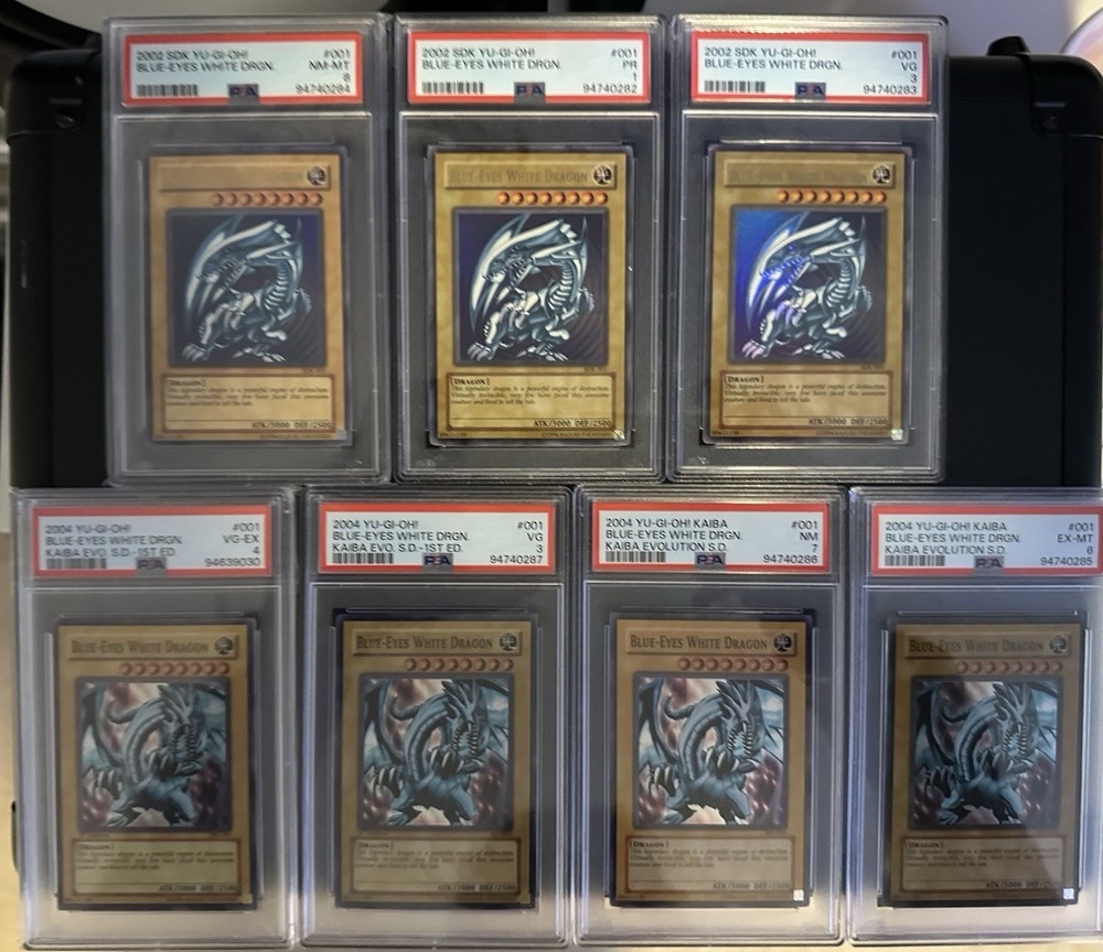 The product is a set of 7 professionally graded Yugioh Blue Eyes White Dragon cards from the 2002-2004 series, with 1st Edition stamps. Graded by Professional Sports Authenticator (PSA), these cards are in Moderately Played condition and are from the United States manufacturer Konami. Each card is in the Normal type and features the Blue attribute and Dragon creature type. These highly collectible cards are perfect for any Yu-Gi-Oh! TCG enthusiast looking for rare and valuable additions to their collection.