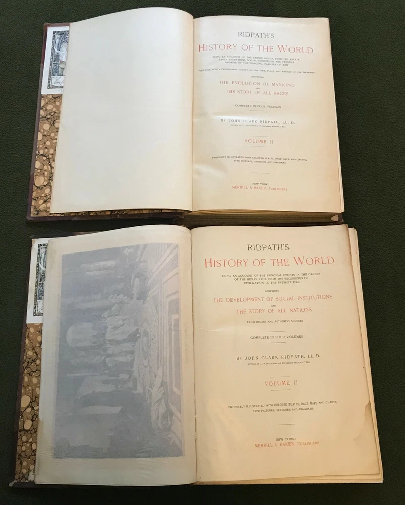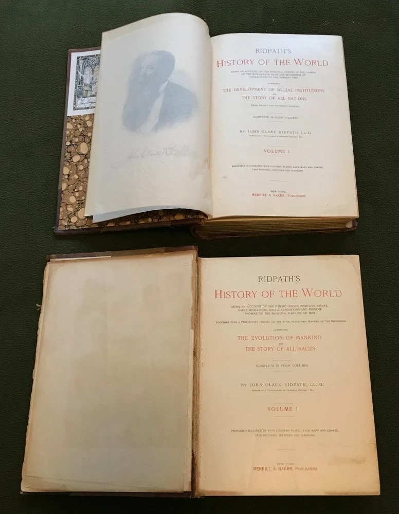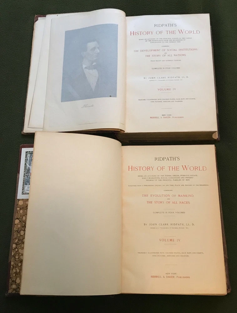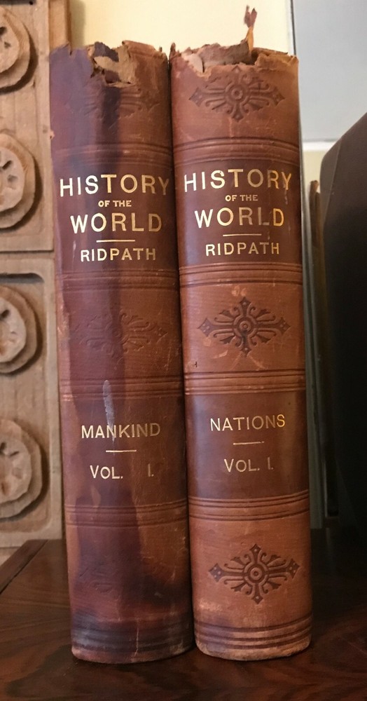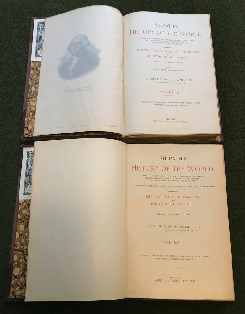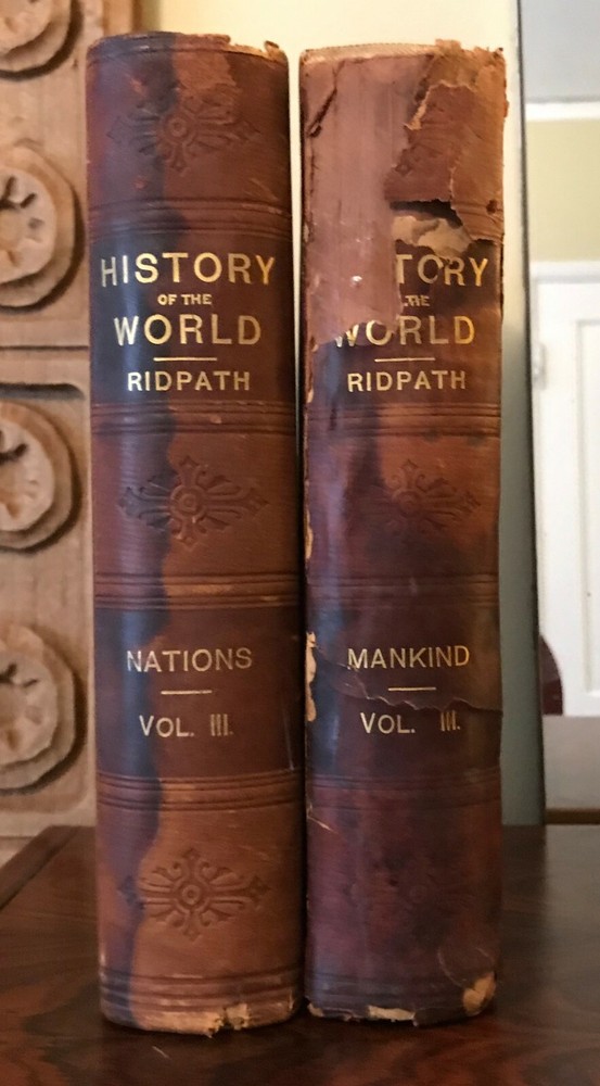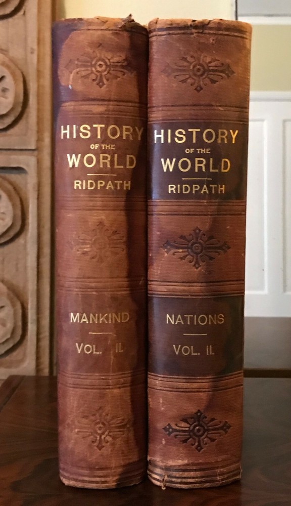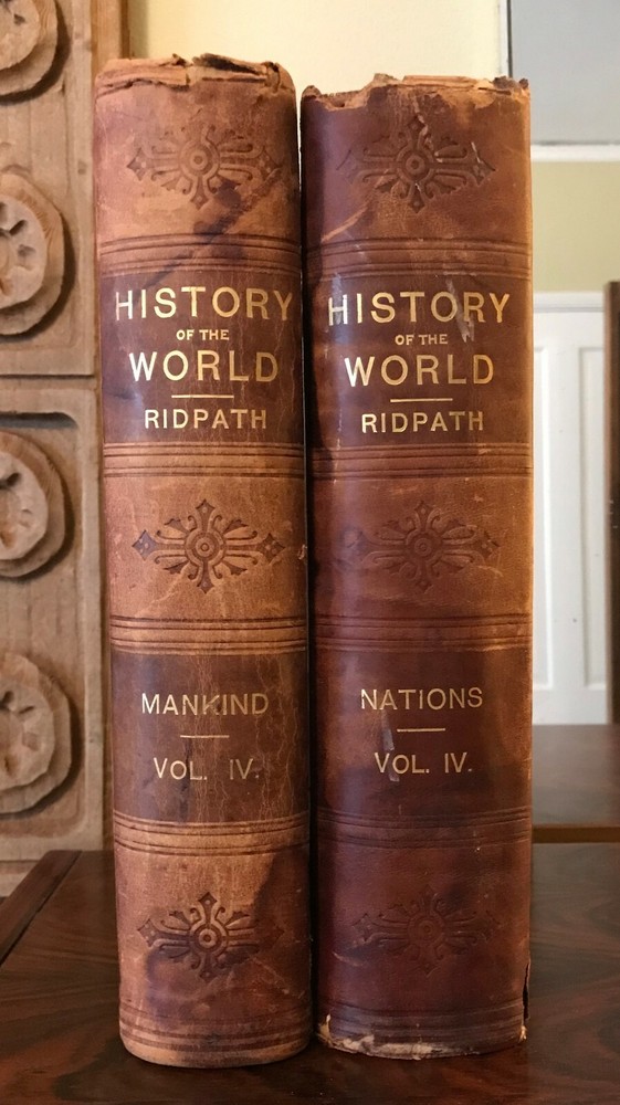History of the World By John Clark Ridpath Book Set - Mankind & Nations "Ridpath's History of the World - Being an Account of the Principal Events in the Career of the Human Race from the Beginnings of Civilization to the Present Time. Comprising The Development of Social Institutions and The Story of All Nations - From Recent and Authentic Sources. Complete in Four Volumes. By John Clark Ridpath, L.L.D. - Author of a "Cyclopedia of Universal History," Etc.- Profusely Illustrated with Colored Plates, Race Maps and Charts, Type Pictures, Sketches, and Diagrams - New York: Merrill & Baker, Publishers." 4 Volumes Total. (1) History of the World - Ridpath - Nations Vol. I - Binding has some wear & tear - has some rips and tears along the top edge. Pages in good condition with no significant damage noted. (2) History of the World - Ridpath - Nations Vol. II - Good Condition. Binding is a little loose. Pages are in good shape. There is some discoloration along the binding. (3) History of the World - Ridpath - Nations Vol. III - Good Condition. Binding has some discoloration along the left side with some minor tears along the top and bottom. Pages are in good shape. (4) History of the World - Ridpath - Nations Vol. IV - Good Condition. Binding has some smalls rips and tears on the top and bottom. Front and Back cover has a few scuff marks along the corners. Binding is a little loose. Pages are in good condition. "Ridpath's History of the World - Being An Account of the Ethnic Origin, Primitive Estate, Early Migrations, Social Conditions and Present Promise of the Principal Families of Men. Together With A Preliminary Inquiry on the Time, Place and Manner of the Beginning. Comprising The Evolution of Mankind and The Story of All Races. Complete in Four Volumes. By John Clark Ridpath, LL.D. - Author of a "Cyclopedia of Universal History," Etc. - Profusely Illustrated with Colored Plates, Race Maps and Charts, Type Pictures, Sketches and Diagrams - New York: Merrill & Baker, Publishers." 4 Volumes Total. (1) History of the World - Ridpath - Mankind Vol. I - Good Condition . Binding is a little loose and there is some damage along the top of the binding. Pages are in good condition. (2) History of the World - Ridpath - Mankind Vol. II - Good Condition. Binding has some rips on the top. Binding has some discoloration and is a little loose. (3) History of the World - Ridpath - Mankind Vol. III - Good Condition. Binding has been partially torn off. There are some scuff marks on the front and back cover. Pages are in good shape. (4) History of the World - Ridpath - Mankind Vol. IV - Good Condition. Pages in good shape. Binding is tight. There is some minor tears along the top of the binding. There is also a small discoloration on the bottom of the binding. Please view photos above carefully and feel free to ask any questions. Be sure to check out the other Antique book sets that we have available.