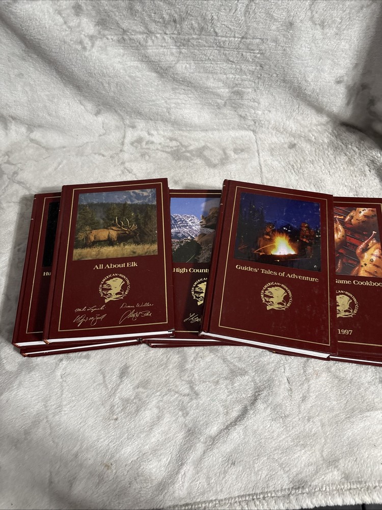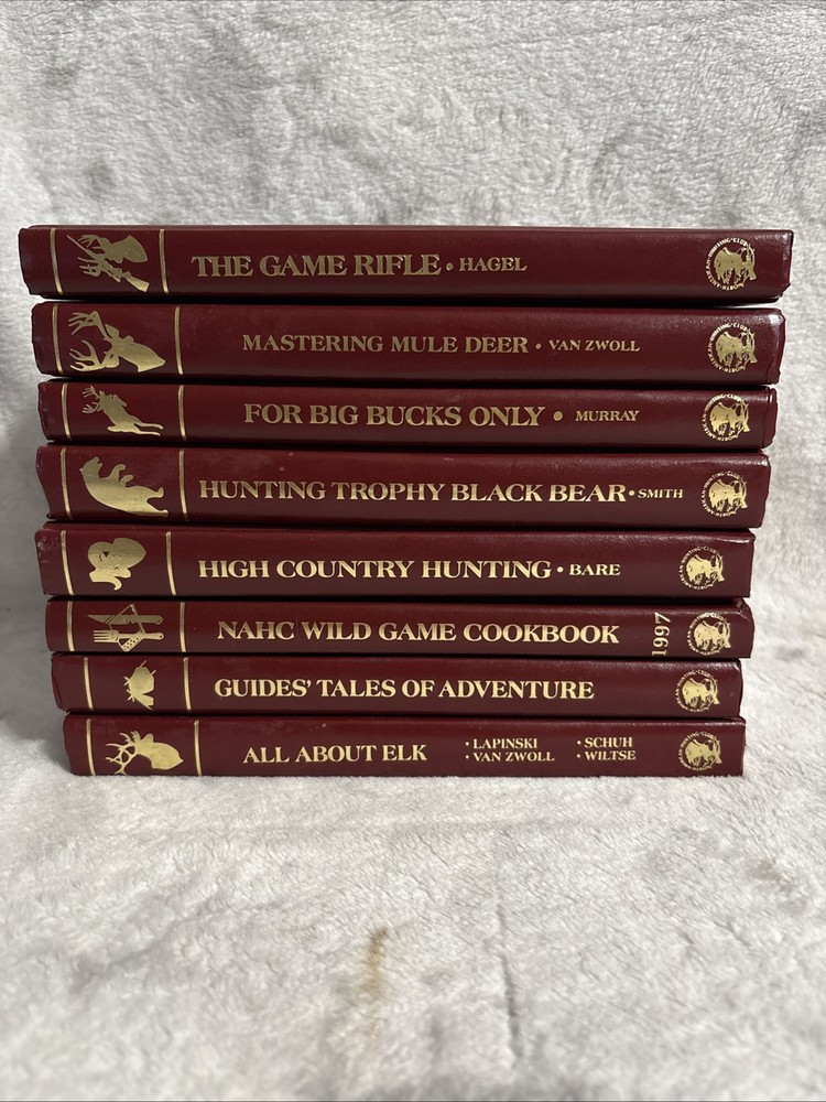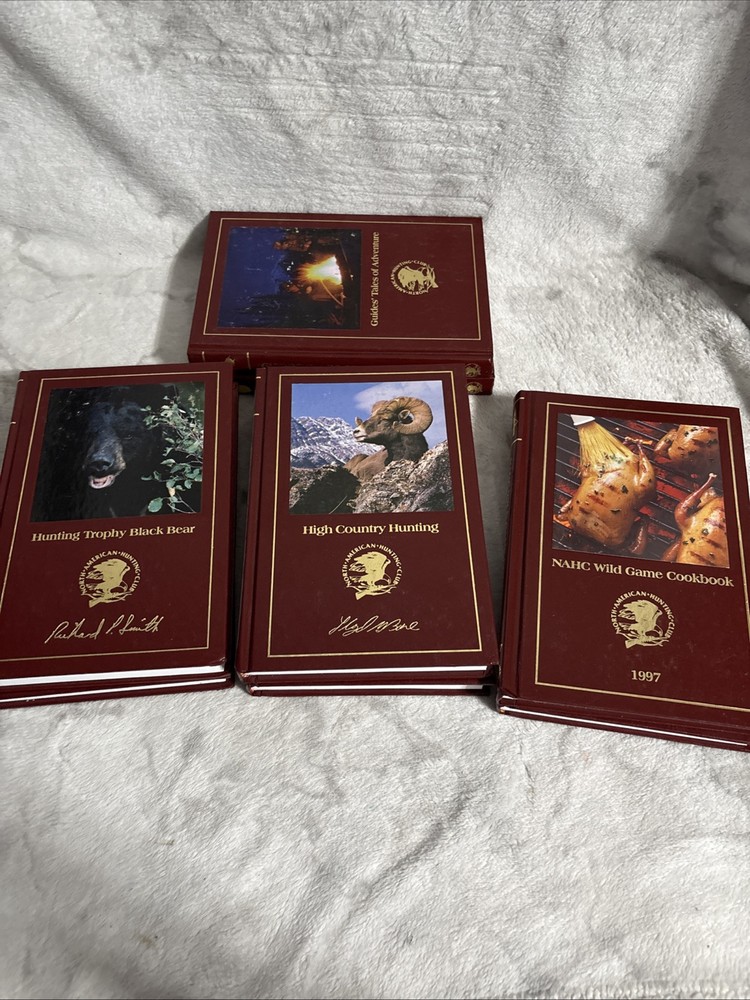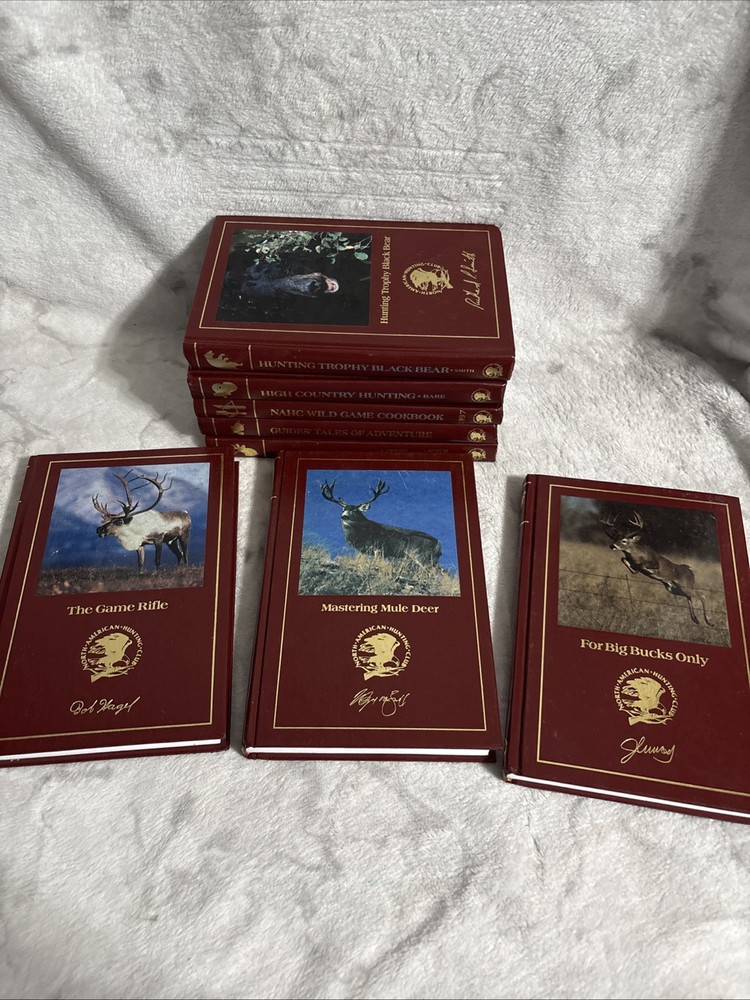 This product is a vintage hardcover book series by the North American Hunting Club, featuring "Hunting Whitetail Successfully" and seven other books. It is a collection of illustrated almanacs focusing on hunting and bow hunting, published in 1998. The books are intended for young adults and adults interested in adventure, leisure, hobbies, and sports. The edition is gilt and the format is faux leather bound with a box set.