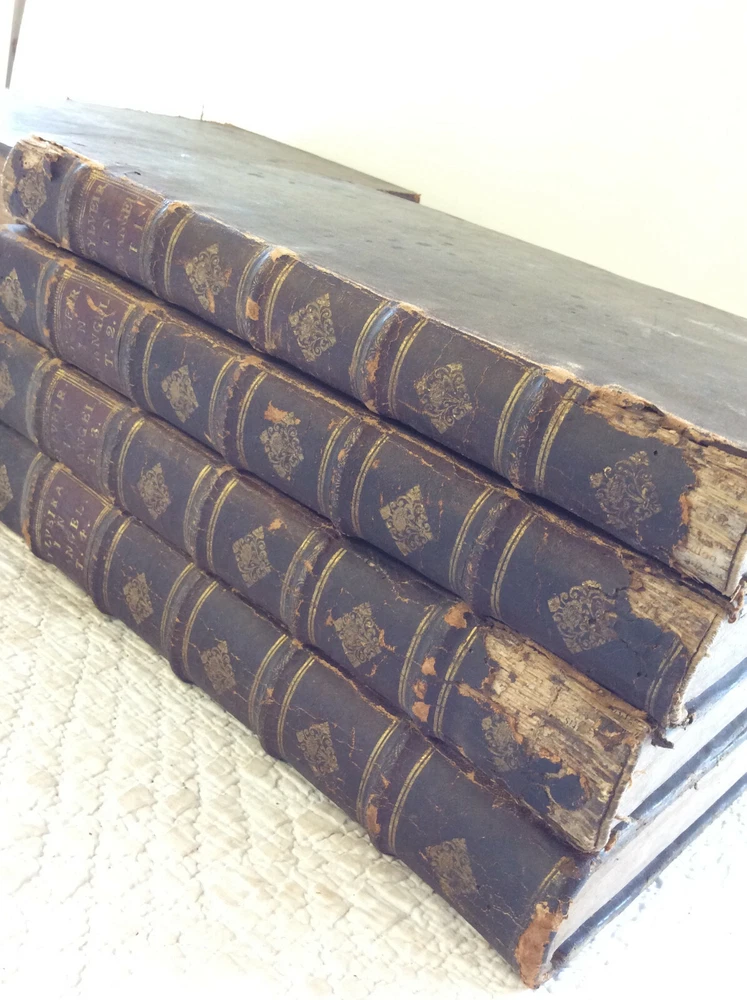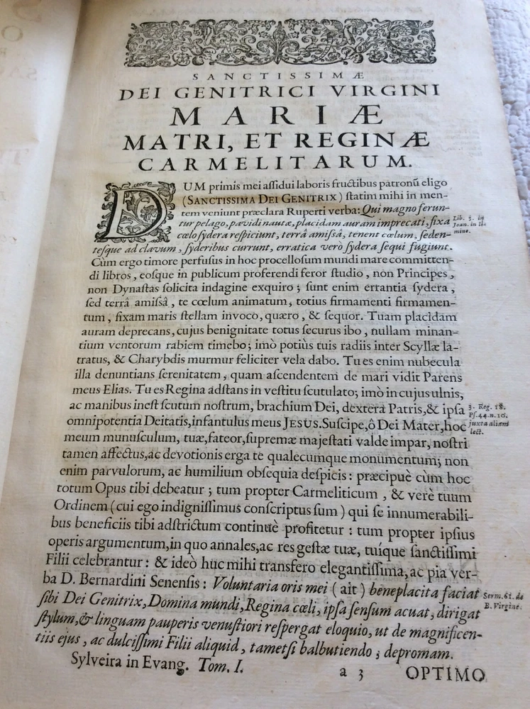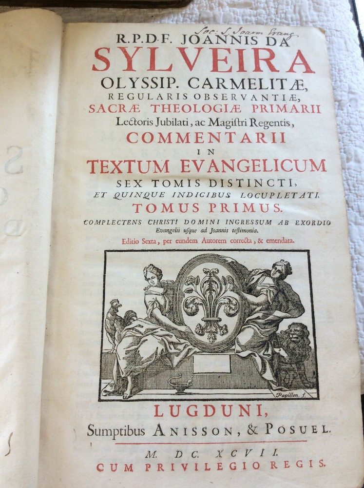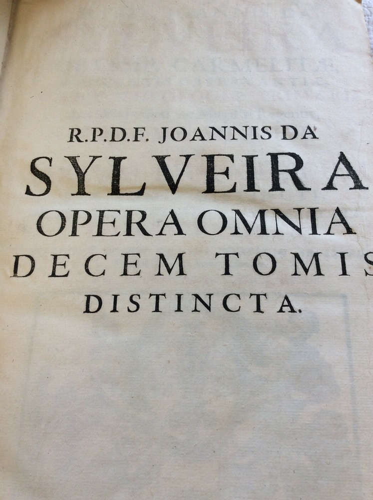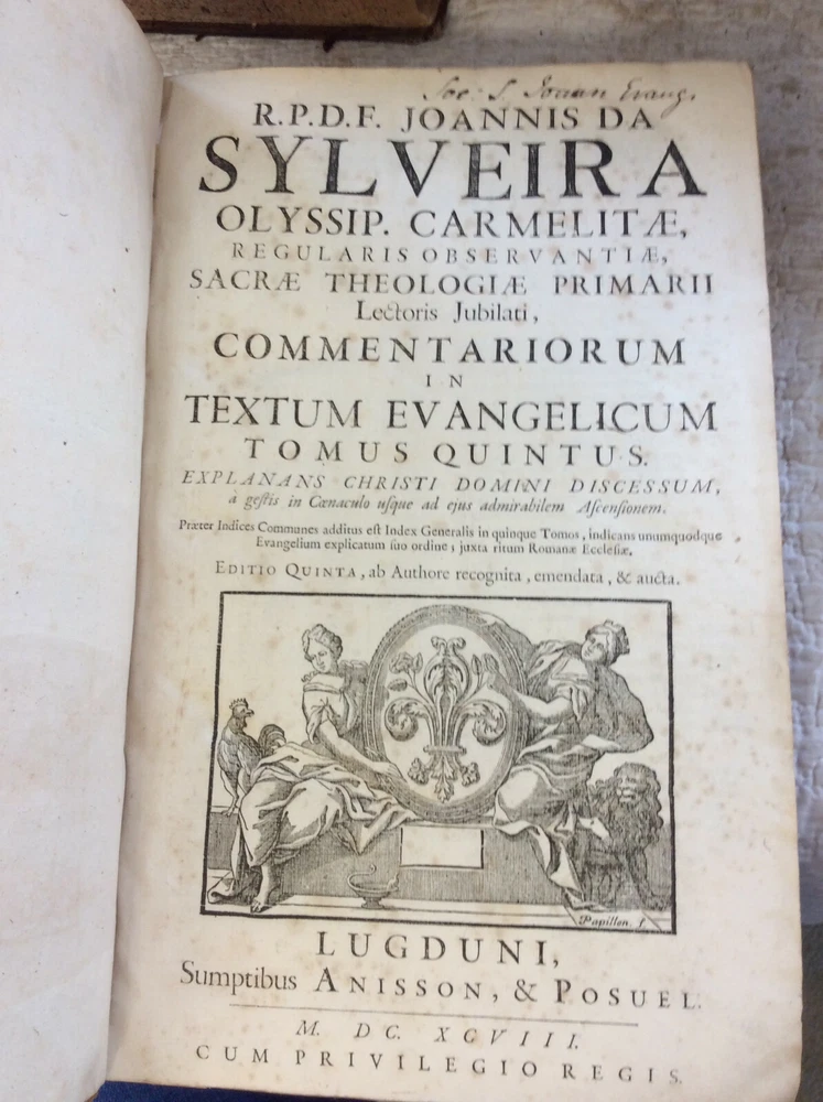 John de Sylveira (Joannis de Sylveira). COMMENTARII IN TEXTUM EVANGELICUM; COMMENTARIA IN ACTA APOSTOLORUM; OPUSCULA VARIA Lugduni: Anisson & Posuel, 1697-1725. Leather bound. Eight volumes. Mixed printings uniformly bound. Each volume is about 500 pages. Engraved title page in each volume. Folio. Bound in full 18th century leather. Spines worn with some loss of leather; cords are tight and intact. Minor soiling to some text pages but generally a solid set in good condition. Each book measures 9x14 inches and is about two inches thick. Text in Latin. This set of the Carmelite author's works includes a six-volume commentary on the Gospels - the first five volumes were published from 1697-1698 with the final volume containing "Additions of a Later Date" being published in 1725. There is also a Commentary on Acts published in 1701 and a selection of miscellaneous works from 1725. Sylveira had a great devotion to the Blessed Virgin Mary and has a number of interesting reflections on scripture passages which relate to her.