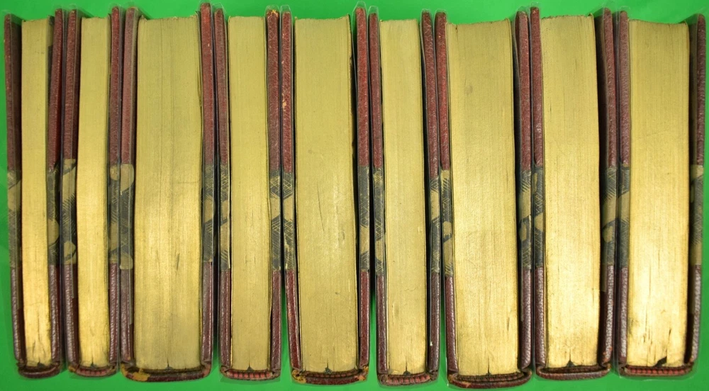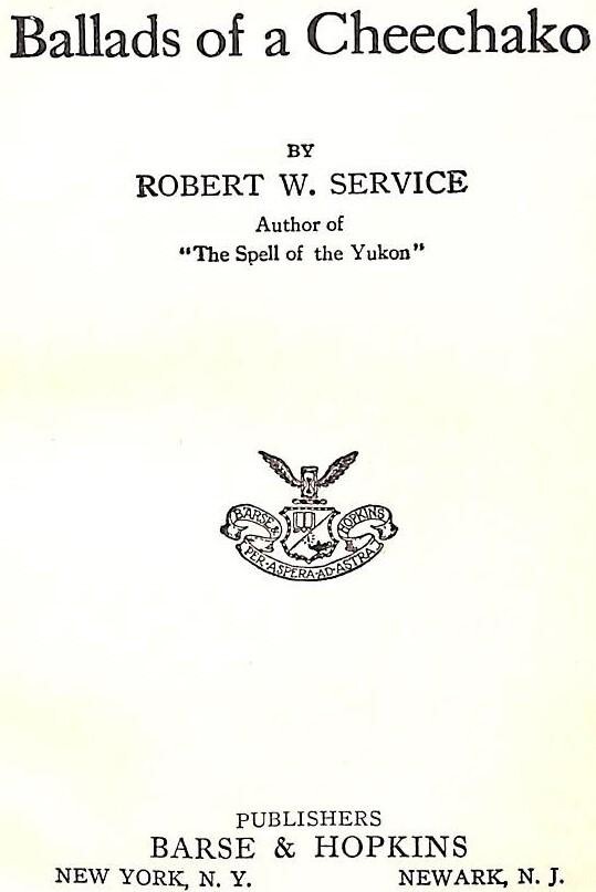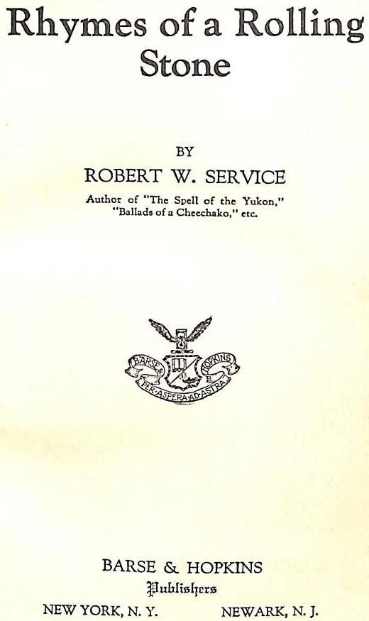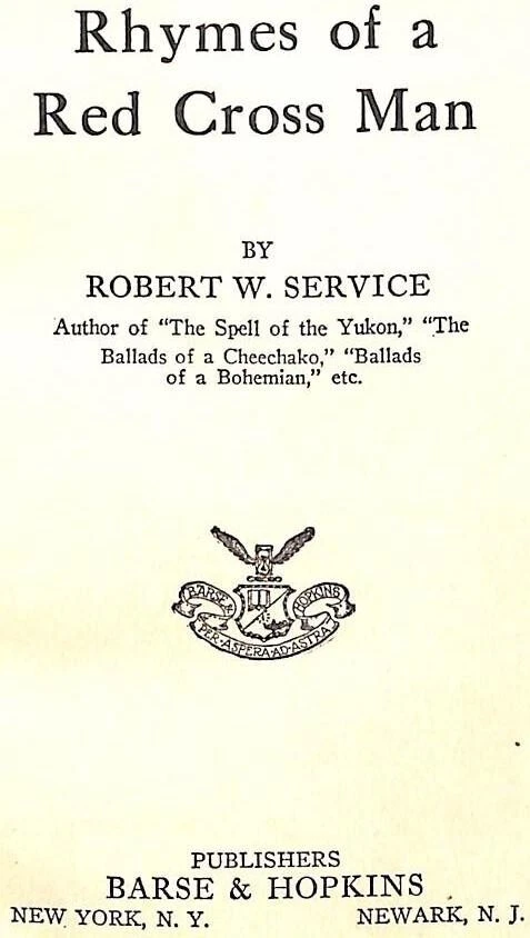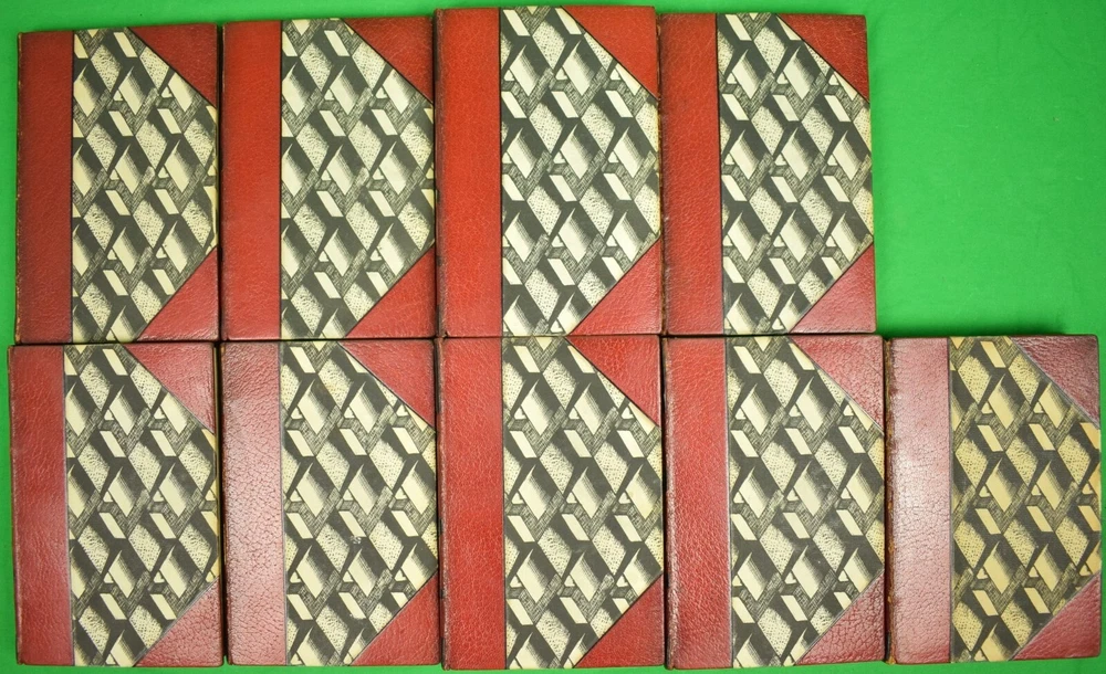 9 Volume Robert W. Service Leather Bound Set by Sangorski & Sutcliffe 1907-1928. 7.5inch x 5 inch 9volume set. Alas,lacking one volume. Boundby Sangorski and Sutcliff, London, England TheSpell of the Yukon and Other Verses. Barse and Hopkins 1907 126pp. Balladsof a Cheechako. Barseand Hopkins 1909 135pp. TheTrail of 98: a Northland Romance. 1910 514pp. Rhymesof a Rolling Stone. Barseand Hopkins 1912 172pp. ThePretender: a Story of the Latin Quarter. Dodd,Mead and Company 1914 349pp. Rhymesof a Red Cross Man. Barseand Hopkins 1916 192pp. TheRoughneck. Grossetand Dunlap 1923 448pp. TheMaster of the Microbe: a Fantastic Romance. Barseand Hopkins 1926 424pp. TheHouse of Fear. Dodd,Mead and Company FourthPrinting March, 1928 408pp.