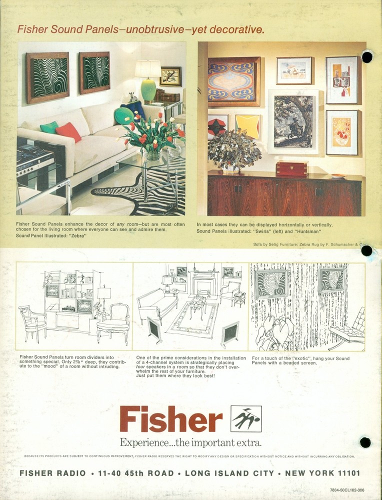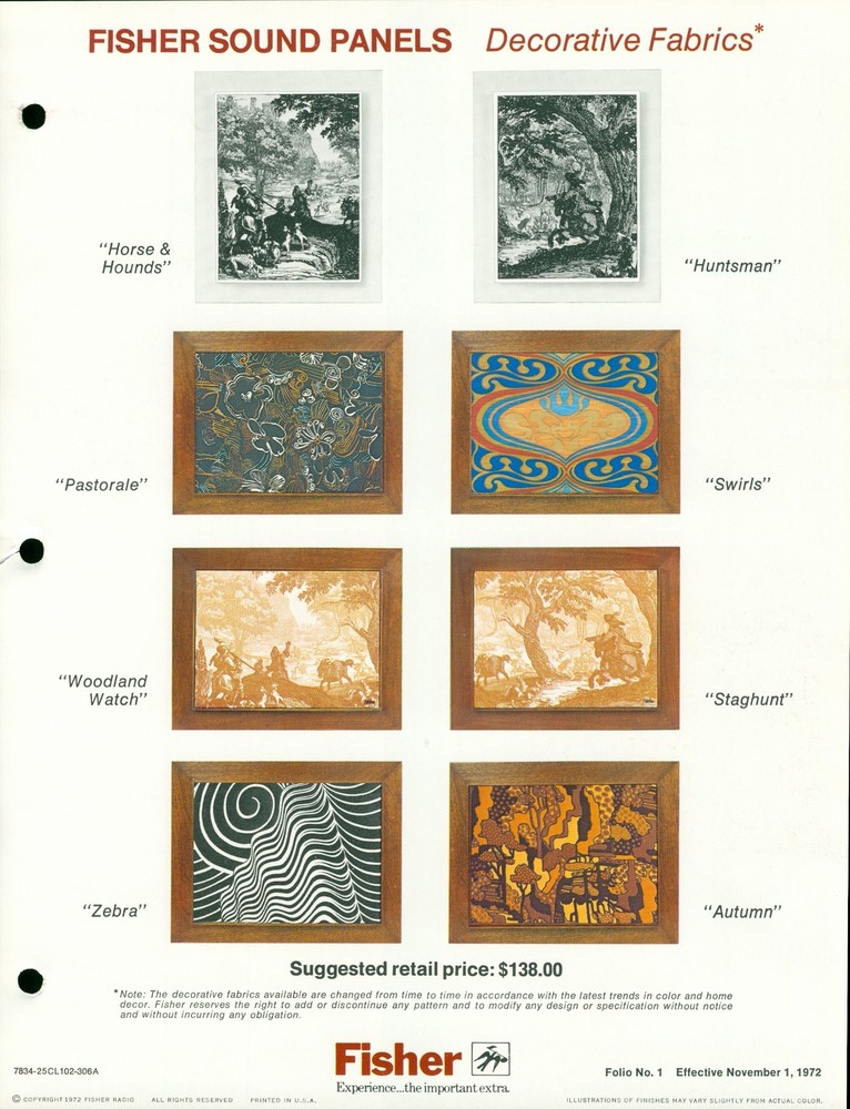 !972 Fisher HiFi Sound Panels Speaker Systems Vintage Dealer Brochure Audio Nice vintage dealer brochure measuring about 8.5" x 11" with six pages of details and illustrations. Item has had 3 hole punches added to margin. Good condition. Listing and template services provided by inkFrog