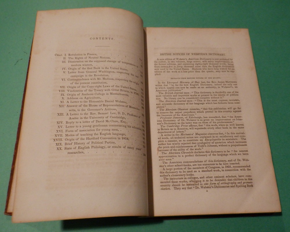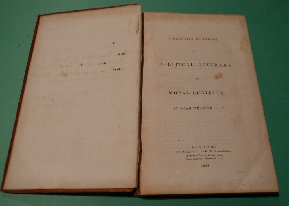 This is a Hardcover edition of A COLLECTION OF PAPERS on POLITICAL LITERARY and MORAL SUBJECTS by Noah Webster, LL. D This edition was published from Webster & Clark in 1843 and is in acceptable condition It is approx 9 by 6 in size and is 373 pages Please see photos and condition description for more details Please email questions