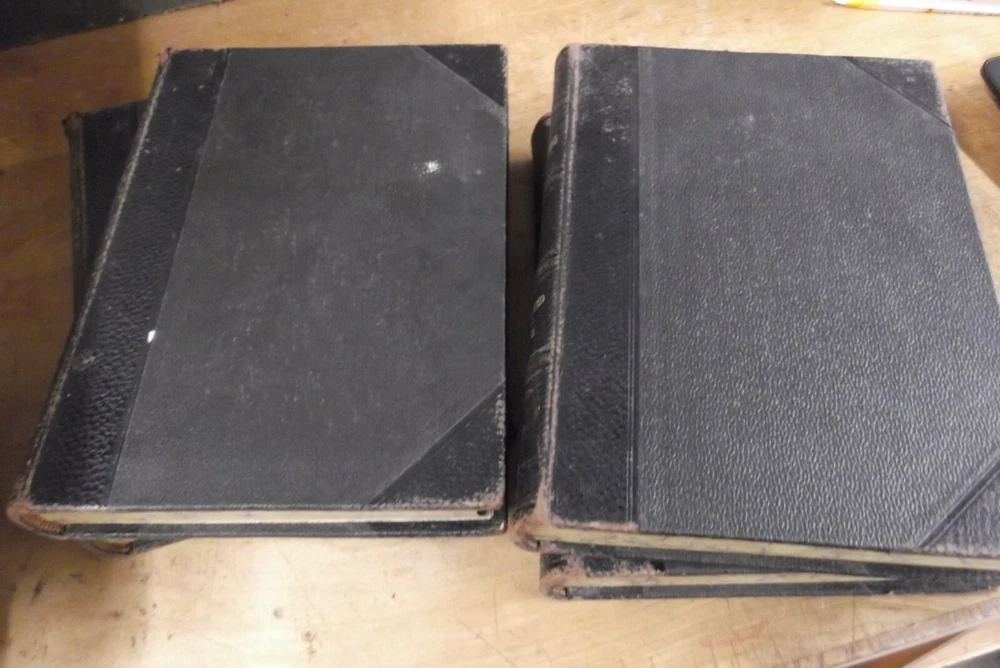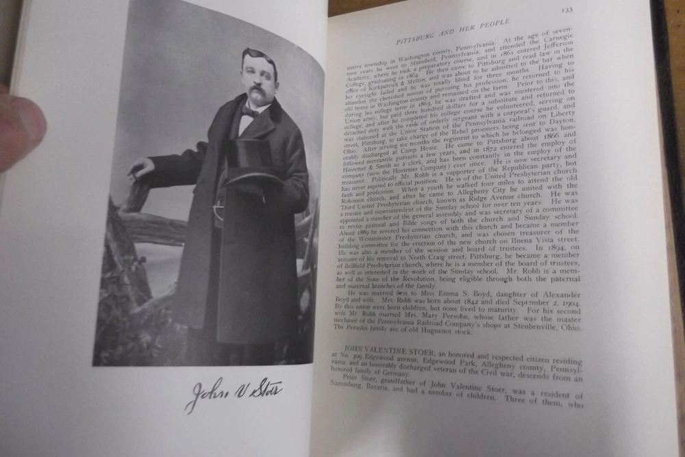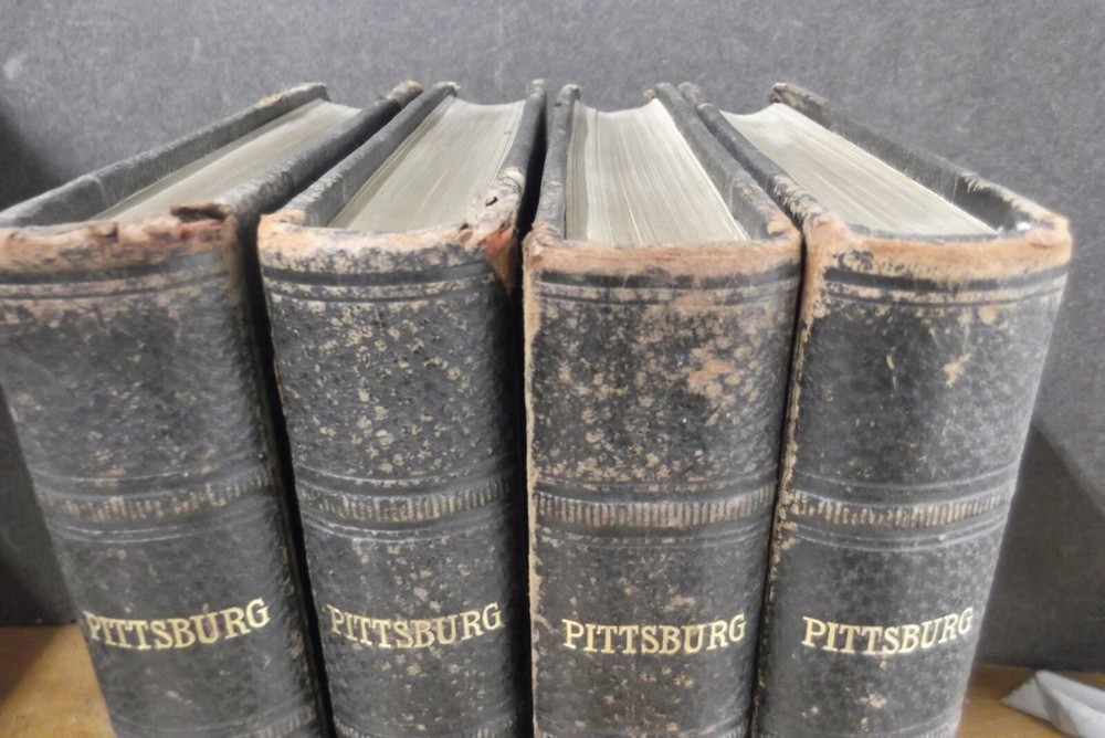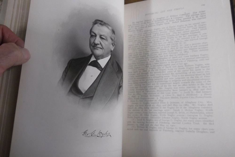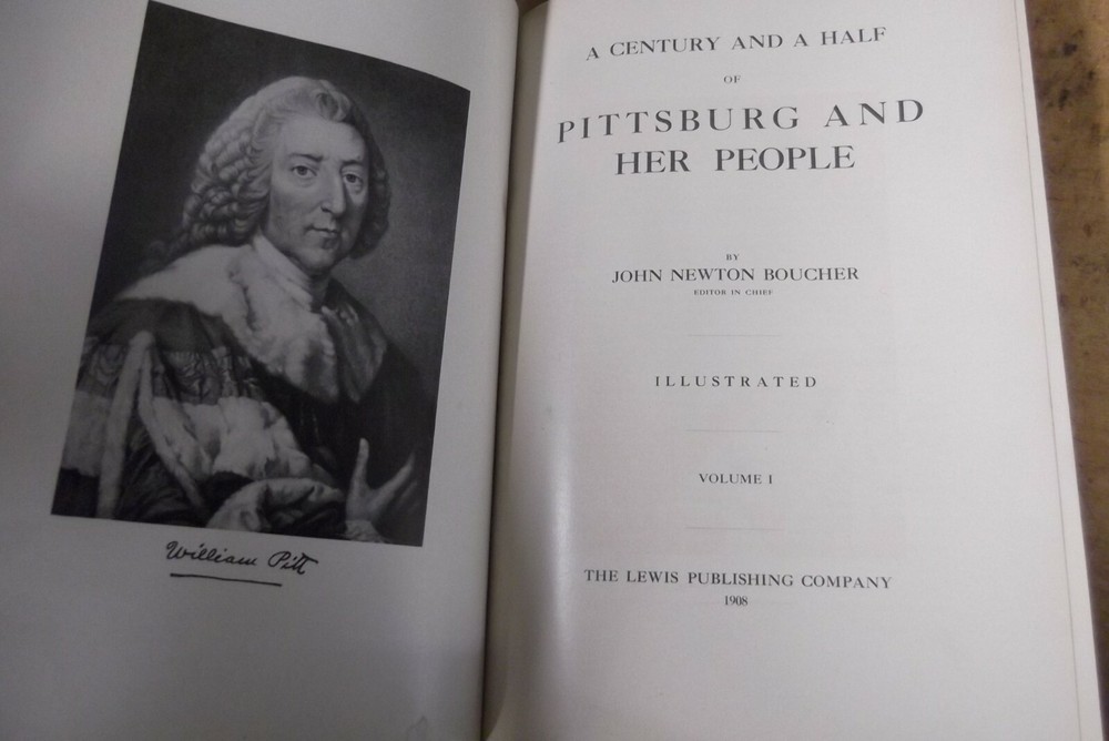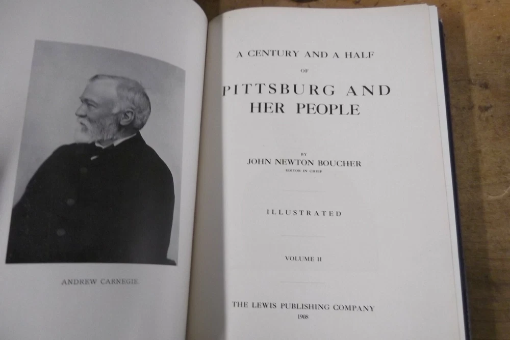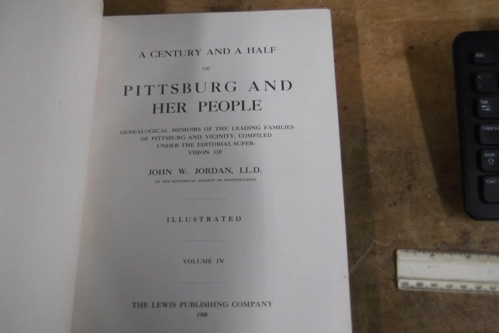 This is the complete 4-volume set of "A Century and a Half of Pittsburg(h) and Her People." Volumes I & II edited by John Newton Boucher; Vol. III & IV Supervising Editor John W. Jordan. Published by The Lewis Publishing Co., Pittsburg, 1908. Volumes are bound in full grained leather bindings. Wear/scuffing of leather to edges/corners. Very clean and tight. Books measure 8 X 10 1/2, 400-500 pages each. These original volumes are quite SCARCE--I have not been able to locate any other copies in all of my internet Searches. Contemporary reprints are available for upwards of $110 per volume!! I will offer this solid, complete original set for only $375.00 plus $17.50 S&H in the US. Thanks for shopping mellowpagesrarebooks.com