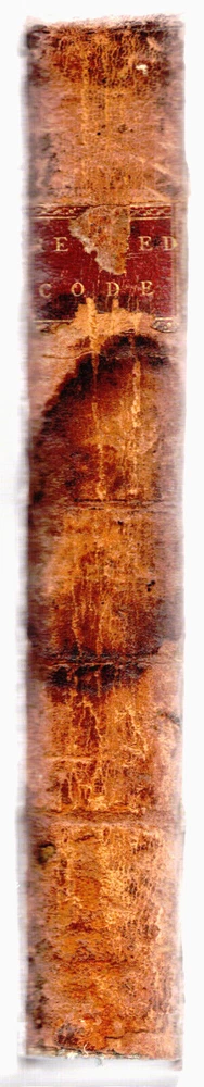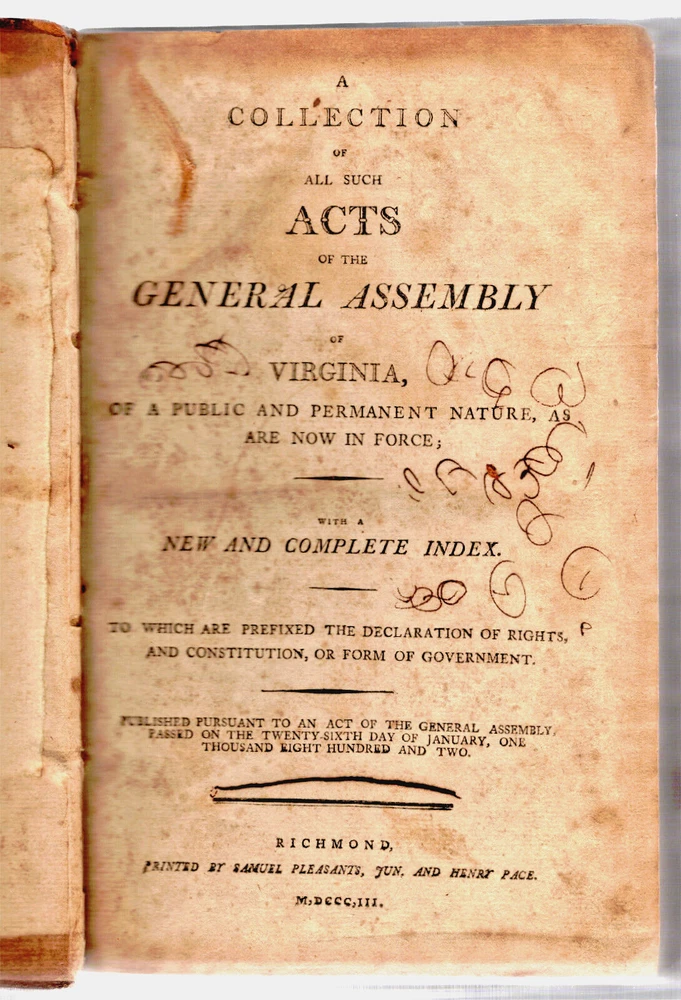 A Collection of All Such Acts of the General Assembly of Virginia, of a Public and Permanent Nature, as are Now In Force, with a New and Complete Index, to which are Prefixed the Declaration of Rights, and Constitution, or Form of Government, Published Pursuant to An Act of The General Assembly, Passed on the Twenty-Sixth Day of January, One Thousand Eight Hundred and Two, printed by Samuel Pleasants, Jun., and Henry Pace, Richmond, VA, MDCCCIII - 1803 — 454 pages followed by a 72-page Index — measures: 6 1/2" x 10 3/8" x 1 5/8" — leather bound hardcover [front board detached, but with book] — to ship boxed.