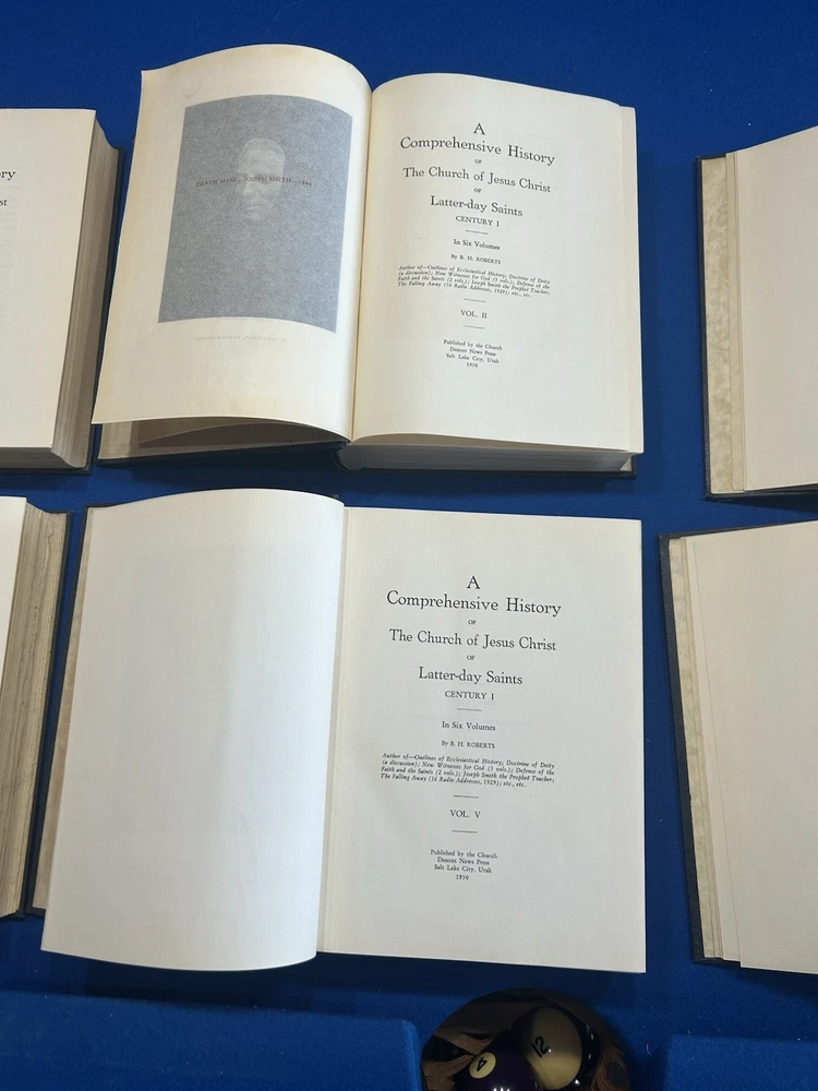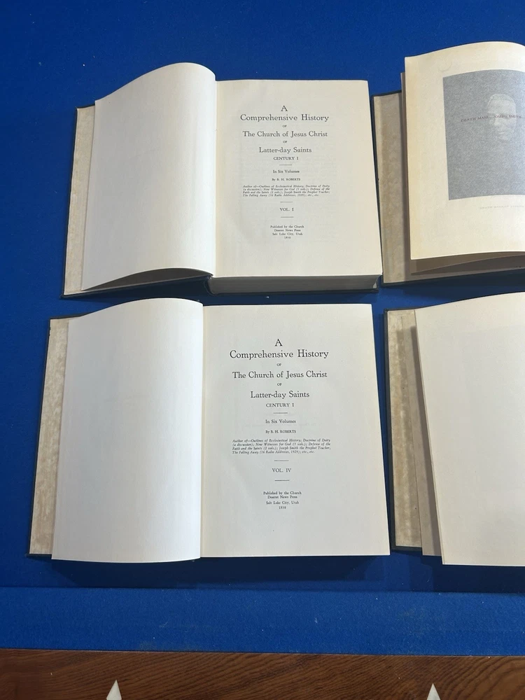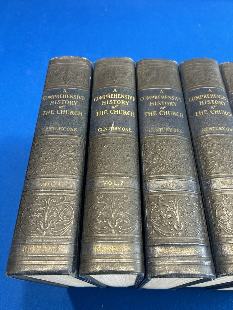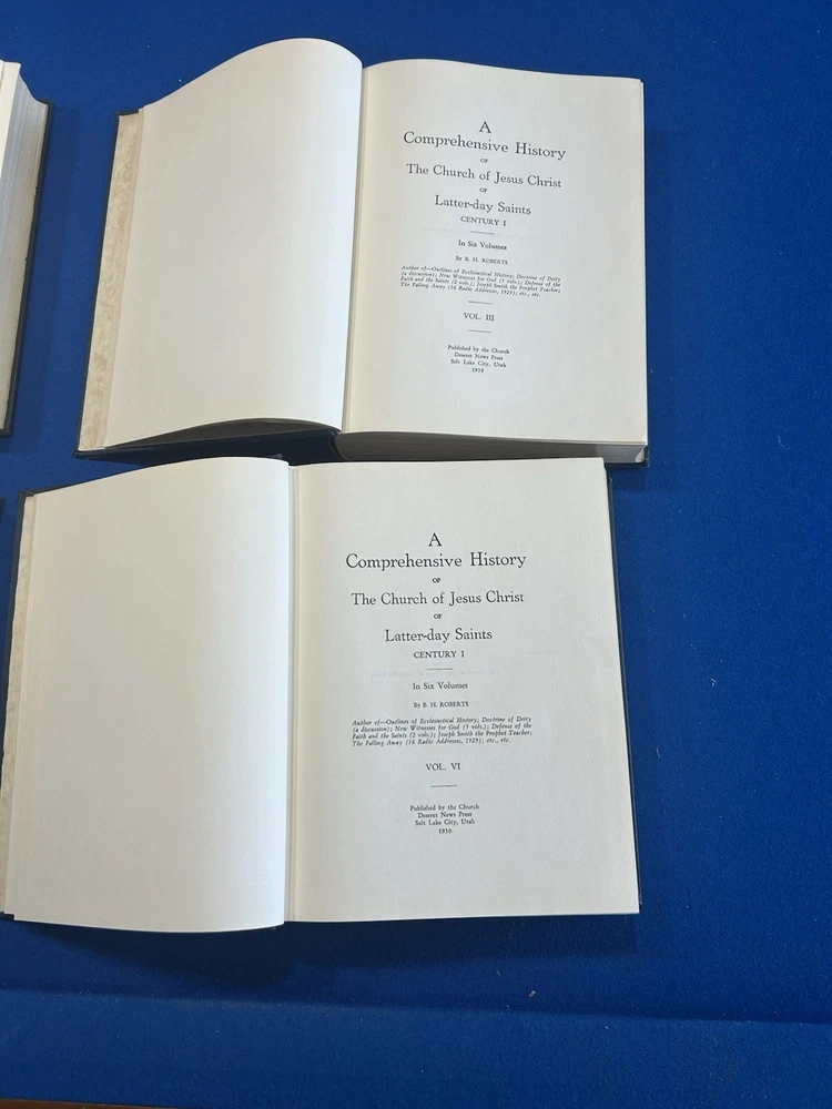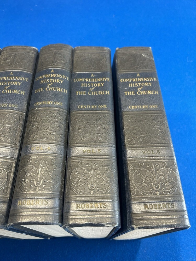 A Comprehensive History of The Church of Jesus Christ of LDS, 6 Vol Set, 1930 Very little underlining in volume three about 20 pages. B.H. Roberts, First Edition set of six volumes 1930 Note A Comprehensive History of The Church of Jesus Christ of Latter-day Saints: Century I is a six-volume history published in 1930 and written by B.H. Roberts, a general authority and Assistant Church Historian of the Church of Jesus Christ of Latter-day Saints. Description Dark blue leather mixed volume set with embossing and blind tooling on front cover and spine with gold