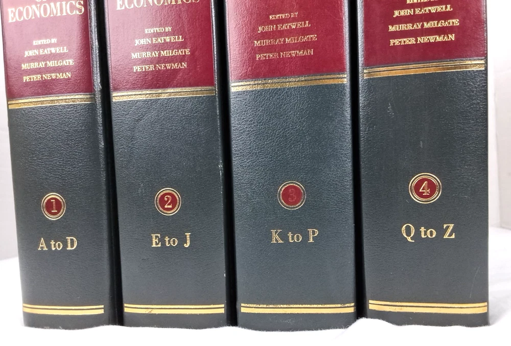 Vintage four-volume set titled "The New Palgrave: A Dictionary of Economics" by John Eatwell, originally published in 1988. Contents: Volume 1: A to D Volume 2: E to J Volume 3: K to P Volume 4: Q to Z