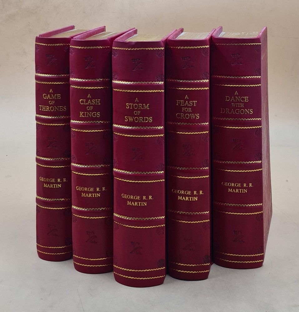 GYAN BOOKS INTRODUCING A REMARKABLE LEATHER-BOUND EDITION, METICULOUSLY CRAFTED BY THE ESTEEMED INSTITUTION " RARE BIBLIO". This title holds the distinction of being a Bestseller, highly praised by readers across the GLOBE. We are thrilled to present this literary gem exclusively to our elite readers, meticulously encased in our one-of-a-kind Premium Leather Binding . Following your order, we purchase the book from the original publisher/distributor and embark on the process of rebinding to elevate this book to a Luxurious Reading Style. A UNIQUE LEATHER-BOUND BOOK FOR ELITE READERS/COLLECTORS OF OLD RARE AND BESTSELLING BOOKS. For the Binding, we use GENUINE LEATHER , graced with opulent GOLDEN LEAF DETAILING on the SPINE , FRONT COVER , AND BACK COVER , ADDED BY EDGE GILDING . ABOUT US ★ We deal into reprinting of the master pieces crafted by authors around the world. ★ We are proud to say that we have a collection of over 25 million books and our collection includes books that are as old as 200 years and hence are considered as RARE BOOKS. ★ We are pioneer in this field having experience of 40 years. ★ We also undertake printing and Leather Binding jobs of other books. ★ Thesis printing and Leather Binding is one of our important Service ★ Many publishers and author approach us for their books to bind in our Unique leather binding format for their special customers. ★ Our craftsmen are active in this job since generations. ★ Restoration of old books is our expertise ★ We are known by our Customization options. ★ We have many leather color options in our bucket. ★ The whole process is done manually so that it gives you the same feeling of old book. OFFERS & SPECIALIZATION: ★ SPECIAL DISCOUNT FOR BULK ORDERS, PLEASE CONTACT US. ★ CHOOSE ANY LEATHER COLOR OF YOUR CHOICE WITHOUT ANY EXTRA CHARGES, JUST CLICK ON IMAGES FOR OPTIONAL COLORS AND INFORM US YOUR CHOICE THROUGH MAIL WITH COLOR CODE. ★ WE OFFER A DIVERSE RANGE OF LEATHER COLORS, INCLUDING RED , GREEN , BLUE , BLACK, MAGENTA , YELLOW , TAN . WE ALSO OFFER MULTI-COLOR LABELS WITH THESE BEAUTIFUL BOOKS ON SPECIAL REQUEST. ★ AN ORIGINAL LEATHER IS BEING USED FOR BINDING THIS BOOK WITH GOLDEN LEAF PRINTING AND DESIGNING ON SPINE, FRONT AND BACK OF THE BOOK WITH EDGE GILDING . Points to note before booking order: ★ In case of multi volume sets, please note that the above listing is for a single volume only. (To order multiple volumes, please contact us separately). ★ We urge you to appreciate that our Leather-Bound Books are Genuine works of art and are Handcrafted by our Professional Craftsmen. Thus, requiring time and care to reach the pinnacle of excellence. ★ We Prepare the Book after receiving the Order. ★ We usually take 30 business days as handling time to dispatch shipment. ★ We request you to understand that these leather-bound books are work of art and hence require time to go through different process to be the master pieces that they are. ★ We usually take 30 business days as handling time to dispatch shipment. We consider special request for a special occasion. ★ Craftsman based in India, prepared this book and shipped from different stock locations around the Globe. Product Details: - ★ Complete Title: A Game of Thrones Leather-Cloth Boxed Set: A Game of Thrones, a Clash of Kings, a Storm of Swords, a Feast for Crows, and a Dance with Dragons by Martin, George R. R. [PREMIUM LEATHER BOUND] ★ Author: Martin, George R. R. ★ Language: English ★ No. Of Pages: 5280 ★ Year: 2015 ★ We provide ?Extra customization*? on request with additional charges. ★ We also undertake printing and Leather Binding of all the books. ★ Product Disclaimer: Please be aware that because leather is a natural material, slight discoloration or change in texture may be visible. About the Book: - Perfect for fans of the epic fantasy series that inspired HBO's Game of Thrones--a gorgeous boxed set featuring conveniently sized leather-cloth-bound editions of the first five novels! An immersive entertainment experience unlike any other, A Song of Ice and Fire has earned George R. R. Martin--dubbed "the American Tolkien" by Time magazine--international acclaim and millions of loyal readers. Now the monumental saga gets the royal treatment it deserves, with each book wrapped in bound leather-cloth covers and packaged together in an elegant display case. This one-of-a-kind boxed set includes: A GAME OF THRONES A CLASH OF KINGS A STORM OF SWORDS A FEAST FOR CROWS A DANCE WITH DRAGONS "One of the best series in the history of fantasy."--Los Angeles Times Winter is coming. Such is the stern motto of House Stark, the northernmost of the fiefdoms that owe allegiance to King Robert Baratheon in far-off King's Landing. There Eddard Stark of Winterfell rules in Robert's name. There his family dwells in peace and comfort: his proud wife, Catelyn; his sons Robb, Brandon, and Rickon; his daughters Sansa and Arya; and his bastard son, Jon Snow. Far to the north, behind the towering Wall, lie savage Wildings and worse--unnatural things relegated to myth during the centuries-long summer, but proving all too real and all too deadly in the turning of the season. Yet a more immediate threat lurks to the south, where Jon Arryn, the Hand of the King, has died under mysterious circumstances. Now Robert is riding north to Winterfell, bringing his queen, the lovely but cold Cersei, his son, the cruel, vainglorious Prince Joffrey, and the queen's brothers Jaime and Tyrion of the powerful and wealthy House Lannister--the first a swordsman without equal, the second a dwarf whose stunted stature belies a brilliant mind. All are heading for Winterfell and a fateful encounter that will change the course of kingdoms. Meanwhile, across the Narrow Sea, Prince Viserys, heir of the fallen House Targaryen, which once ruled all of Westeros, schemes to reclaim the throne with an army of barbarian Dothraki--whose loyalty he will purchase