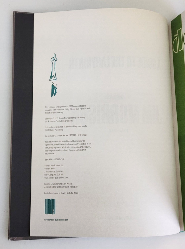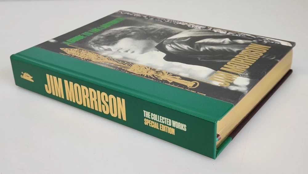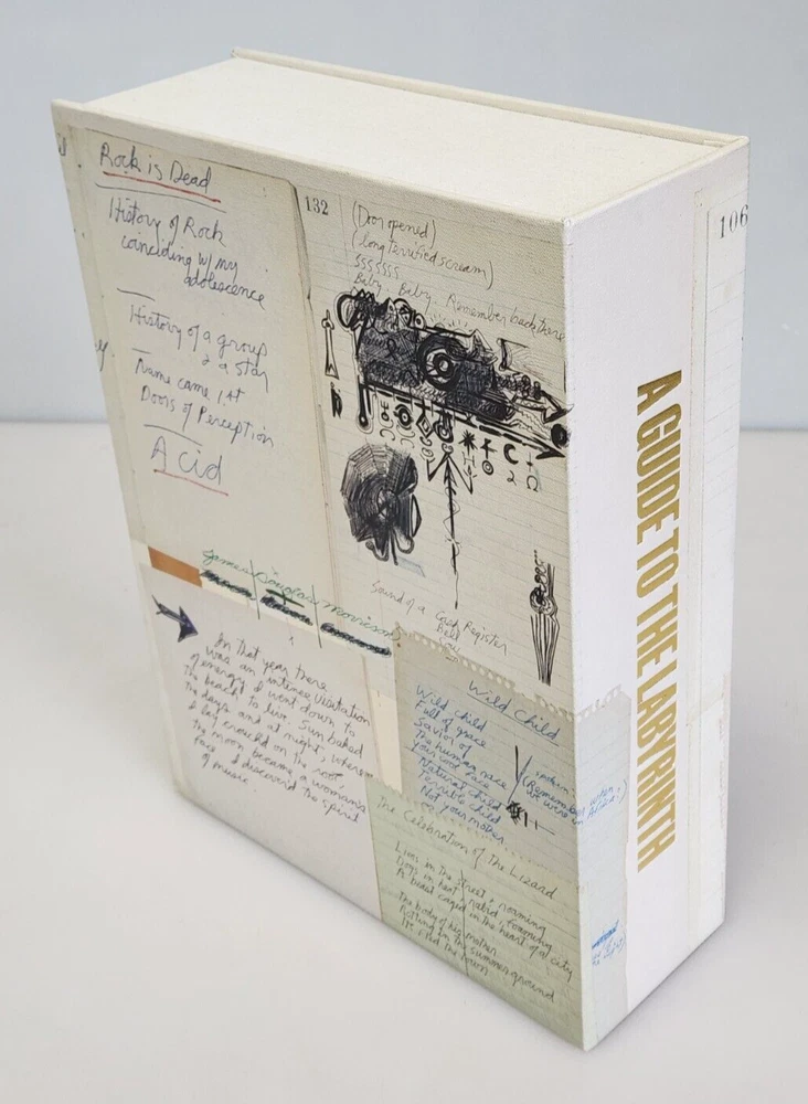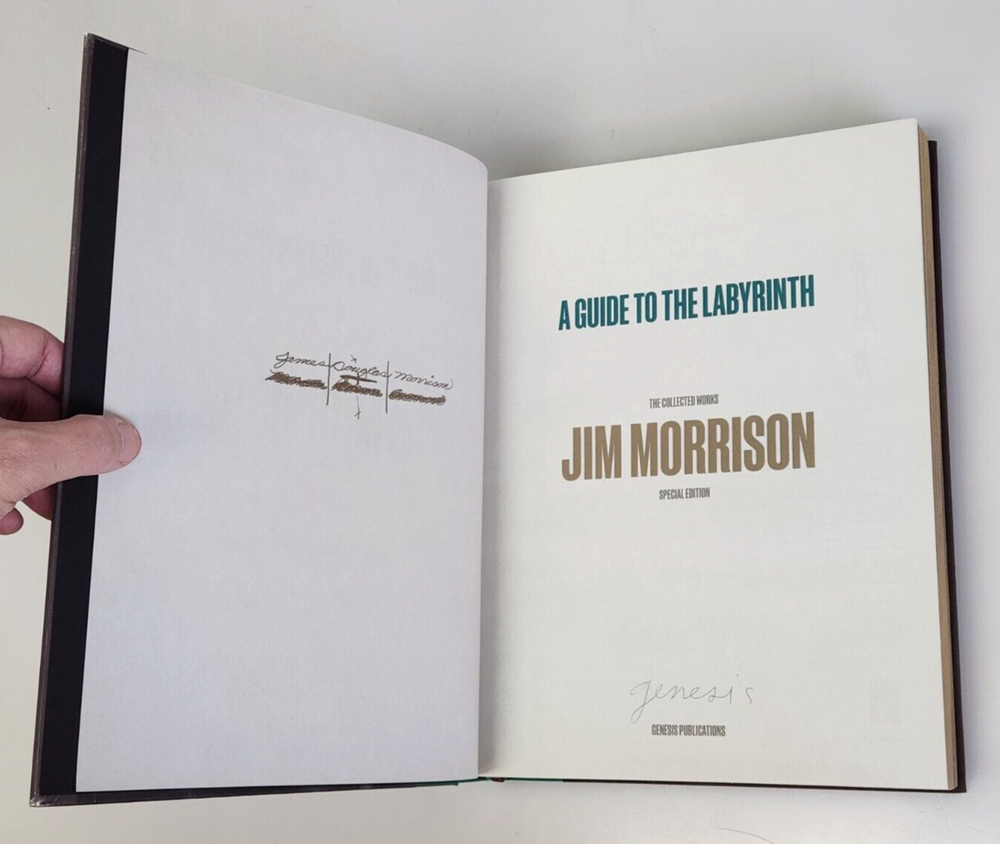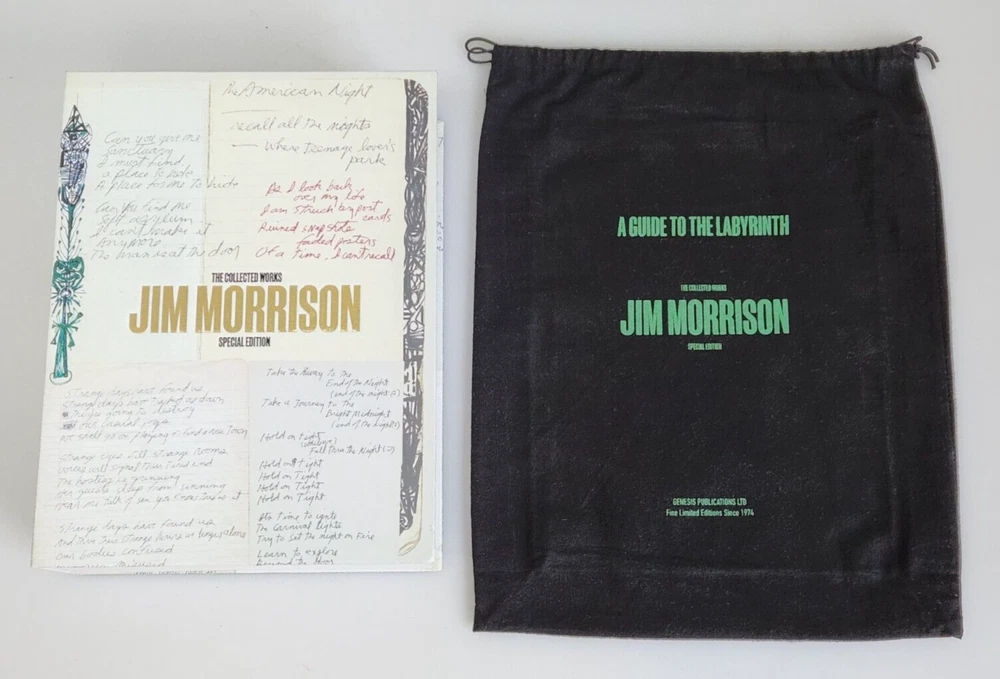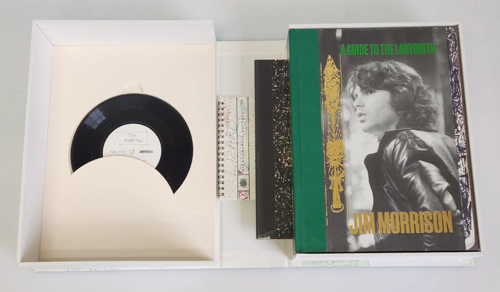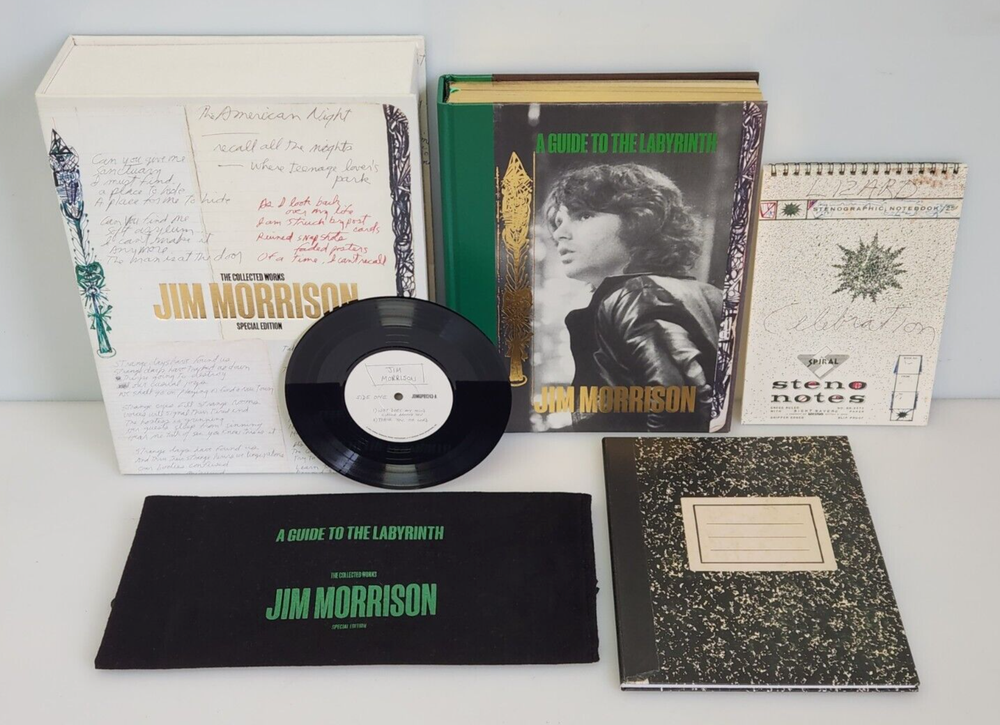 A Guide to the Labyrinth The Collected Works of Jim Morrison Limited Book #1683 Title: A Guide to the Labyrinth - The Collected Works of Jim Morrison ISBN: 9781905662708 Limited: #1683 / 2000 copies Signed by: Robby Krieger, John Densmore, Anne Morrison, Andy Morrison Contributors: Nearly 30 contributors including Alice Cooper, John Densmore, Perry Farrell, Billy Gibbons, Robby Krieger, Ian McCulloch, Anne Morrison, Andy Morrison, Iggy Pop and Grace Slick Binding: Quarter vegan leather with gold tooling and gilt page edging Box: Silk-screened Solander case with gold tooling Extras: Actual-size replica of Jim Morrison's personal notebook 'Number 13', Actual-size replica of Jim Morrison's personal notebook 'Number 15', 7" vinyl disc containing five Jim Morrison poetry recordings Item is used with light signs of wear. The books have some very light edge wear and light creasing on the bindings from being opened. All pages are free of any tears, stains, or other major damage. The vinyl album has a few light scratches due to previous use. Includes only items pictured. Please view photos for more detail. Thank you 102124 NS EJJ-N4