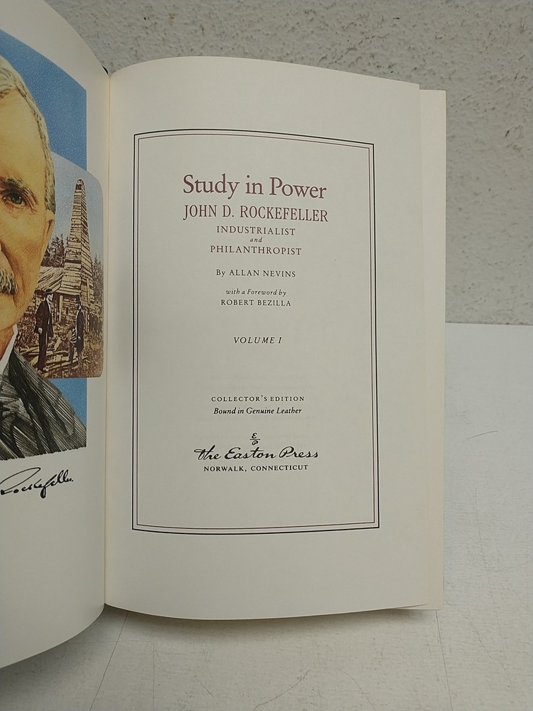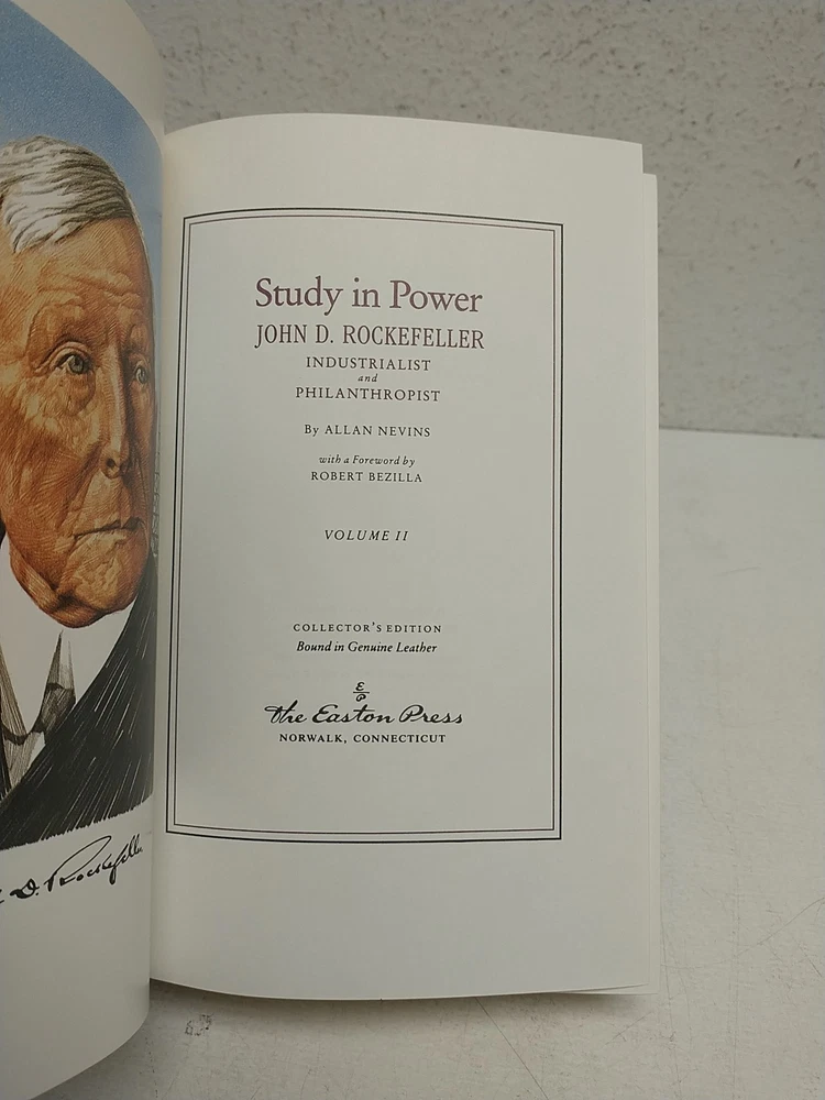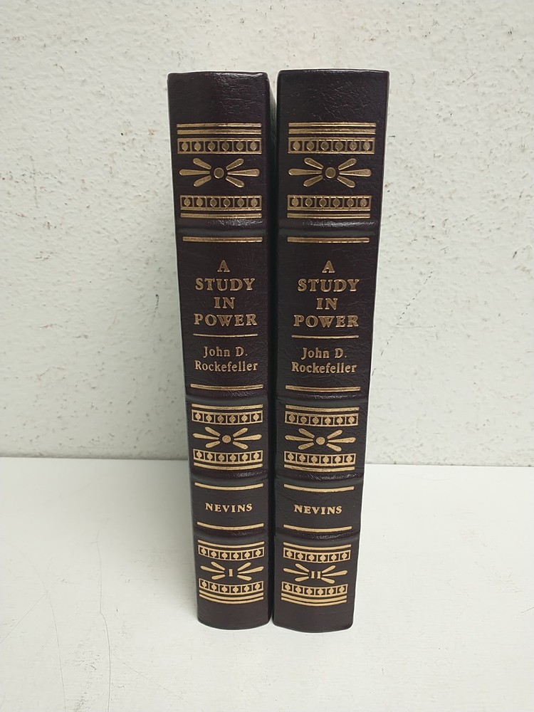 Corporate ambition and the rise of American industry are examined in A Study in Power: John D. Rockefeller by Allan Nevins, presented here in a two-volume leatherbound set from Easton Press. Both volumes are finely bound in full leather with intricate gilt stamping, hubbed spines, archival-quality pages, moiré silk endpapers, and satin ribbon markers. This set reflects Easton Press’s signature blend of durability and elegance, ideal for collectors of American history and biography. Nevins offers a comprehensive and nuanced portrait of one of the most powerful and controversial figures in U.S. economic history. Through detailed research and compelling narrative, the biography traces Rockefeller’s rise through the oil industry, the formation of Standard Oil, and his far-reaching philanthropic legacy. These volumes provide both critical insight and historical depth, making them essential for readers interested in capitalism, power, and the individuals who shaped modern America. Pre-Owned. See photos for condition. Ships via USPS Media Mail. Please message with any questions. We ship Monday-Friday.