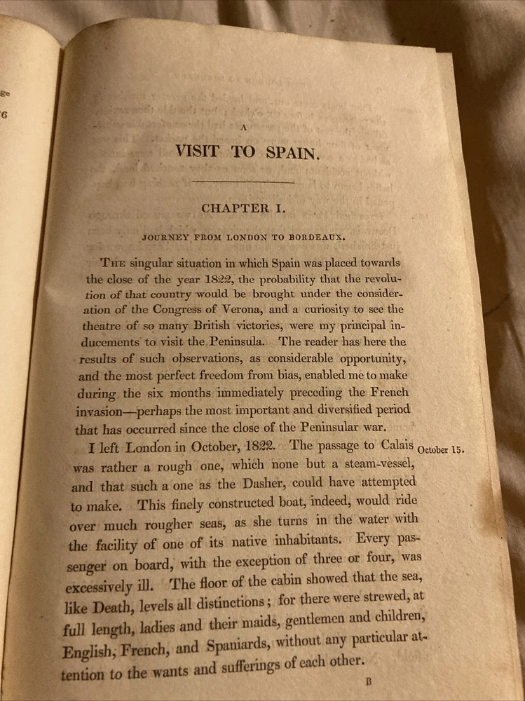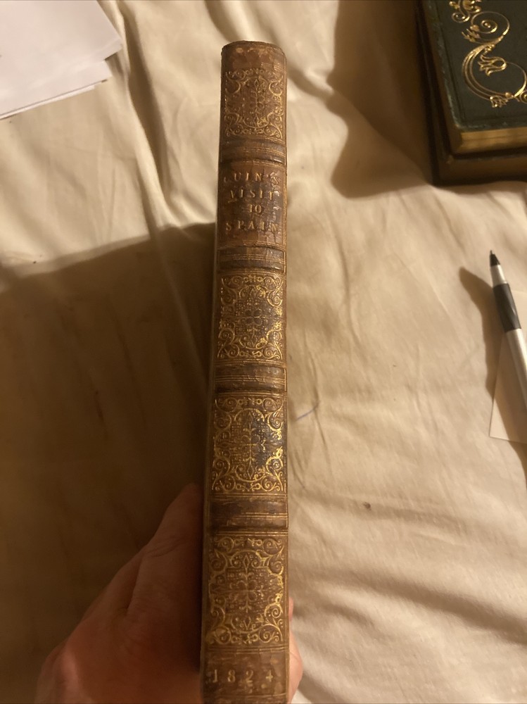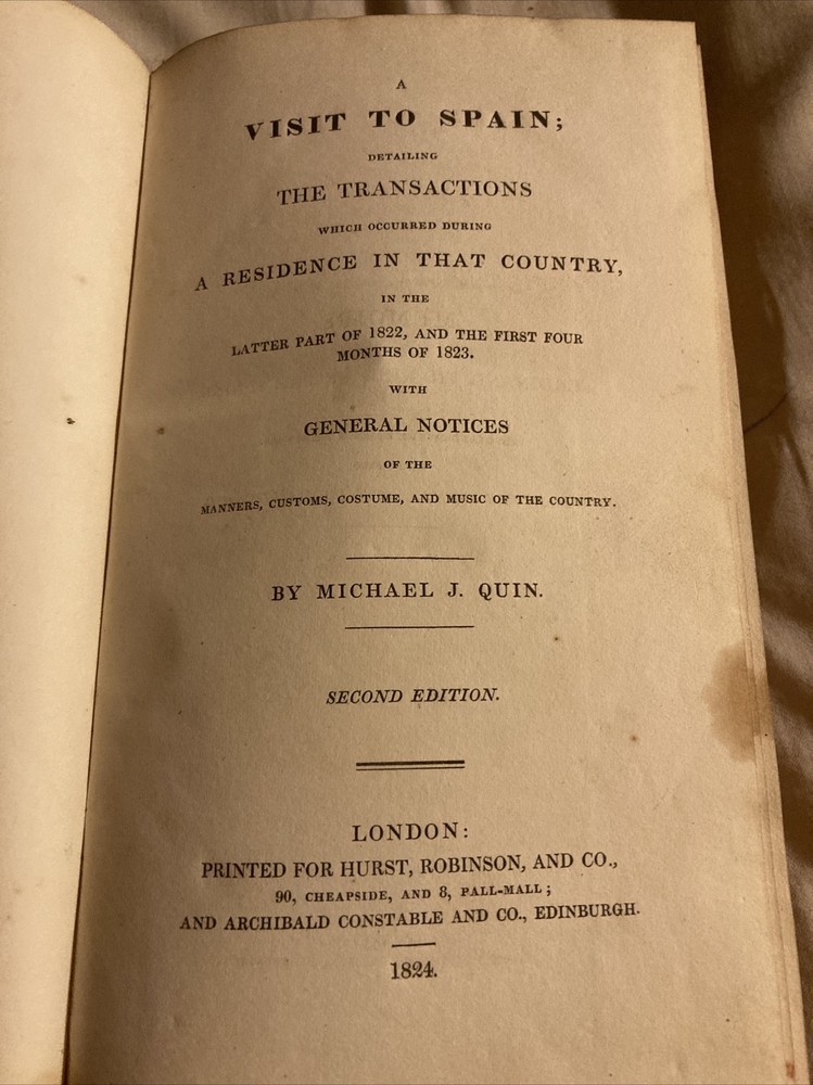 A Visit To Spain By Michael Quin 1824 2nd Edition HC Leather Bound . Shipped with USPS Media Mail. Quin, Michael J. A VISIT TO SPAIN detailing the Transactions which occurred during A Residence in that Country in the latter part of 1822, and the first four months of 1823. With General Notices of the Manners, Customs, Costume, and Music of that Country. LONDON: Printed for Hurst, Robinson, and Co., 1824. SECOND edition. Octavo, orig. or very early gilt-stamped 3/4 calf over marbled boards. Very early engraved armorial bookplate of George HOPER affixed to front pastdown endpaper. Spot on fore-edge else good to very good.