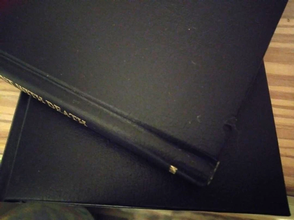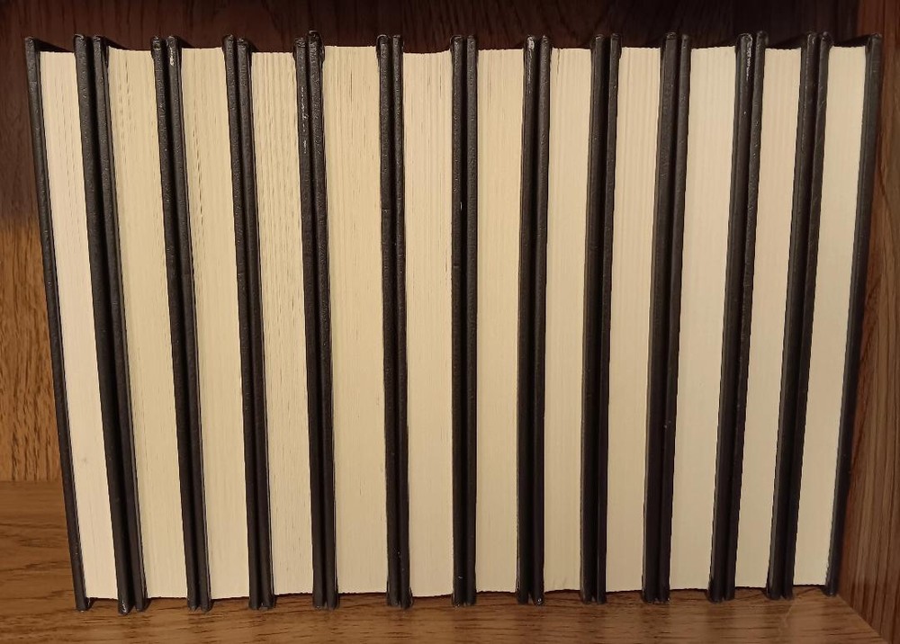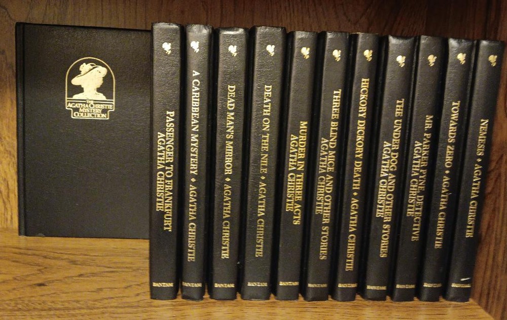 This is a 12 volume Set of Agatha Christie's Mystery Collection by Bantam Publishing! Books appear to be never read. There are some white marks on a few of the books and on the bottom edges of most (see pictures). The spines have not been cracked indicating that they have never been read. A handsome collection of black padded leatherette hardcovers with gilt page-ends, lettering on spine and front boards, marbled end-papers designed by Peggy Skycraft! 1980 & Various Dates; 12 Volumes; All appear never read. Titles included: 1. PASSENGER TO FRANKFURT 2. APPOINTMENT WITH DEATH 3. MURDER IN THREE ACTS 4. THREE BLIND MICE AND OTHER STORIES 5. HICKORY DICKORY DEATH 6. A CARIBBEAN MYSTERY 7. NEMESIS 8. TOWARDS ZERO 9. MR. PARKER PYNE, DETECTIVE 10. DEAD MAN'S MIRROR 11. THE UNDER DOG AND OTHER STORIES 12. DEATH ON THE NILE Just as pictured.