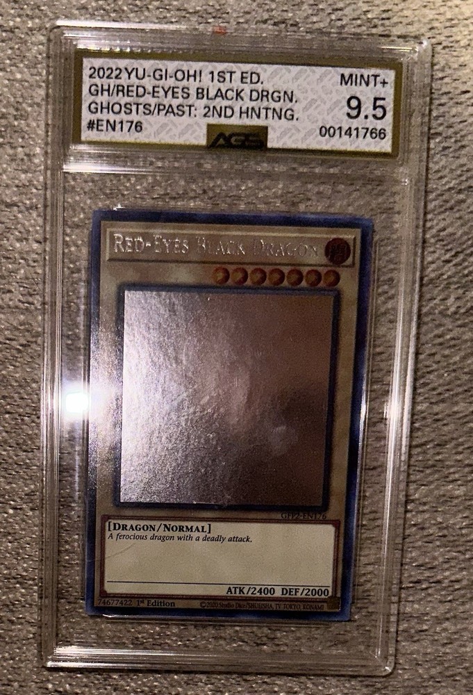 The AGS 9.5 Red-Eyes Black Dragon *Ghost Rare* GFP2-EN176 is a collectible card from the Yu-Gi-Oh! TCG set Ghosts from the Past: the 2nd Haunting. It is a 1st Edition English card graded by Automated Grading Systems (AGS) with a high grade of 9.5. This Ghost Rare card, manufactured by Konami, features the iconic Red-Eyes Black Dragon design, making it a highly sought-after and valuable addition to any card collection.