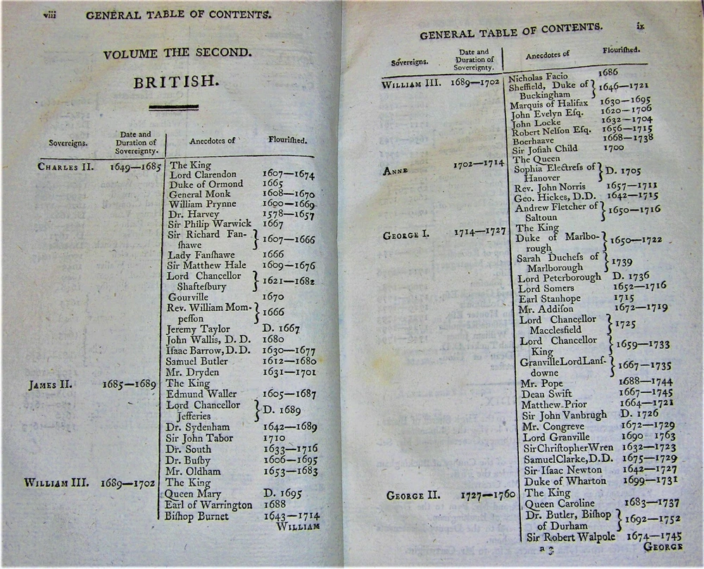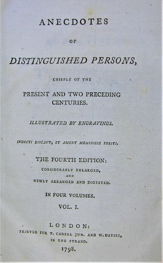 William Seward (January 1747 – 24 April 1799) was an English man of letters , known for his collections of anecdotes. These volumes of "Anecdotes of Distinguished Persons" were published shortly before Seward's death. Consequently, this is the last set that was subject to Seward's artistic control. Seward spent over 30 years studying and collecting anecdotal facts from journals, letters and first person interviews. His work is considered a cornerstone in the private and public lives of the most prominent and influential people in Europe and England from the end of the thirteenth century through the eighteenth century. Please refer to the table of contents within the photos for information as to who is included.
