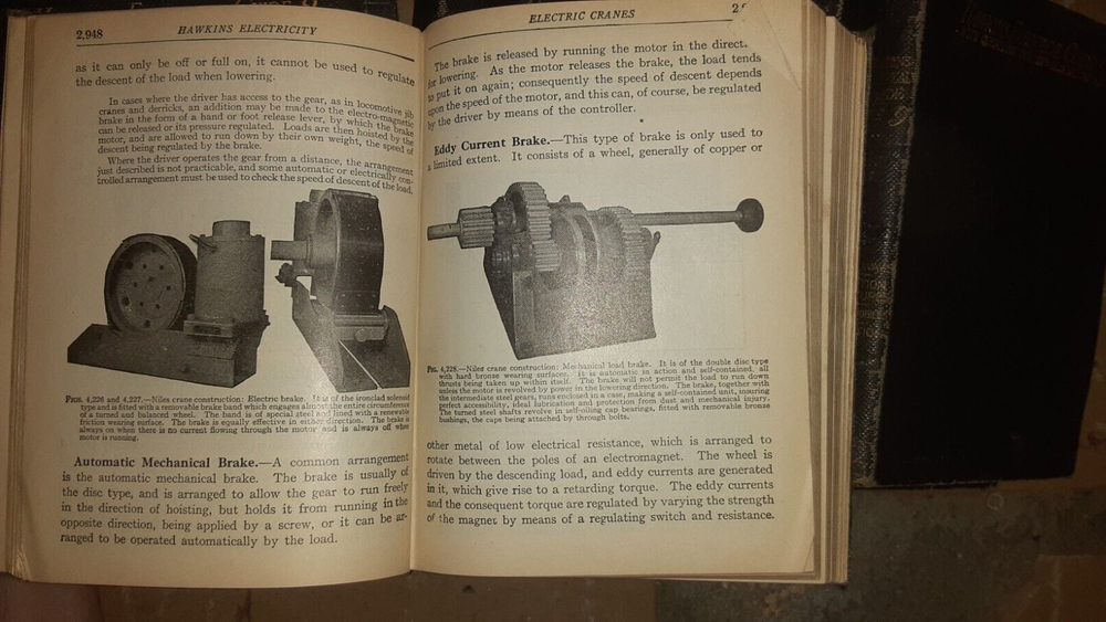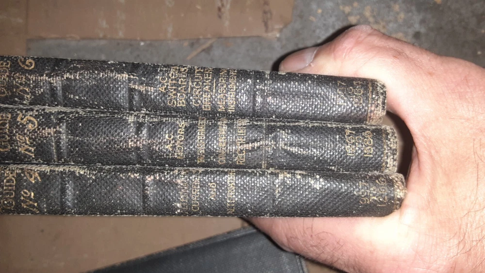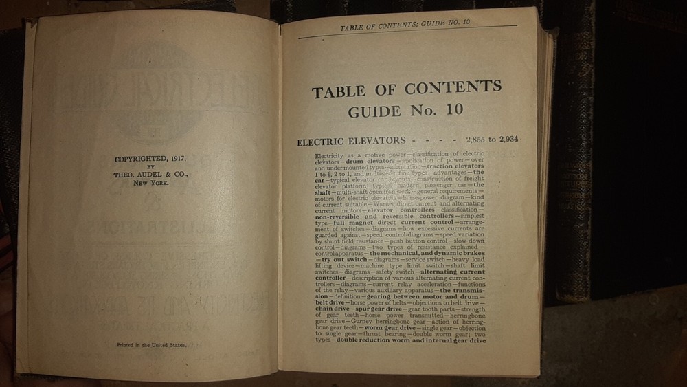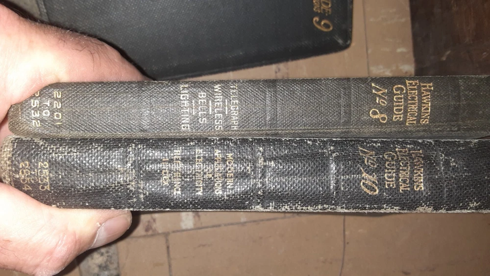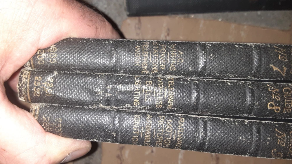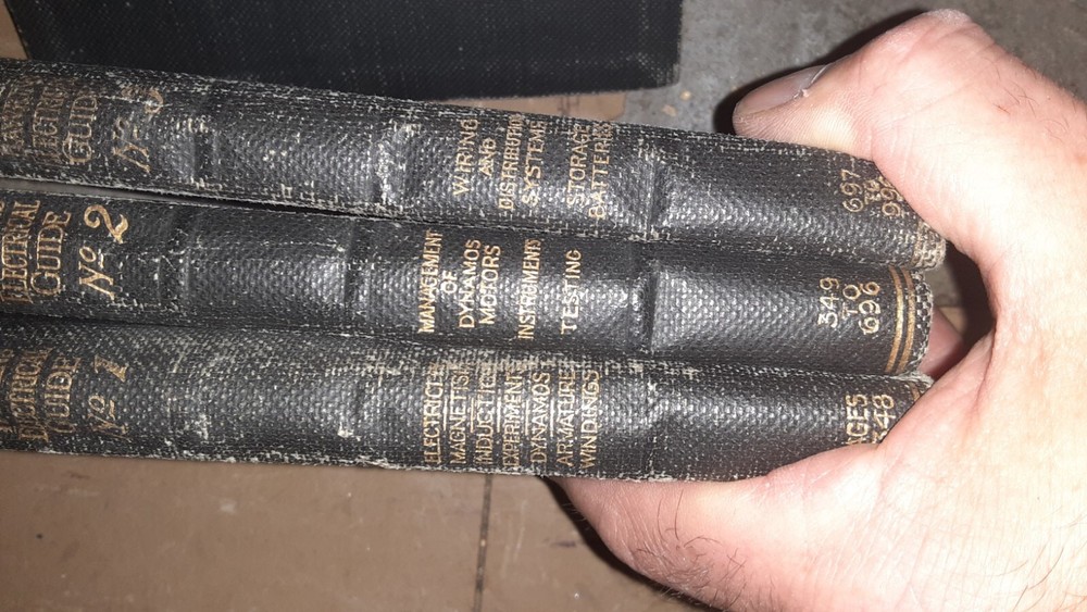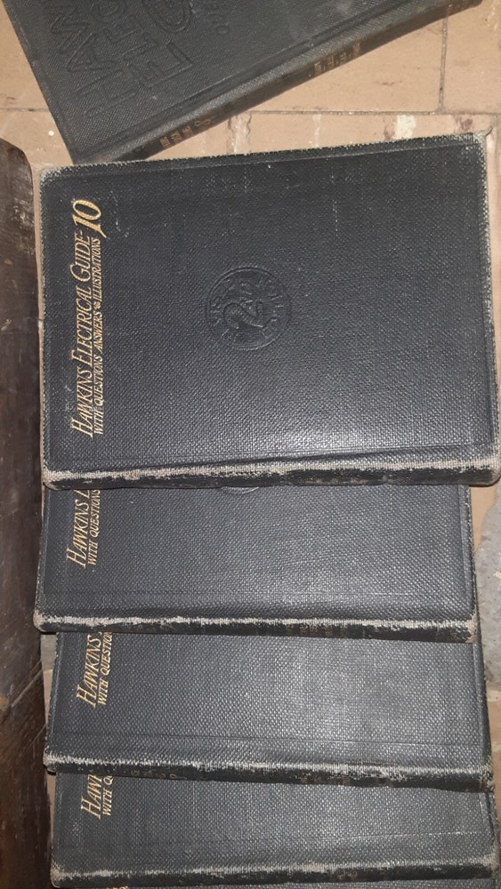 Complete set of 10, with an extra copy of vol. 8, in black flexible leather with gilt lettering to spine. Title blind-stamped on front along with tape, screwdriver and plyers. All gilt edges. 1917 Impression. Questions, answers and illustrations. A progressive course of study for engineers, electricitians, students and those desiring to acquire a working knowledge of electricity and its applications. A practical treatise. Many black and white illustrations in each book. All books are in good condition, spines show use and wear. Gilt is still bright on spines. Nice set would make a great collection.