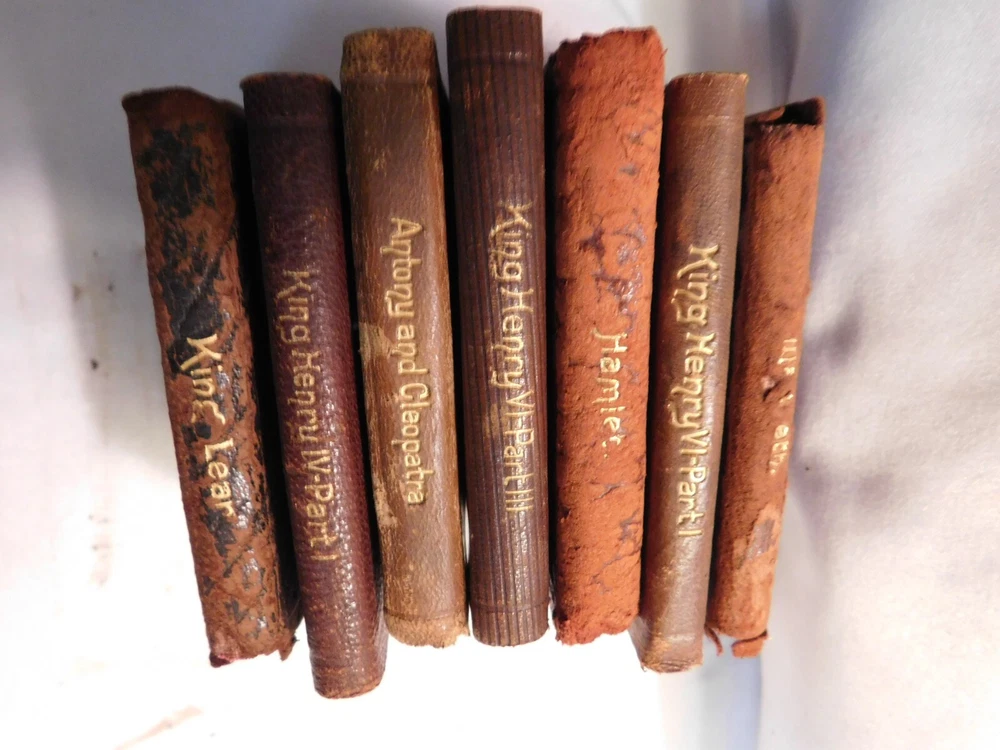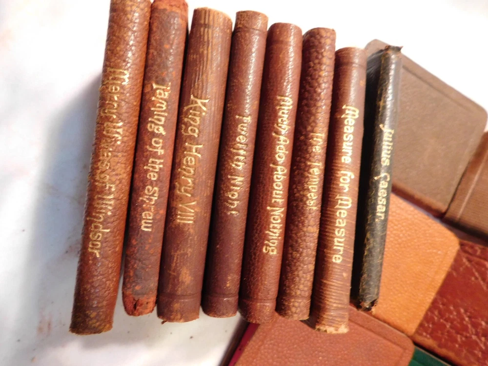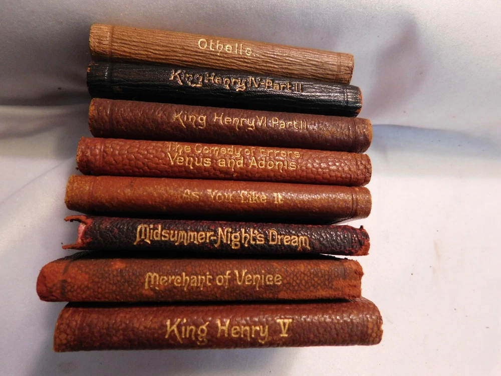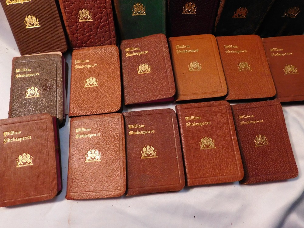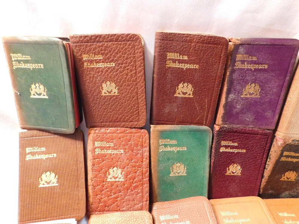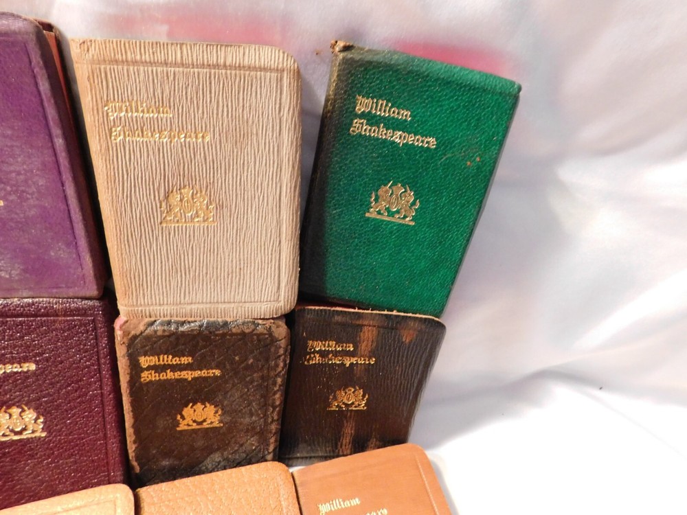 Pre-owned antique lot of 23 leather mini Shakespeare books published by Knickerbocker. Books sizes approx. 2 1/4" x 3 1/4". I did not see a published date in any of these books. Leather front/back covers show signs of wear, creases, chipping, some tears on some books around the covers edges/corners. Few books have the leather worn on the spine/some of spine missing. Some page creases, spotting. A few books have loose pages, etc. which is noted below with each of the titles. Leather is all different colors: green, black, shades of brown, purple. The only illustrated page is in the front of Shakespeare. Titles include: Much Ado About Nothing Antony and Cleopatra The Tempest The Tragedy of King Lear - threaded binding is loose in the front, slight tear on the bottom binding King Henry the XI Part III Twelfth Night: Or, What You Will MACBETH Measure for Measure King Henry the VI Part I King Henry the V Part I Hamlet, Prince of Denmark - Binding is loose, few loose pages in the front (both title pages) Midsummer Nights Dream As You Like it - tear in the binding, no loose pages The Life of King Henry the V The Comedy of Errors King Henry VI Part II King Henny the IV Part II OTHELLO The Moor of Venice - binding has a tear, no loose pages Merry Wives of Windsor Taming of the Shrew History of Life of King Henry the VIII - binding has a tear, no loose pages Julius Caesar - binding has a tear, no loose pages Merchant of Venice - binding is loose, loose pages - tear on title page, page 193/194, piece of page is torn off.