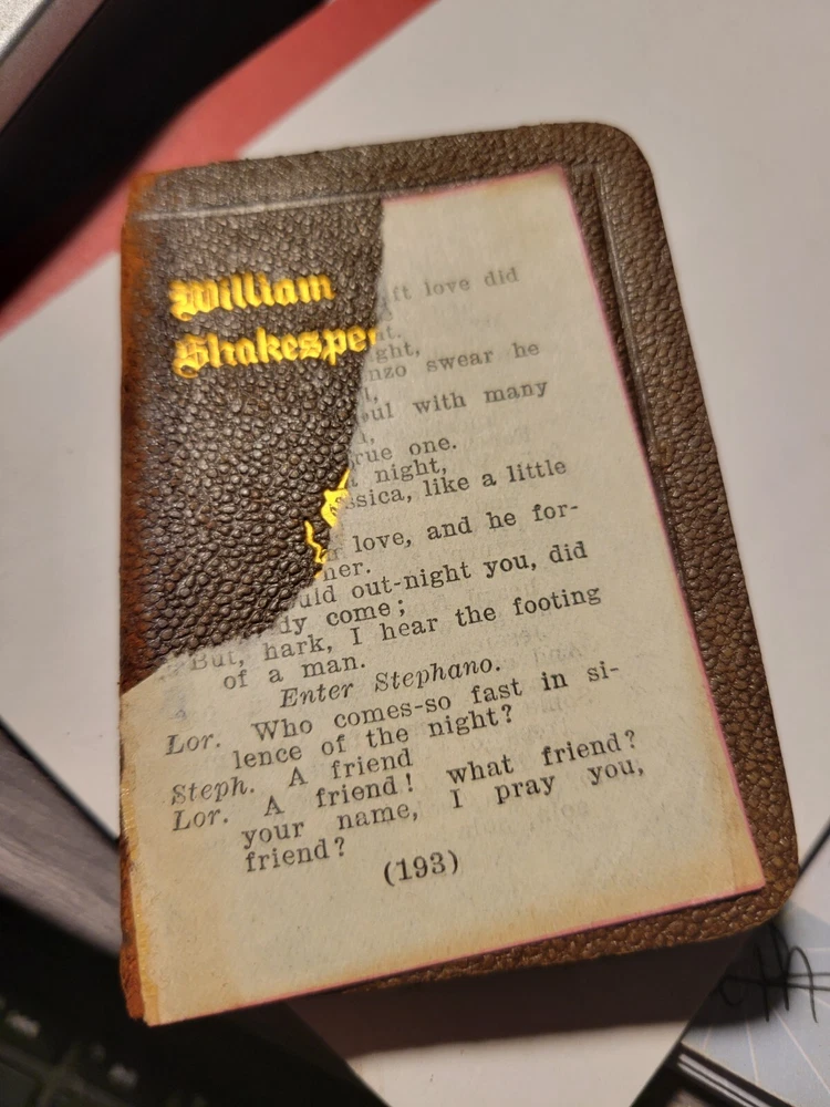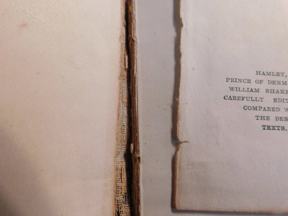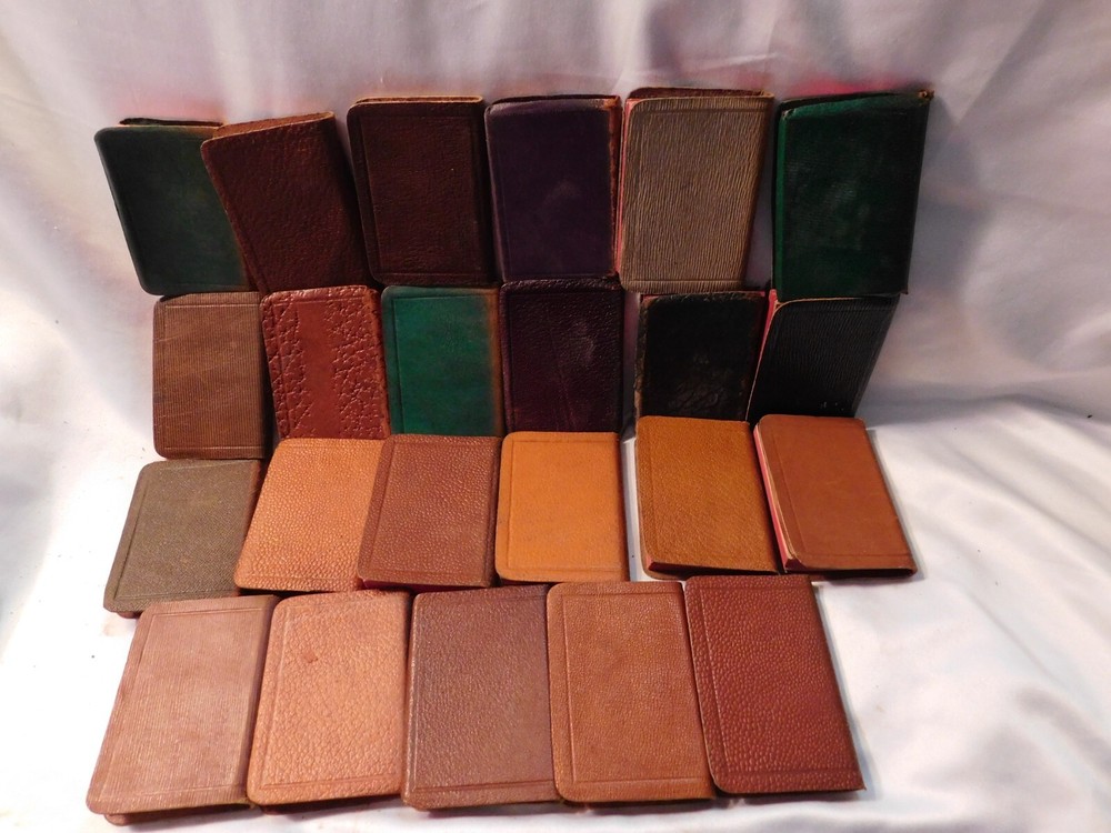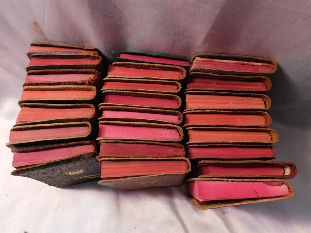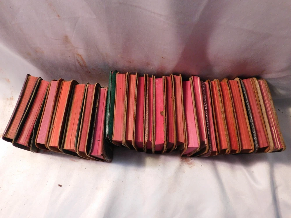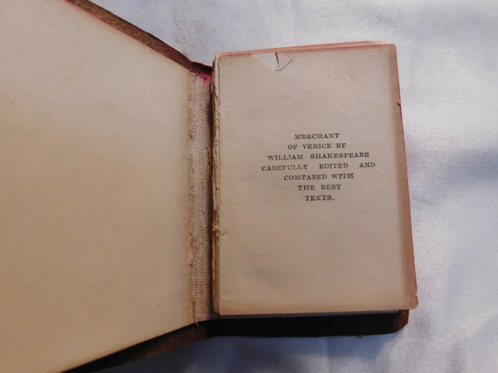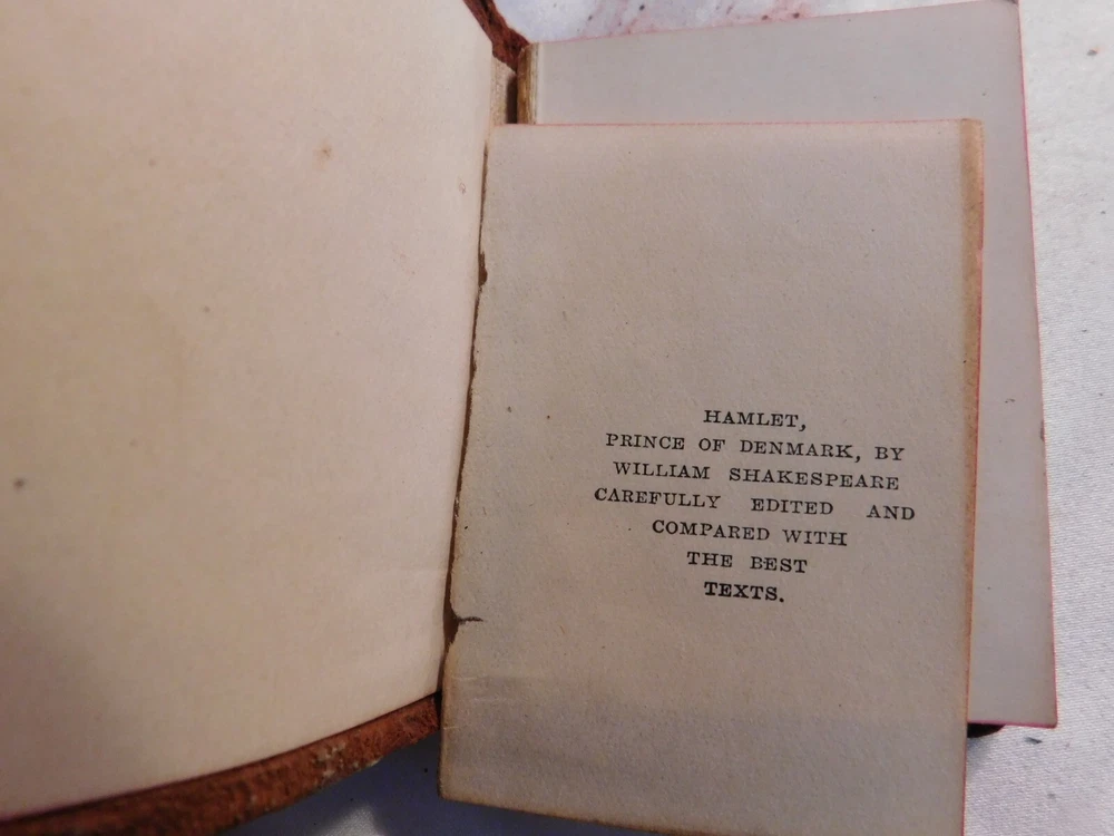 Pre-owned antique lot of 23 leather mini Shakespeare books published by Knickerbocker. Books sizes approx. 2 1/4" x 3 1/4". I did not see a published date in any of these books. Leather front/back covers show signs of wear, creases, chipping, some tears on some books around the covers edges/corners. Few books have the leather worn on the spine/some of spine missing. Some page creases, spotting. A few books have loose pages, etc. which is noted below with each of the titles. Leather is all different colors: green, black, shades of brown, purple. The only illustrated page is in the front of Shakespeare. Titles include: Much Ado About Nothing Antony and Cleopatra The Tempest The Tragedy of King Lear - threaded binding is loose in the front, slight tear on the bottom binding King Henry the XI Part III Twelfth Night: Or, What You Will MACBETH Measure for Measure King Henry the VI Part I King Henry the V Part I Hamlet, Prince of Denmark - Binding is loose, few loose pages in the front (both title pages) Midsummer Nights Dream As You Like it - tear in the binding, no loose pages The Life of King Henry the V The Comedy of Errors King Henry VI Part II King Henny the IV Part II OTHELLO The Moor of Venice - binding has a tear, no loose pages Merry Wives of Windsor Taming of the Shrew History of Life of King Henry the VIII - binding has a tear, no loose pages Julius Caesar - binding has a tear, no loose pages Merchant of Venice - binding is loose, loose pages - tear on title page, page 193/194, piece of page is torn off.