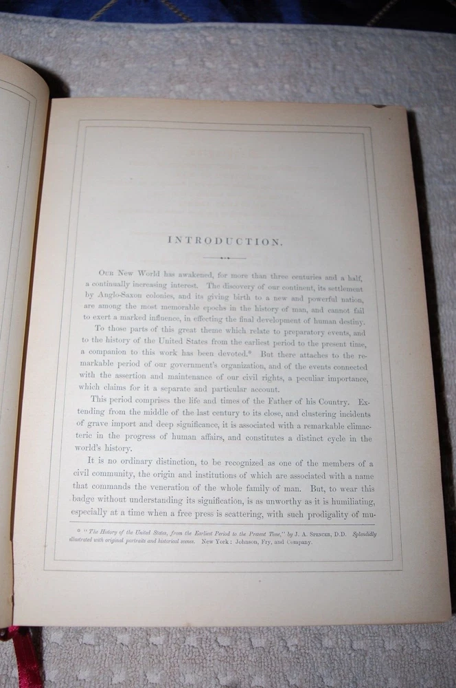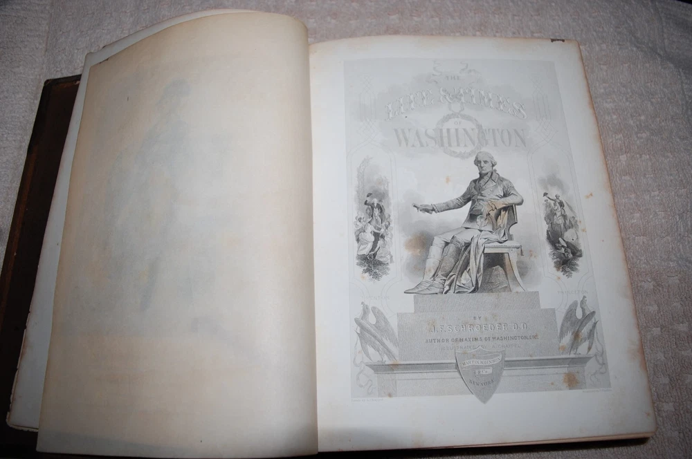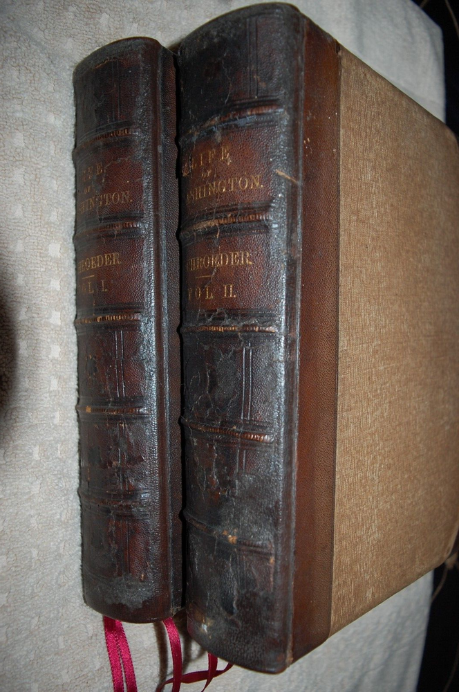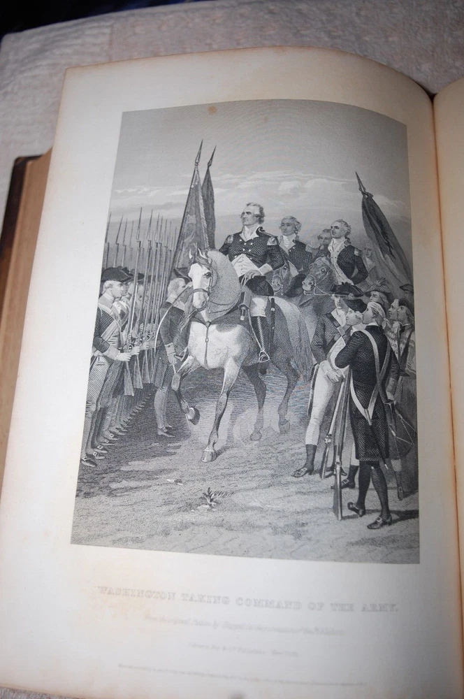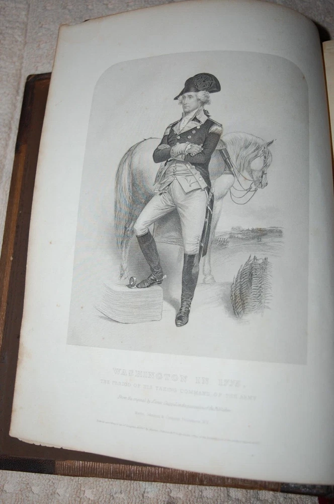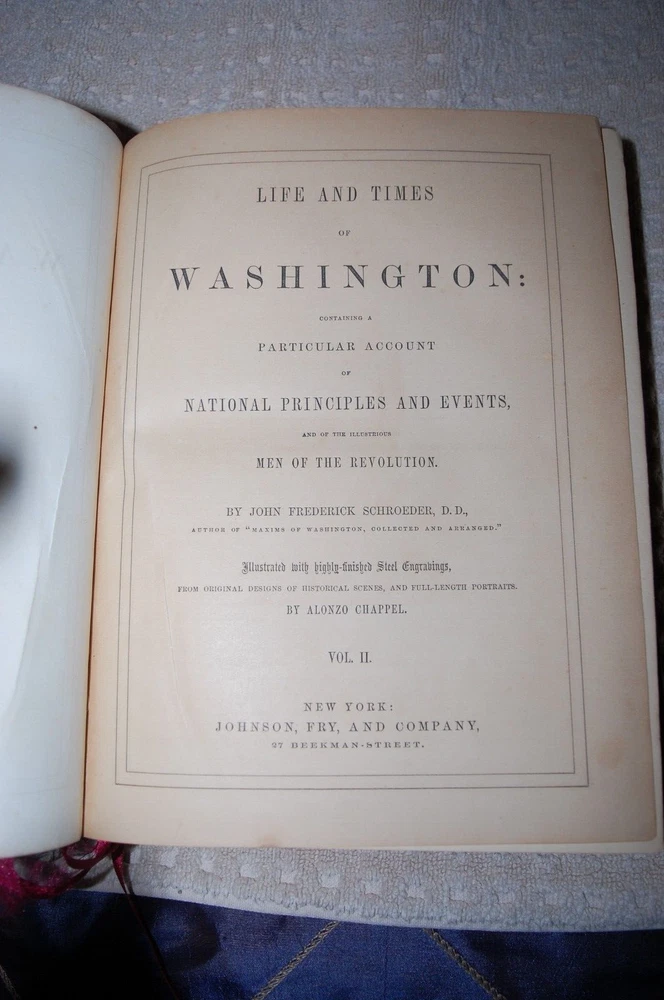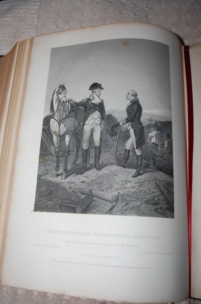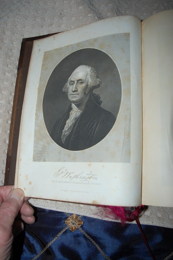 THIS IS FIRST EDITION, TWO VOLUME SET OF BOOKS ON THE LIFE & TIMES OF GEORGE WASHINGTON CONTAINING PARTICULAR ACCOUNT NATIONAL PRINCIPLES AND EVENTS AND OF THE ILLUSTRATIONS AND EVENTS MEN OF THE REVOLUTION BY JOHN FREDERICK SCHROEDER, D.D. ILLUSTRATED WITH HIGHLY-FINISHED STEEL ENGRAVINGS FROM ORIGINAL DESIGNS OF HISTORICAL SCENES AND FULL-LENGTH PORTRAITS BY ALONZO CHAPPEL PUBLISHED BY JOHNSON, FRY, AND COMPANY, 27 BEEKMAN STREET, NEW YORK. BOOKS MEASURE 11 1/4" X 9" AND COVERS ARE CANVAS AND OR LEATHER HARD BACK COVERS. VOLUME #1 HAS 708 PAGES AND VOLUME #2 HAS 762 PAGES. THERE IS VERY MINOR FOXING ON A COUPLE OF PAGES, NO TORN, DOG EARED, OR MISSING PAGES. EACH BOOK HAS THREE RED RIBBON PAGE / BOOKMARKS. PAGE EDGES ARE GOLD GILTED, AND ILLUSTRATIONS ARE SEPARATED BY TISSUE. EACH BOOK WEIGHS APPROXIMATELY 6 LBS 2 OUNCES. BOTH BOOKS ARE IN FINE CONDITION FOR AGE. ENTERED ACCORDING TO ACT OF CONGRESS IN THE YEAR 1857, BY JOHNSON, FRY AND COMPANY. SEE PHOTOGRAPHS FOR ADDITIONAL DETAILS. ORDER SHIPPED INSURED.