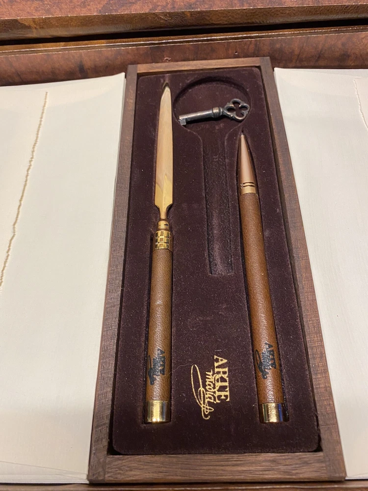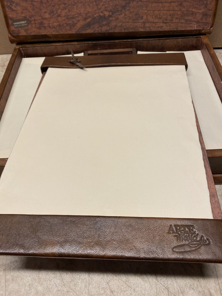 ARTE Medici Genuine Leather-Bound VIP stationery set Up for sale is this ARTE Medici Genuine Leather-Bound VIP stationery set that includes a writing paper, envelopes, pen, and letter opener. This case is exclusively hand-crafted in Germany and its lock comes with 2 keys. It measures approximately 14” X 11” X 3”. Quality wood that was leather-bound with a distressed look. The spine looks like an antique book. A wonderful piece. Original retail $300.00. A stunning piece to add to your collection. Substantial shipping weight of 8lbs. This will be packed securely and shipped with Priority Mail that includes tracking and insurance. Please see photos as they are part of the description. Please ask questions before buying, all sales final. USA sales only. My home is smoke and pet free. When paying by PayPal, will ship to confirmed addresses only. When buying multiple items will be happy to combine shipping. Thank you! Also, please checkout my other items. Happy shopping!!!! 😁