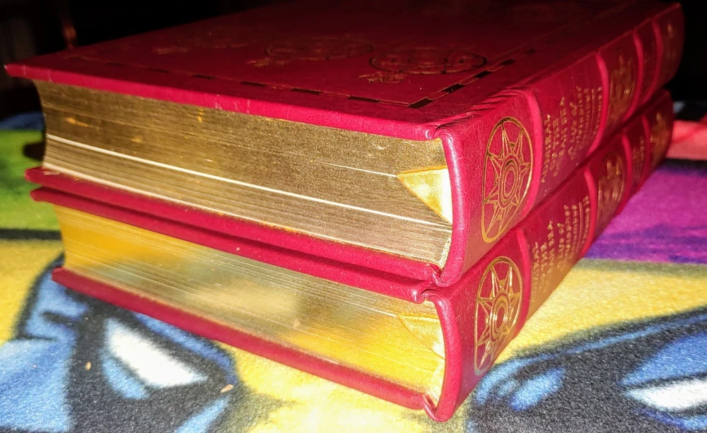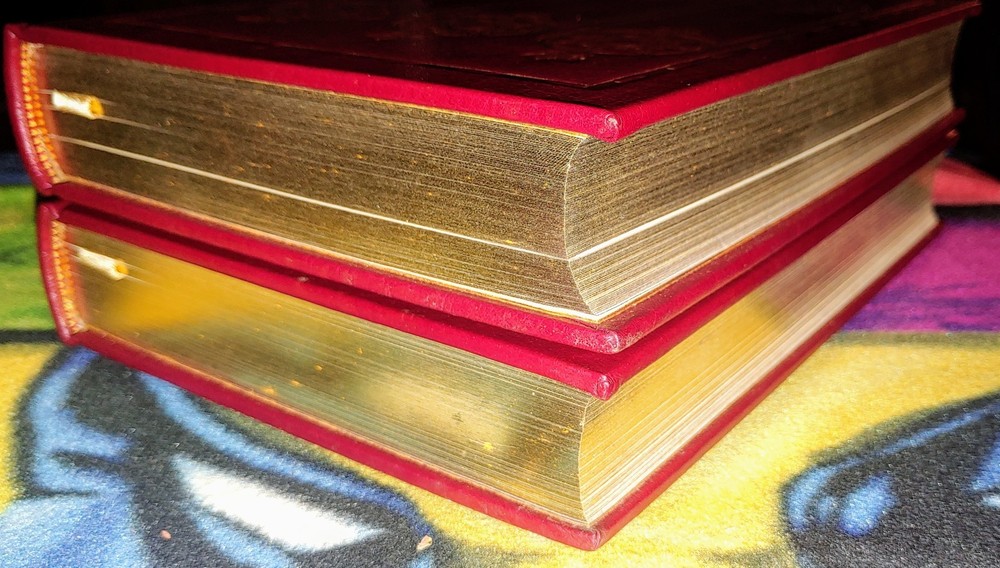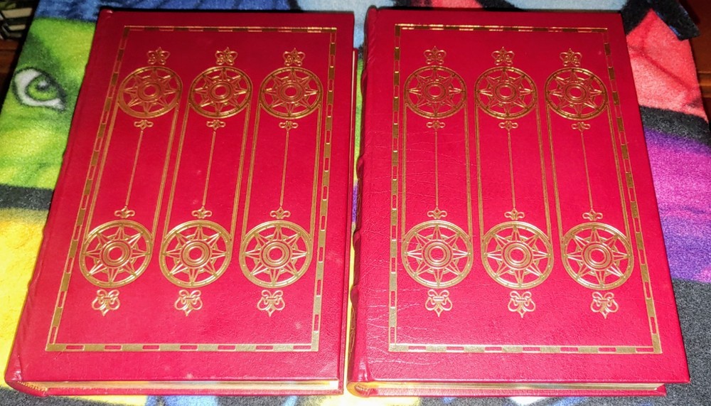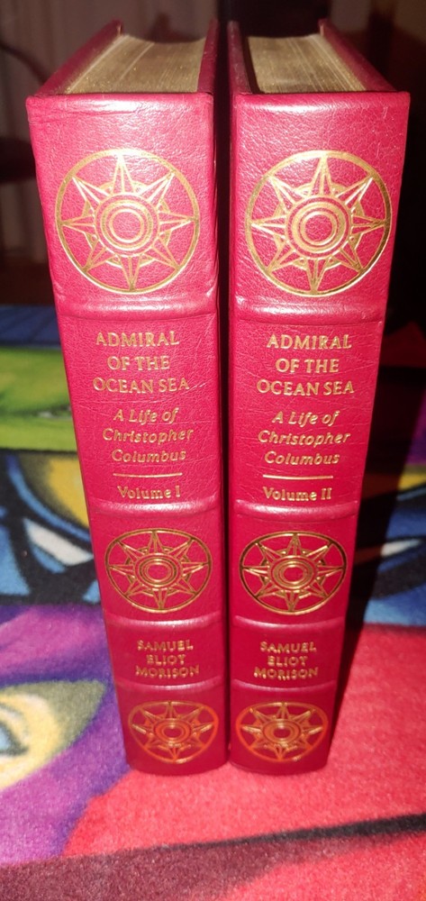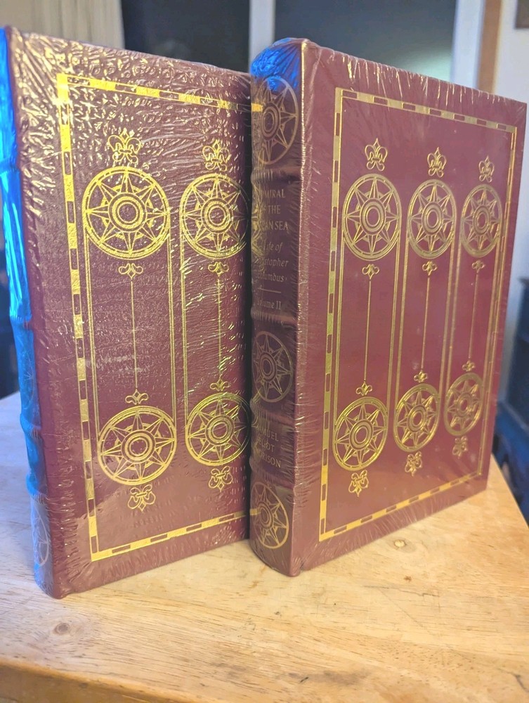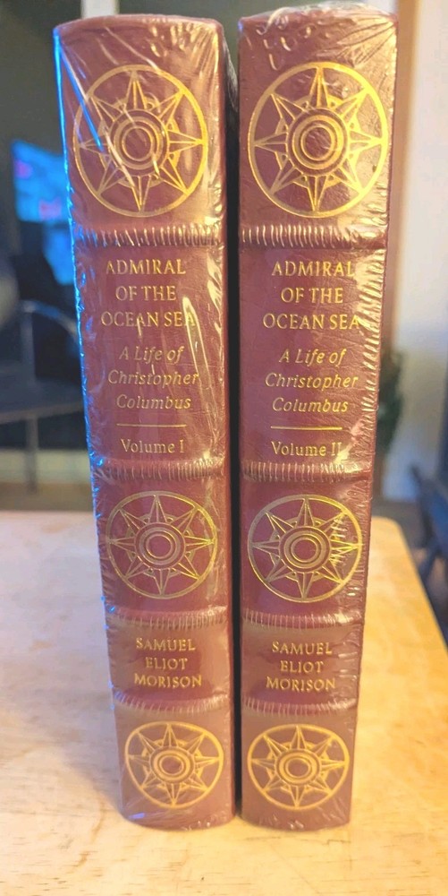 "Admiral of the Ocean Sea: Life & Voyages Of Christopher Columbus" is a luxurious 2 volume set published by Easton Press in 1990. Written by Samuel Eliot Morison, this historical leatherbound set celebrates the 500th Anniversary of Columbus' voyages, making it a collector's item for those interested in exploration and travel. Good news/Bad news (which happen to be the same news): this set was still in its original shrinkwrap. Unfortunately, there was some minor foxing/spotting that occurred under the plastic along the gilded edges. I removed the plastic to try to avoid further spotting (see photos). In addition, there's some unusual wrinkling to the bottom corners of Vol. 2. Still, a nice, tight (and affordable!) set that has remained unopened save for these pictures! This edition is a must-have for fans of Christopher Columbus and American maritime history! MKWBOOKS- 50+ years of collecting experience behind every auction!