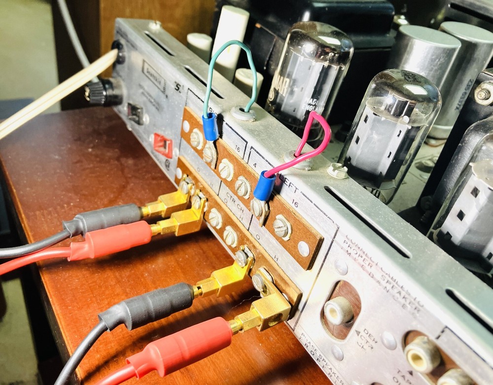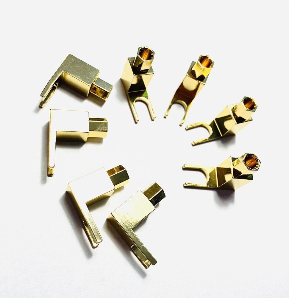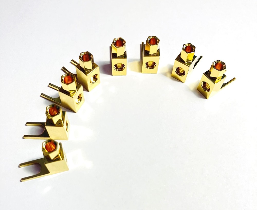 Amplifier Speaker Connection Adapter Y-Plug Interface for LEAK SCOTT FISHER This is an amplifier speaker connection adapter, Y-plug interface, suitable for various vintage amplifiers that use screw-type connectors. Made from pure copper with precision processing and a gold-plated surface. A set includes 8 pieces. (The price does not include the demonstrated amplifier.)