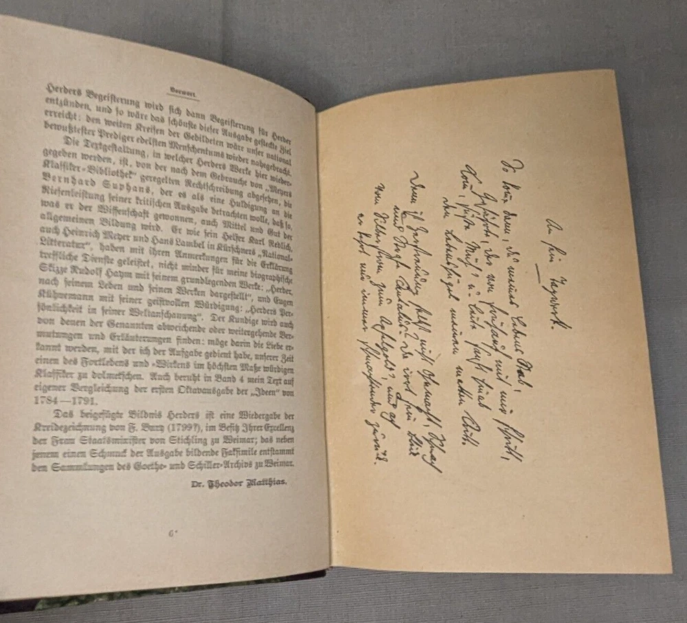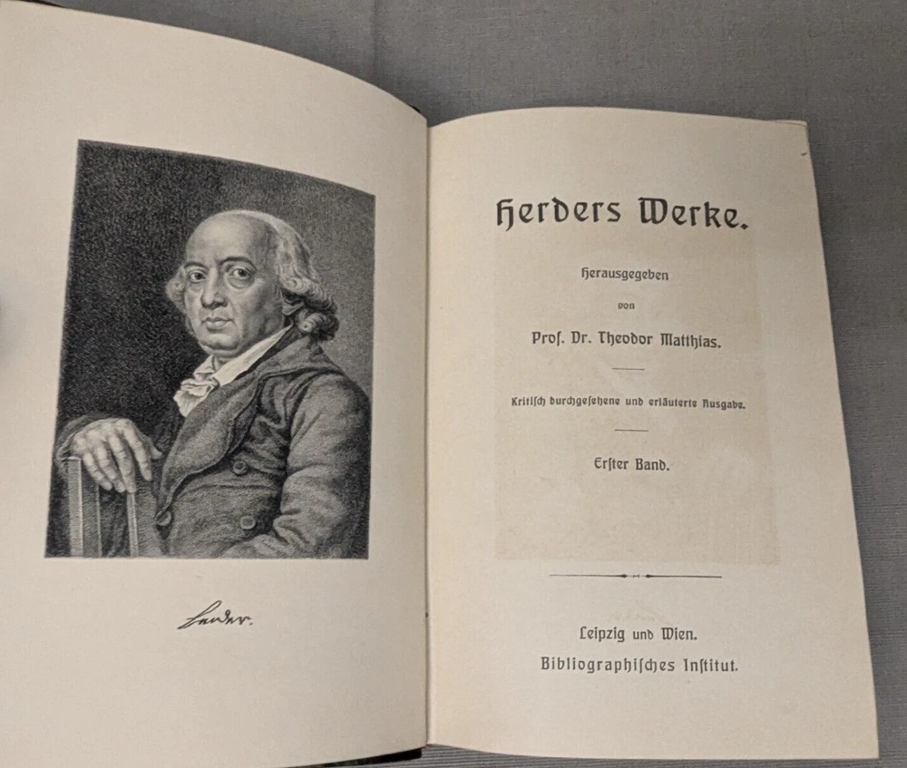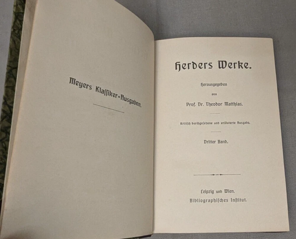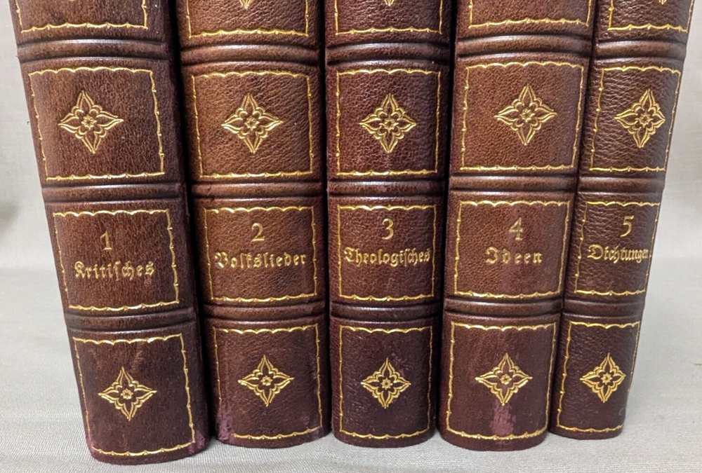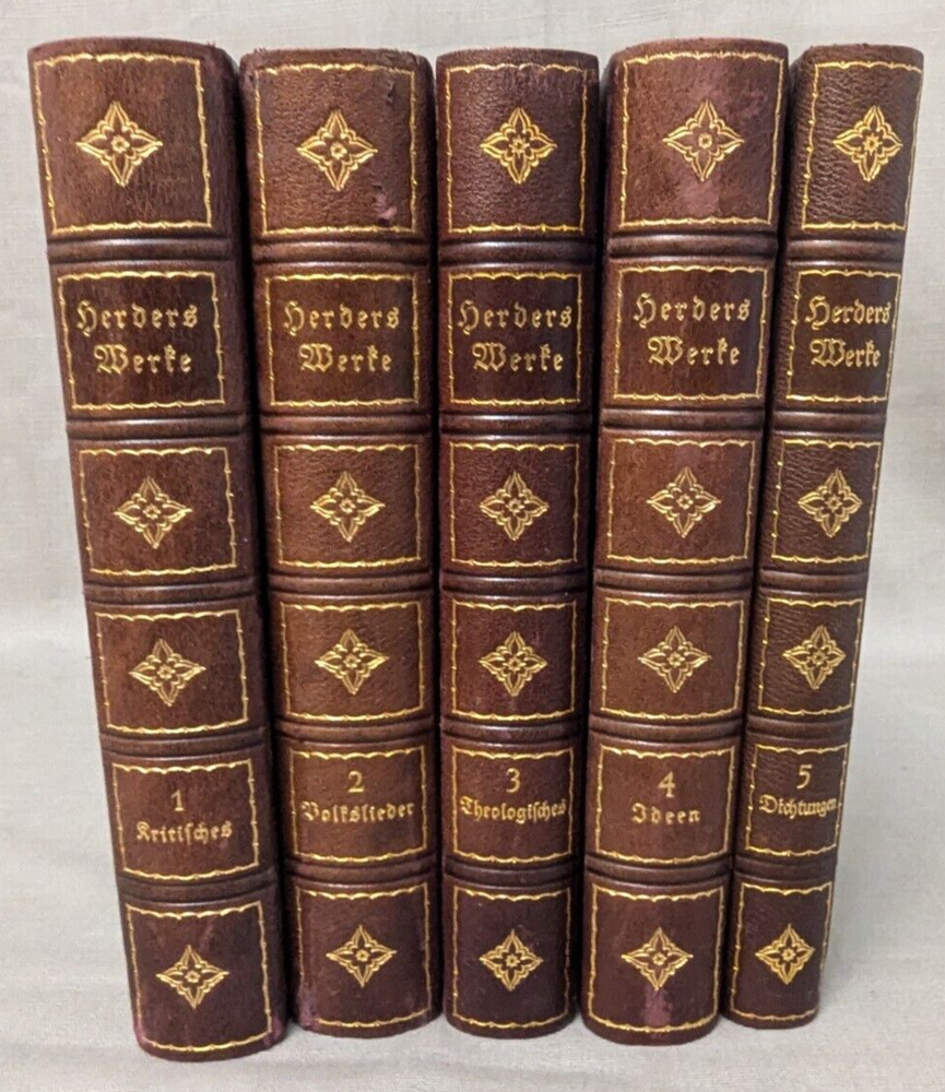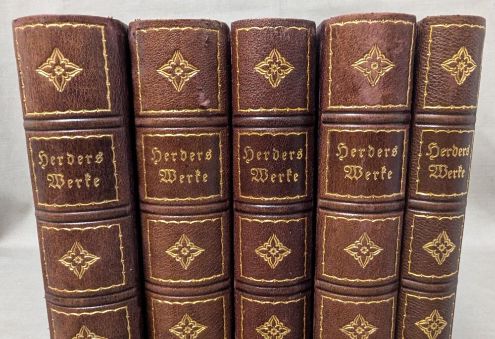 Delve into the richness of German literature with the Herders Werke set, a collection of five volumes that showcase the timeless works of Herder. Each book is bound in supple partial leather with gilt detailing along the spine and top, presenting a classic aesthetic that is both elegant and durable. The set is a treasure for any bibliophile, offering a gateway into the world of poetry and philosophical thought. The collection is an embodiment of cultural heritage, with text in German that speaks to the language's depth and history. Ideal for both collectors of antiquarian books and enthusiasts of Herder's influential writings, this set promises to be a distinguished addition to any library. Whether for display or perusal, these books are sure to inspire and educate. All in excellent condition. There is some light discoloration on the pages. Please view all photos for visual condition. Please, message me with any questions, before bidding or purchasing. Thank You and Good luck! Upon receiving payment, item(s) usually ship within three (3) business days (M-F). If you need your purchase shipped faster, please message me and we will be happy to rush your purchase. Payment within three (3) days of winning the auction is appreciated! Thank you for stopping by and giving me a look! Every effort is made to describe items fairly and correctly. I will be more than happy to answer any questions or send additional photos, by email during the auction. Please look at the pictures and ask questions before bidding or purchasing. Thank you.