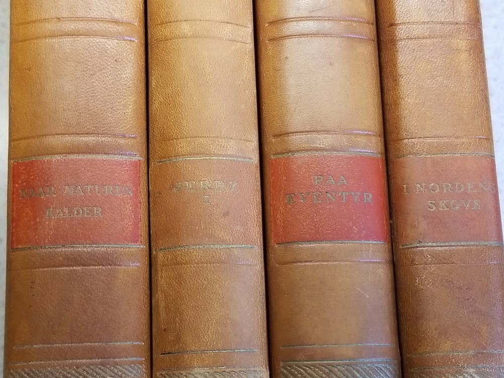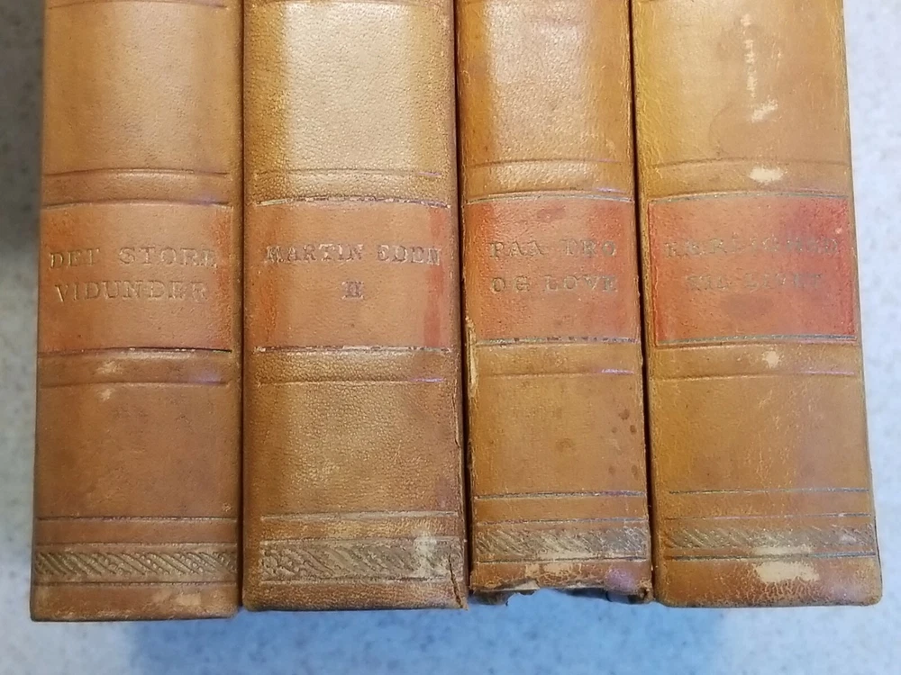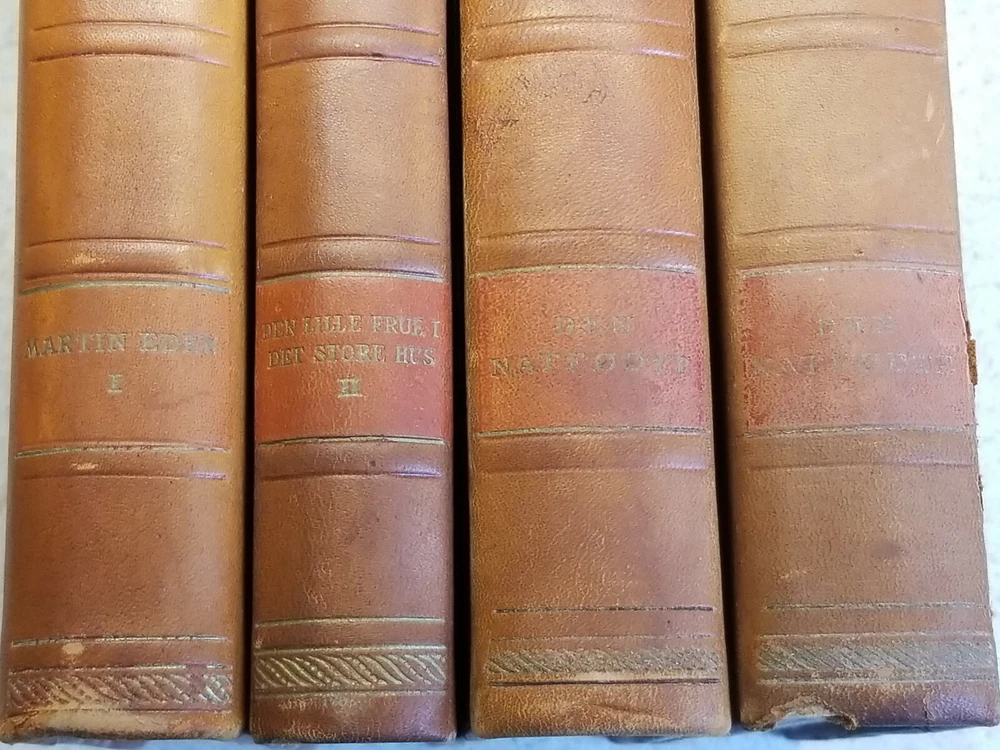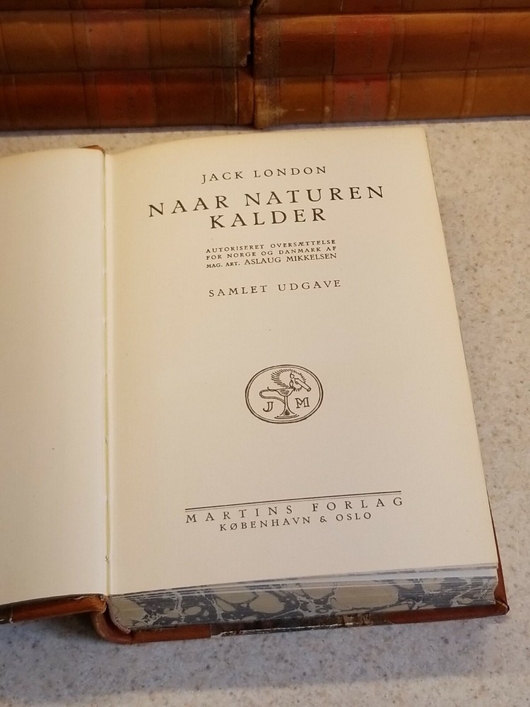 VINTAGE 16 volume JACK LONDON Leather Bound marbled boards/sides Danish Version. This set is a Danish verion and all 16 volumes are in Danish. Please see all photos for pics of the titles. Each book has marble boards and the 3 sides of each is marbleized as well. There is wear on the books but they are pretty much intact. 2 of the volumes have a tear in the leather, as you can see in my pics. 2 of the volumes are also duplicates. I think that this set dates to the 1920's I think but I cannot say for certain. Please contact me with any questions and I will respond promptly. Ships with USPS Media Mail. Thanks for looking!
