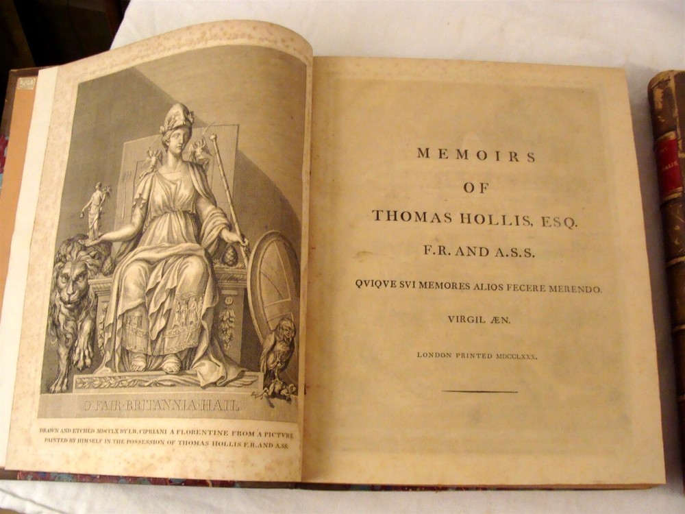 Click photos for larger image! Description & Condition: Up for sale is this antique rare 1780 two volume book set titled " Memoires of Thomas Hollis Esq". They were printed in London and each volume with engravings. The boards are marbled leather and the front inner boards with ex library label from Costanter Hoar in Littleton, Massachusetts. They are in good condition with light wear to boards and each volume has a few pages with foxing mainly on opposite pages of the engravings but most are white and clean. They measure 13 3/4" by 11" each. A very nice set that will look great in any collection. Please view all the photos and if you have any questions please ask. THANK YOU FOR BEING INTERESTED IN MY AUCTION, BE SURE CHECK OUT OUR OTHER AUCTIONS FOR MORE INTERESTING ESTATE FRESH ANTIQUES AND COLLECTIBLES LISTED JUST ABOUT EVERY NIGHT ON E-BAY!!! Please take a minute to read below, it explains just about everything you will need to know to be sure we will always provide great merchandise, competent service, guaranteed items and rectify any issues at hand for all of our customers no matter the size of the purchase!!! Our Guarantee: I guarantee all items as described, if you feel I misrepresented an item and you are not happy I will refund your purchase price with no questions asked. If an item has a reserve I will be more than happy to reveal it through E-mail. PAYMENT METHODS: WINNING BIDDERS ARE EXPECTED TO RESPOND WITHIN 7 DAYS OF AUCTION END! My preferred method of payment is PayPal, if you do not have a PayPal account I recommend you open one up. Shipping Information: Please check-out all my other auctions as I will combine shipping to save you money on multiple purchases! When making multiple purchases within one night please wait to be invoiced as this is when I can adjust your shipping. If you pay full shipping cost on each items odds are I won't catch it as packaging, listing and invoicing . If you realize that you did pay full price on each item and they were boxed together, please bring it to my attention and I will be happy to refund part of the shipping. I will always do my best to get you the best quotes possible with minimal handling costs. Larger items are a bit difficult to get an exact shipping quote on, especially if it is going across or out of the U.S. and may have small handling fees to them as large sized corrugated boxes and packaging are not cheap. Very large packages may be subject to a reqoute once the item is boxed and/ or a third party shipper is involved. My packaging is of the highest quality, many orders are shipped in double wall boxes and/ or double boxed, all new shipping materials are used and no expense is spared in making sure your items arrive to you in the condition you expect! If you feel a shipping quote is not right, please feel free to contact me and I will explain why it is such, adjust the price if the E-Bay calculator is out of sync with my shipping carrier or find alternative ways of shipping items to you. Please understand that shipping by all carriers may take longer than they claim. They claim 2-5 days but in many cases we see it taking up to 10 days. I record and track all shipping of packages that leave our building. So before you leave me any NEGATIVE or NEUTRAL feedback because of shipping please note I am very timely on sending your items out and also do the best I can to keep shipping costs lower for you by using either U.S.P.S. ~ FEDEX ~ UPS, depending on the size, weight, insurance value and destination of the package. Leaving Feedback: I will leave feedback for all purchases after we receive feedback from you to make sure all arrived well, product is up to your standards and you are happy with your purchase (usually in bulk every 2-3 weeks). Thank You, Good Luck and Happy Antiquing! Dale Powered by SixBit's eCommerce Solution