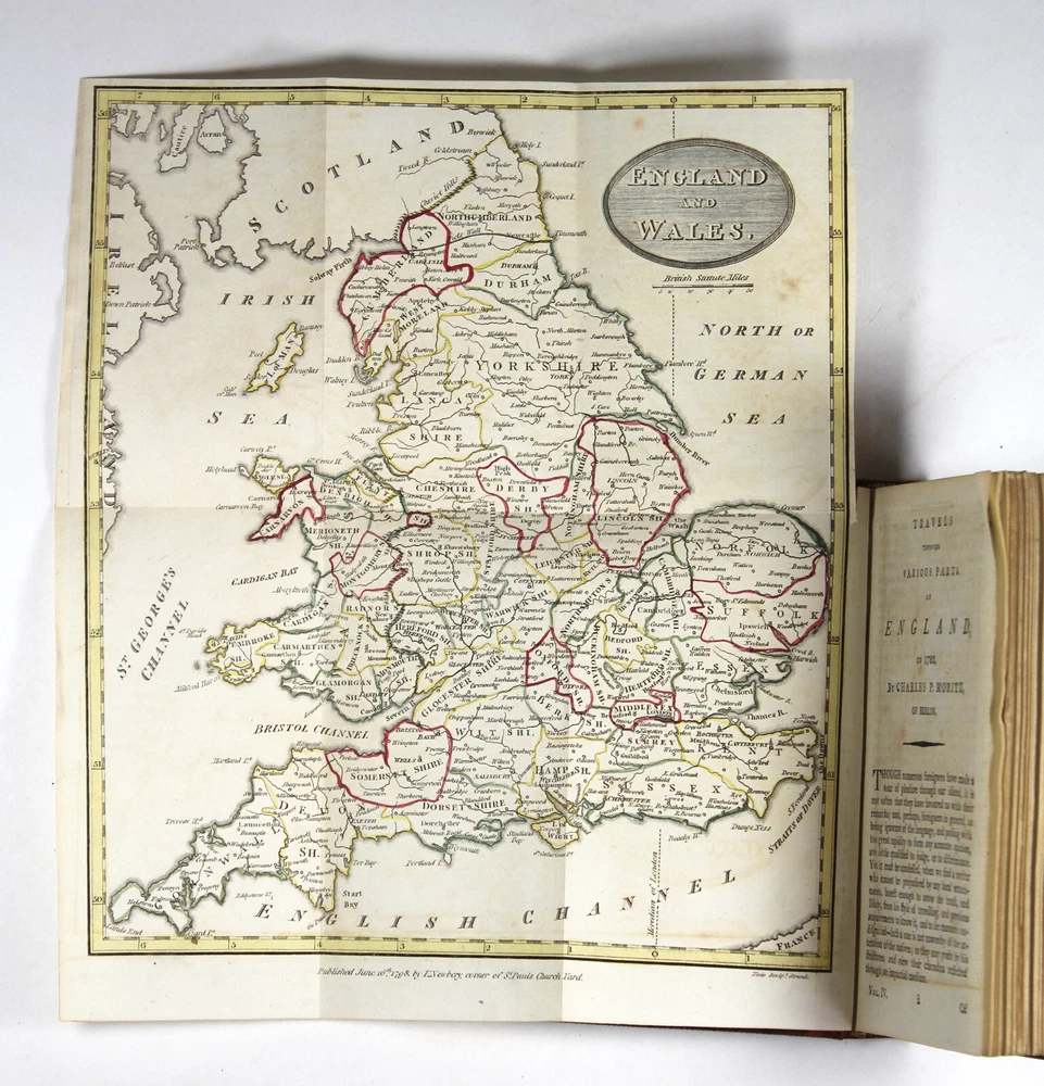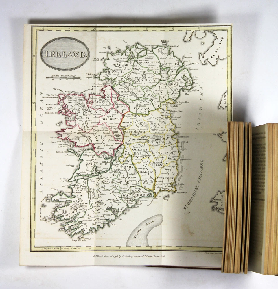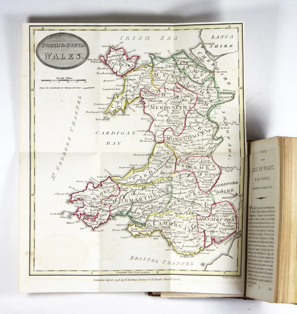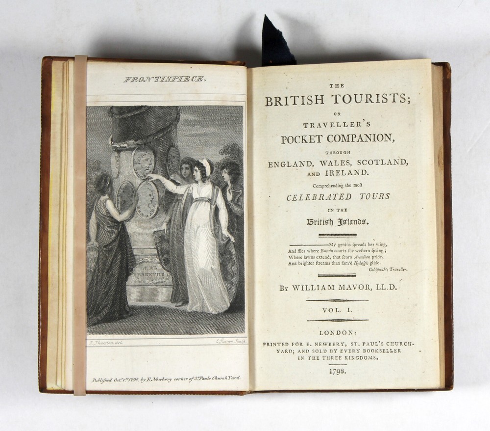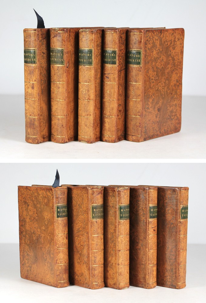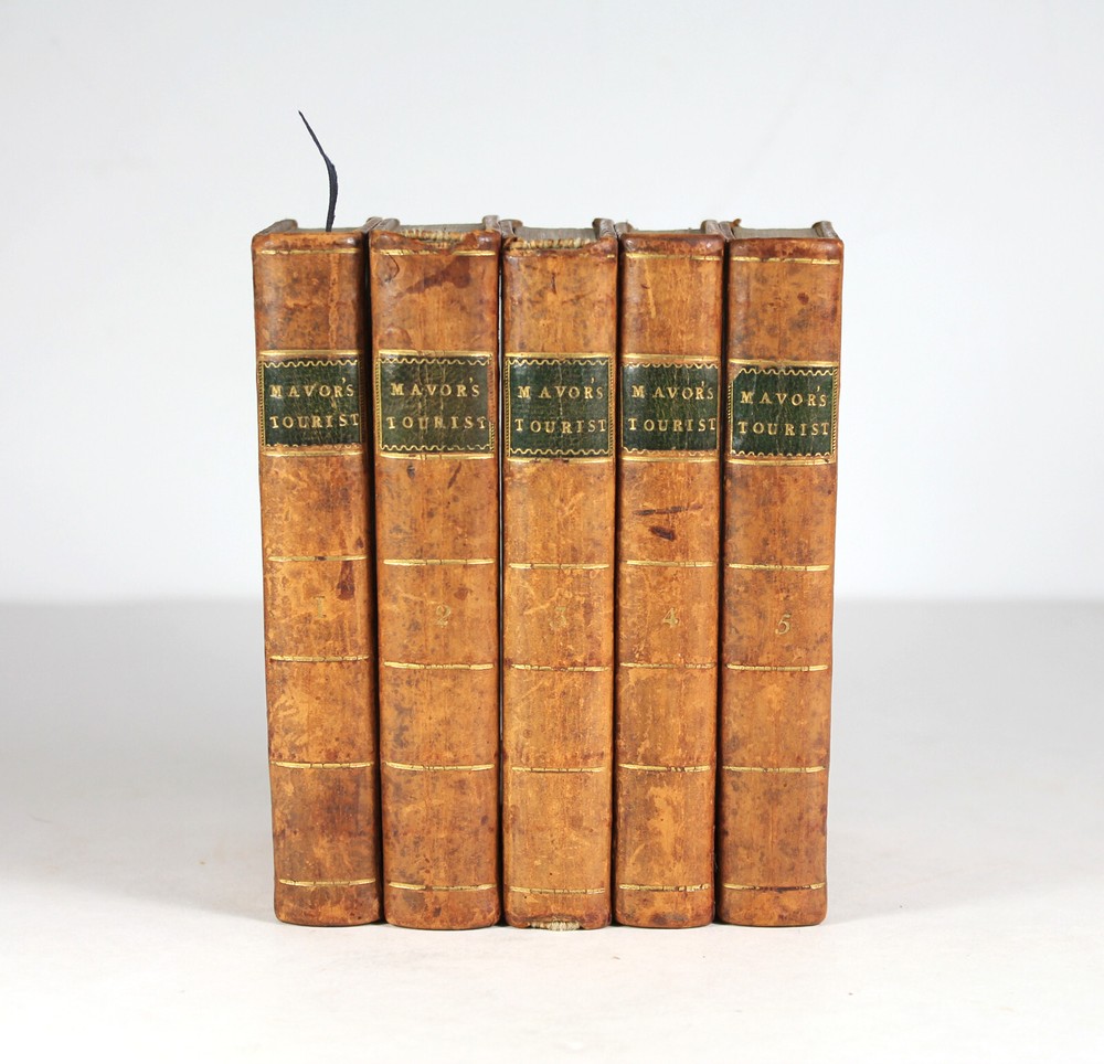The British Tourists or Traveler's Pocket Companion through England, Wales, Scotland, Ireland Comprehending the most Celebrated Tours in the British Isles William Mavor, 1798, 5 Volume Set This RARE 5 Volume, leather bound set is a pocket printing of Mavor's Tourist books. Volumes 1, 3,4 and 5 each have one color, fold out map of England, Scotland, Ireland, Wales. Each volume covers part of the British Isles, tourist routes, special places of interest, islands, historic cites and sites. Size: all 5 volumes are 3.5 by 5.75 inches, all are around 300 pages long. Very Nice Original Condition, 5 leather bound volumes, all pages, illustrations, maps clean and intact, binding tight and intact, see photos. Feel free to as questions and be sure to see our many other unique Antiquarian Books.