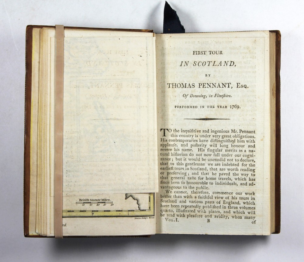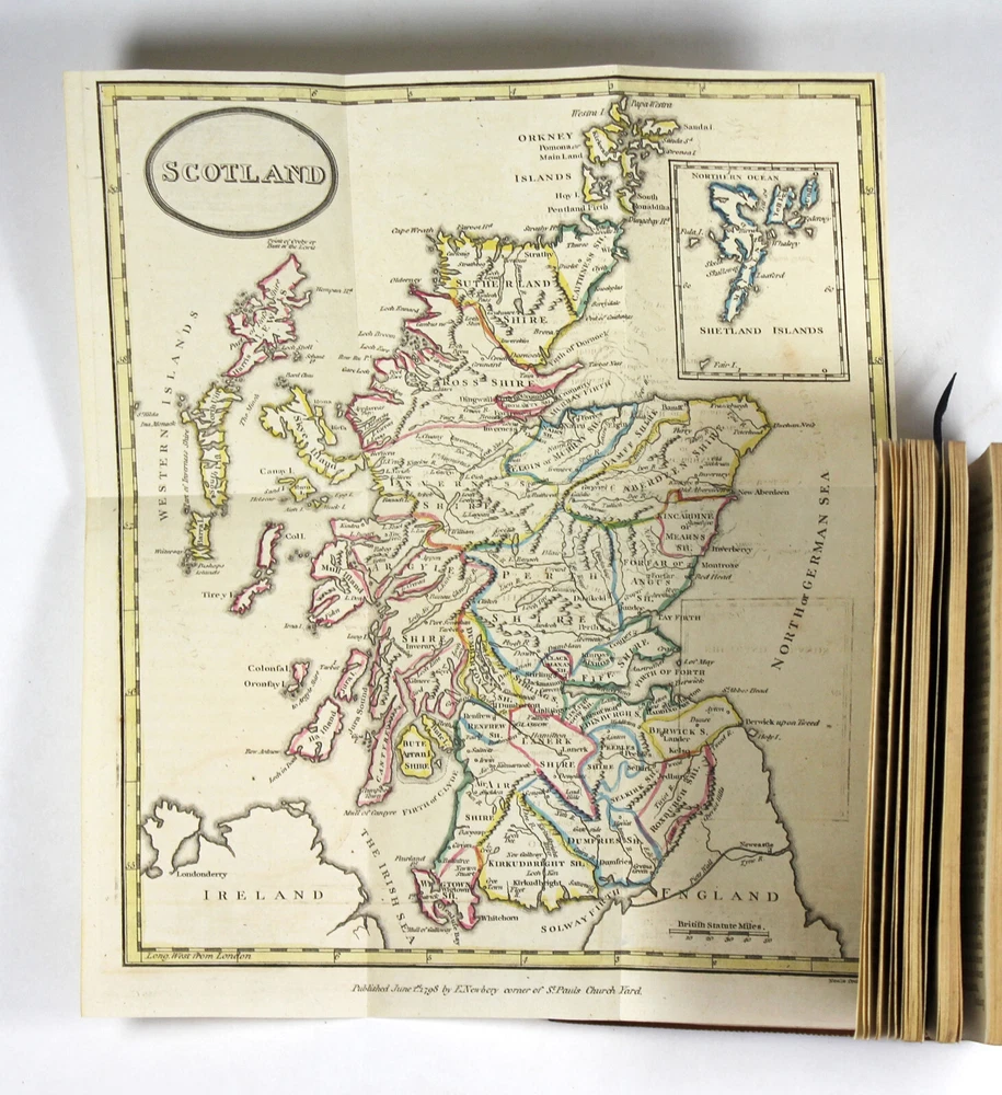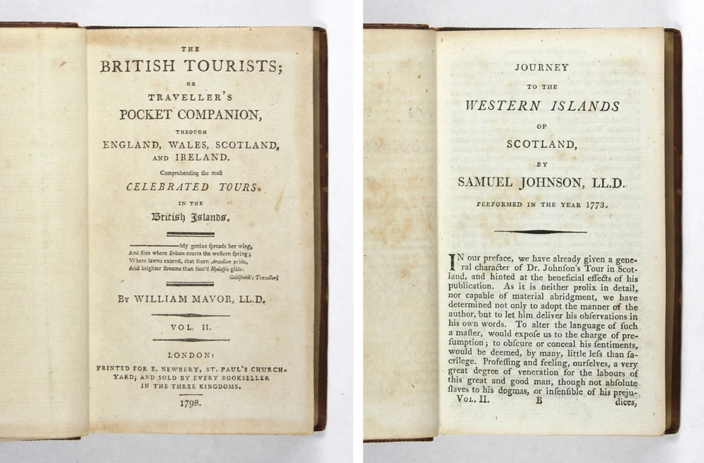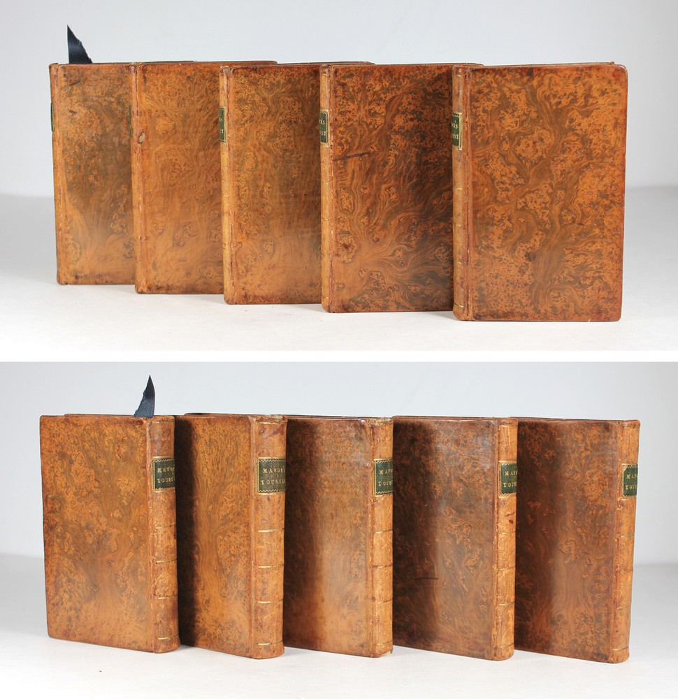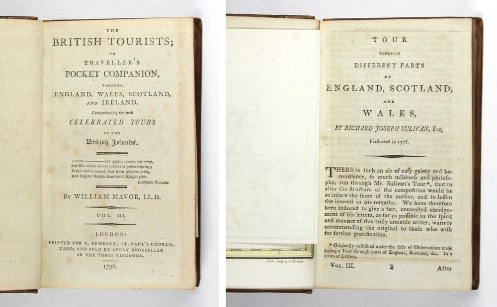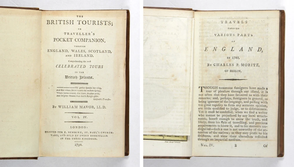 The British Tourists or Traveler's Pocket Companion through England, Wales, Scotland, Ireland Comprehending the most Celebrated Tours in the British Isles William Mavor, 1798, 5 Volume Set This RARE 5 Volume, leather bound set is a pocket printing of Mavor's Tourist books. Volumes 1, 3,4 and 5 each have one color, fold out map of England, Scotland, Ireland, Wales. Each volume covers part of the British Isles, tourist routes, special places of interest, islands, historic cites and sites. Size: all 5 volumes are 3.5 by 5.75 inches, all are around 300 pages long. Very Nice Original Condition, 5 leather bound volumes, all pages, illustrations, maps clean and intact, binding tight and intact, see photos. Feel free to as questions and be sure to see our many other unique Antiquarian Books.