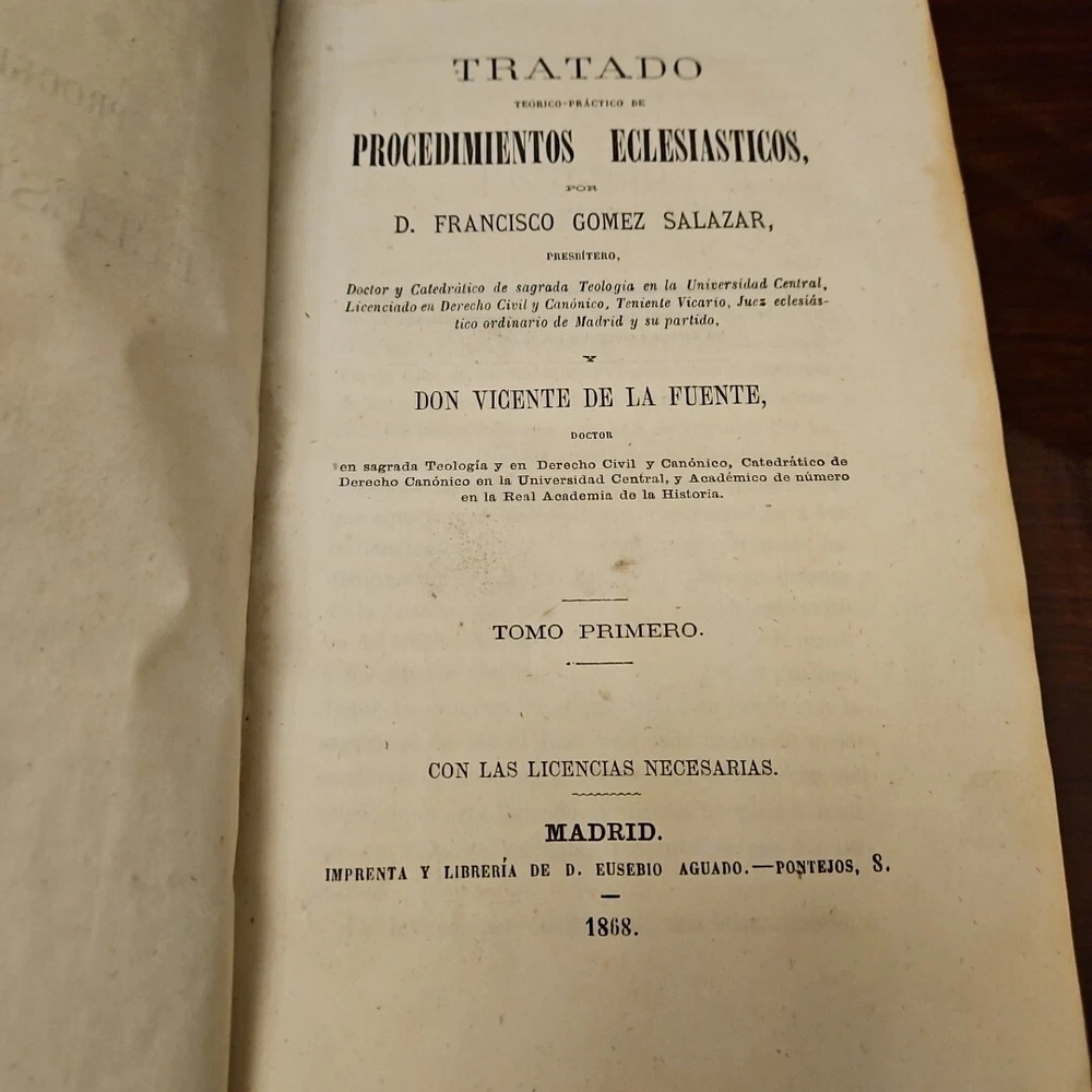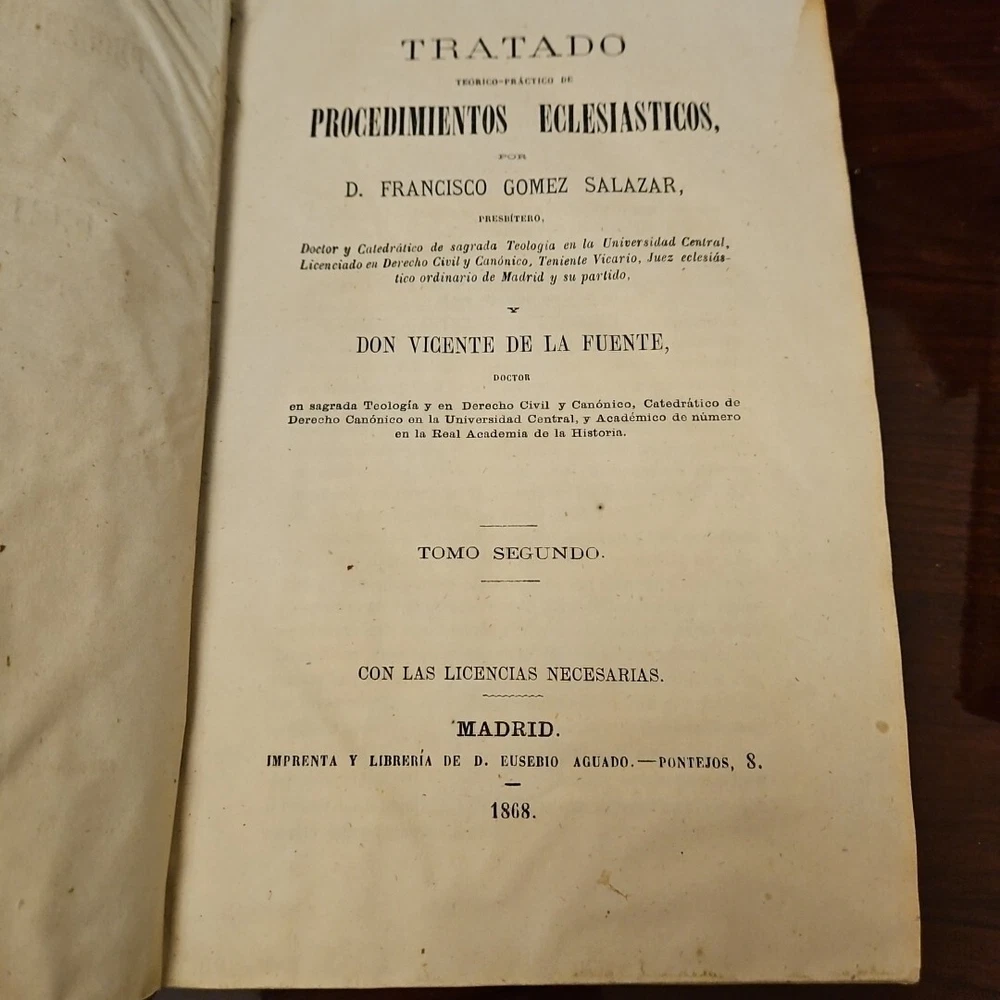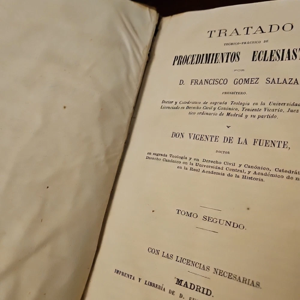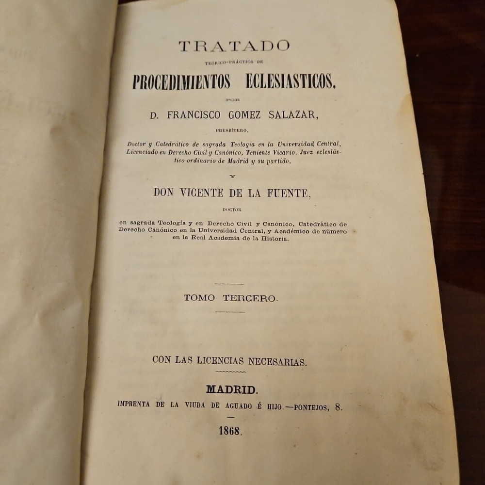 This antique books titled "Tratado téorico-Práctico de Procedimientos Eclesiástico" by D. Francisco Gomez Salazar is a collector's edition with 3 volumes. The leather bound book were printed in 1868 by Imprenta de la Viuda de Aguedo y Hijo in Madrid, Spain. The book is written in Spanish and covers topics such as devotions and meditations. The books is an original and vintage paperback with special attributes such as being numbered and having a unique binding. It belongs to the category of antiquarian and collectible books and is perfect for those interested in religious and spiritual topics. The books is a valuable addition to any collection and is a rare find for collectors. Measurements 9 x 5.75 x 1.5 measurements See pictures TRATADO TEORICO-PRÁCTICO DE PROCEDIMIENTOS ECLESIASTICOS, POR D. FRANCISCO GOMEZ SALAZAR, PRESBITERO, Doctor y Catedrático de sagrada Teologia en la Universidad Central, Licenciado en Derecho Civil y Canónico, Teniente Vicario, Juez eclesiás- tico ordinario de Madrid y su partido, Y DON VICENTE DE LA FUENTE, DOCTOR en sagrada Teologia y en Derecho Civil y Canónico, Catedrático de Derecho Canónico en la Universidad Central, y Académico de número en la Real Academia de la Historia. TOMO TERCERO. CON LAS LICENCIAS NECESARIAS. MADRID. IMPRENTA DE LA VIUDA DE AGUADO É HIJO. -PONTEJOS, 8. 1868. TREATED THEORETICAL-PRACTICAL OF ECCLESIASTICAL PROCEDURES, BY D. FRANCISCO GOMEZ SALAZAR, PRIEST, Doctor and Professor of Sacred Theology at the Central University, Graduate in Civil and Canon Law, Lieutenant Vicar, Ordinary Ecclesiastical Judge of Madrid and its district, AND MR. VICENTE DE LA FUENTE, DOCTOR in Sacred Theology and in Civil and Canon Law, Professor of Canon Law at the Central University, and Full Academician at the Royal Academy of History. VOLUME THREE. WITH THE NECESSARY LICENSES. MADRID. PRINTING PRESS OF THE WIDOW OF AGUADO AND SON. -PONTEJOS, 8. 1868.